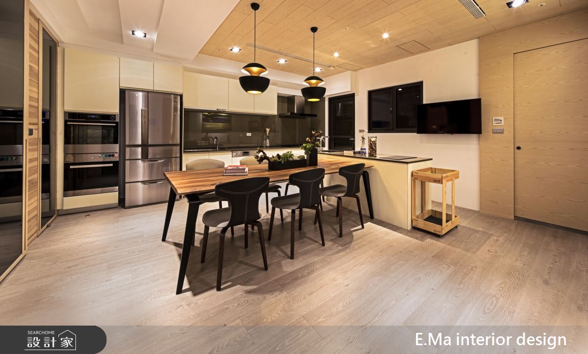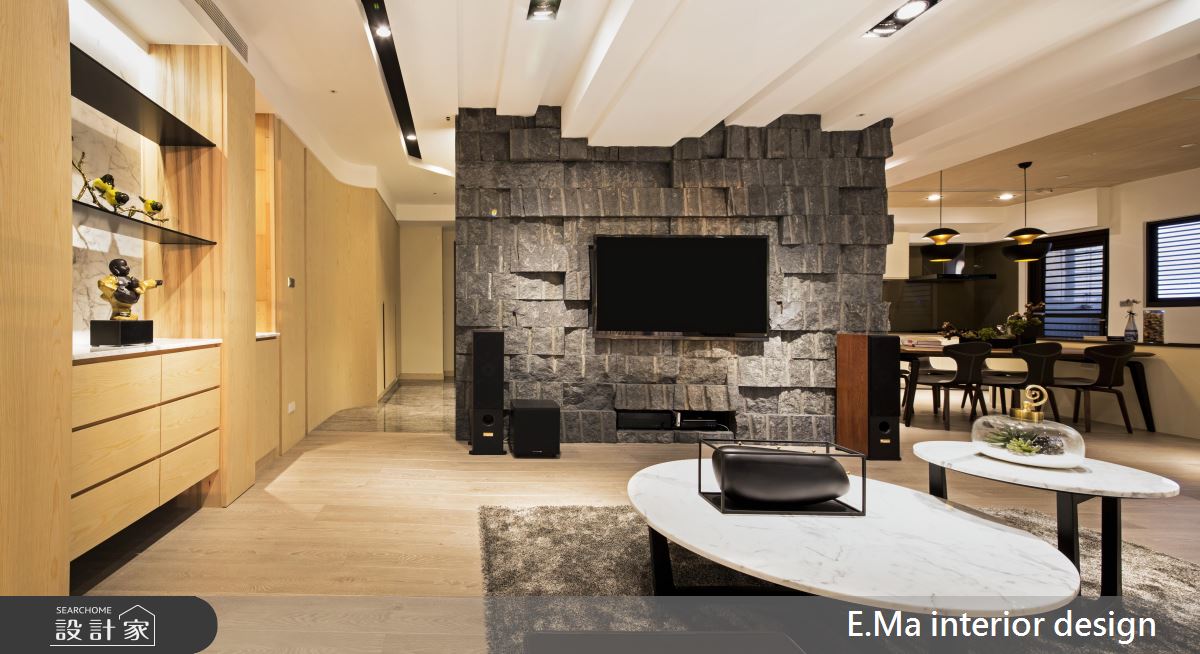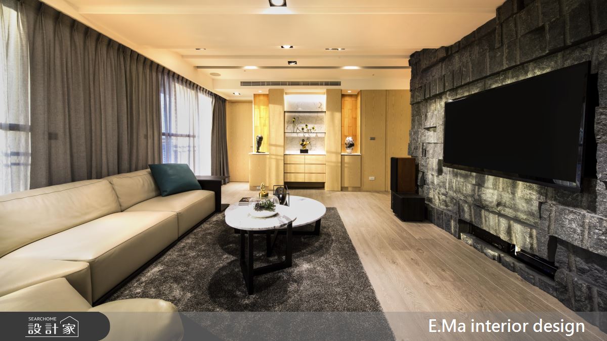 玄關處,加入 Z 字型長廊動線,並於天花加入閃電型燈條與之呼應,在轉折中增添視覺趣味;公領域內,在天花做出高度落差,修飾掉格局壓迫感,客廳電視主牆則大膽以自然石皮建構而成,拼湊粗獷的立體表情,並以此牆作為場域介質,形成回字格局,串起各區域的交流互動;餐廚區,配置加長型木桌,搭配中島及系統廚具,在高機能配置下滿足迎賓接待場景,一旁牆面則利用灰鏡及淺木皮,將多功能室及儲藏室入口加以隱藏,締造清爽俐落的視野;為營造舒適輕鬆氛圍,主臥室內,給予大量留白,並捨棄繁複櫃體規劃,在睡眠區與更衣室、主浴之間,安置了一道滑門,注入脈絡清晰的使用動線!