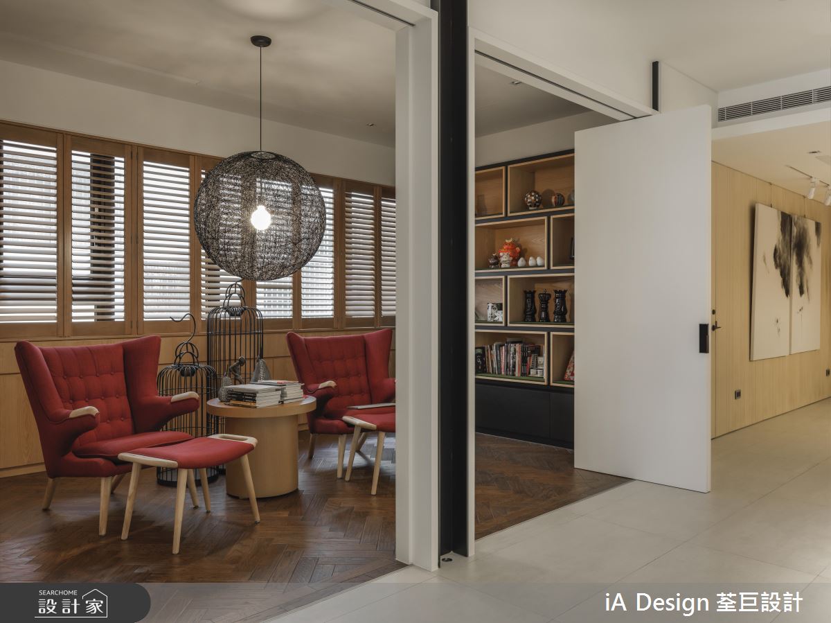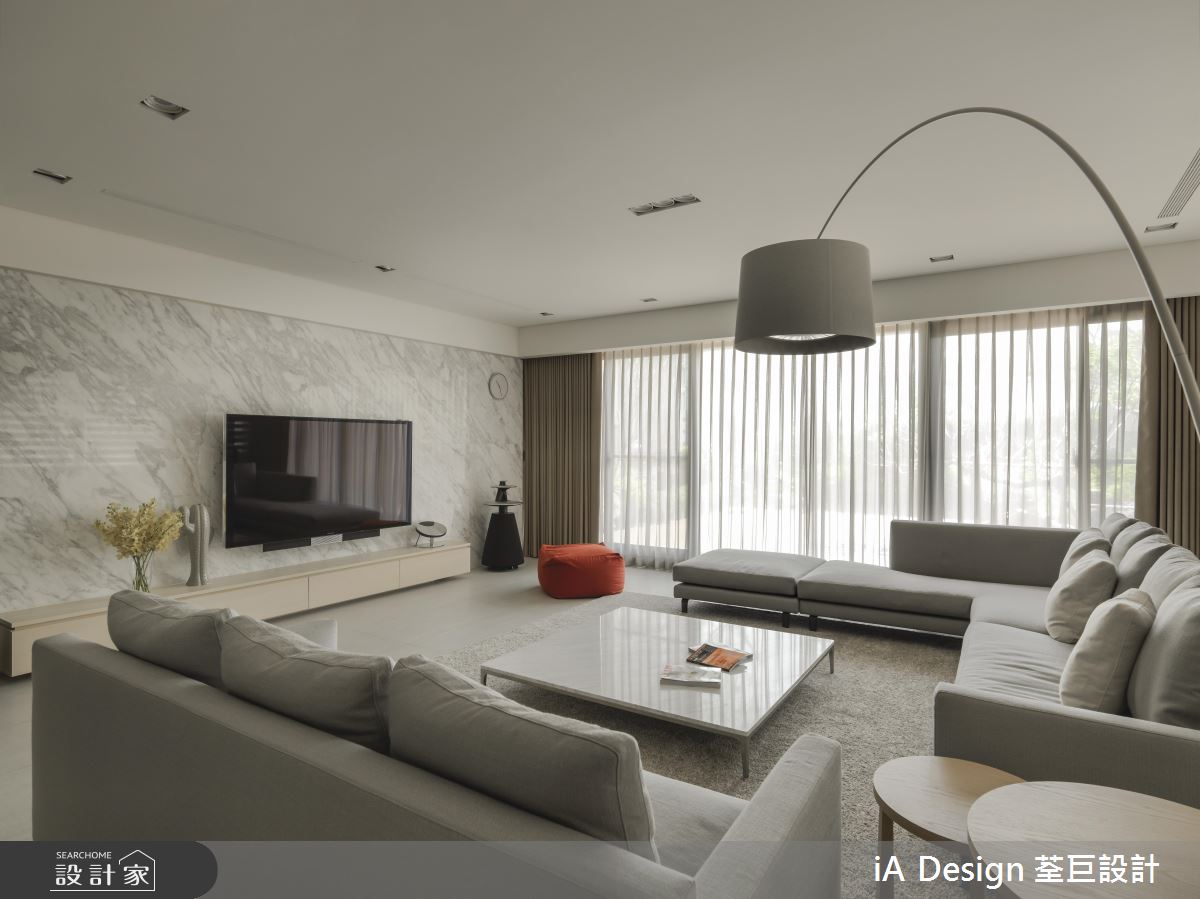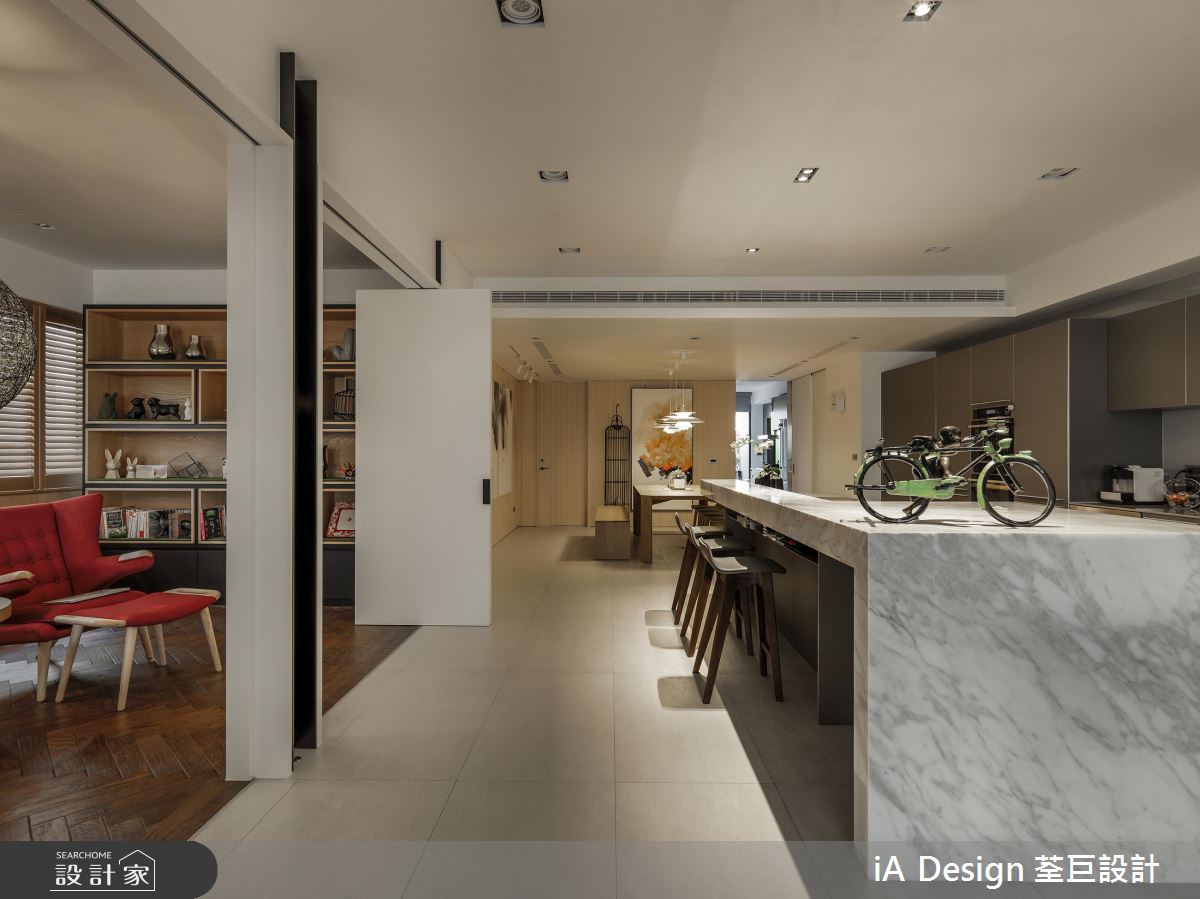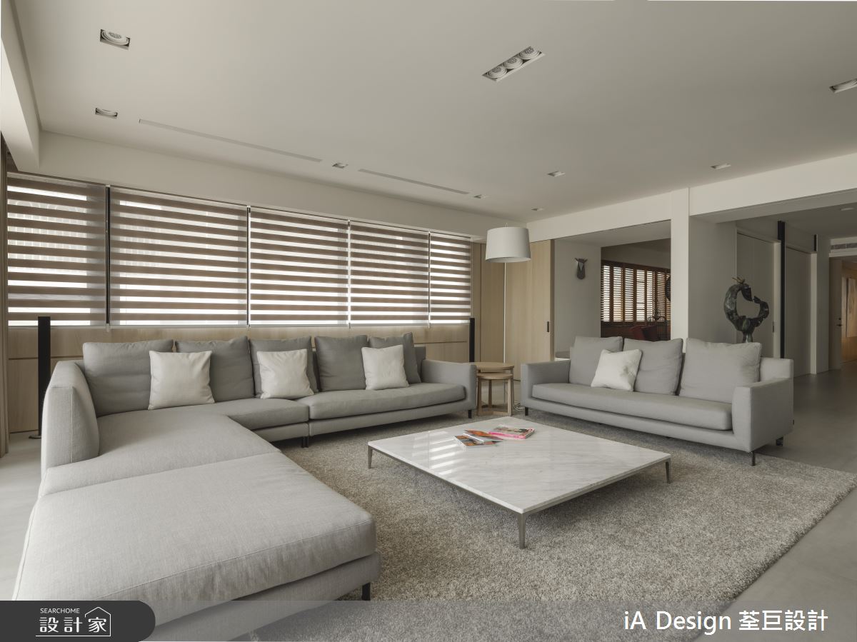 客廳運用大量淺灰貫穿全屋,並保有多面採光,成就現代居家的俐落明亮質感,同時讓四周牆面呈現簡潔風貌,簡化過度繁複的裝潢,再保留了大面開窗,一路將戶外庭院的綠意完整延攬,呈現出內外一致的適意氛圍;在空間配置及動線上,則透過加長延伸的開放式檯面,廣納更多使用空間,並刻意在吧檯旁安置多功能起居場域,採以活動拉門規劃,在不經意的手法之下,隱藏著可伸縮尺度的空間序列,透過展開或閉闔,讓起居室可能隨生活型態隨機轉換,開啟時串聯公領域、放大空間感,讓走道更顯寬闊,閉闔則維持維持隱密安靜的需求!