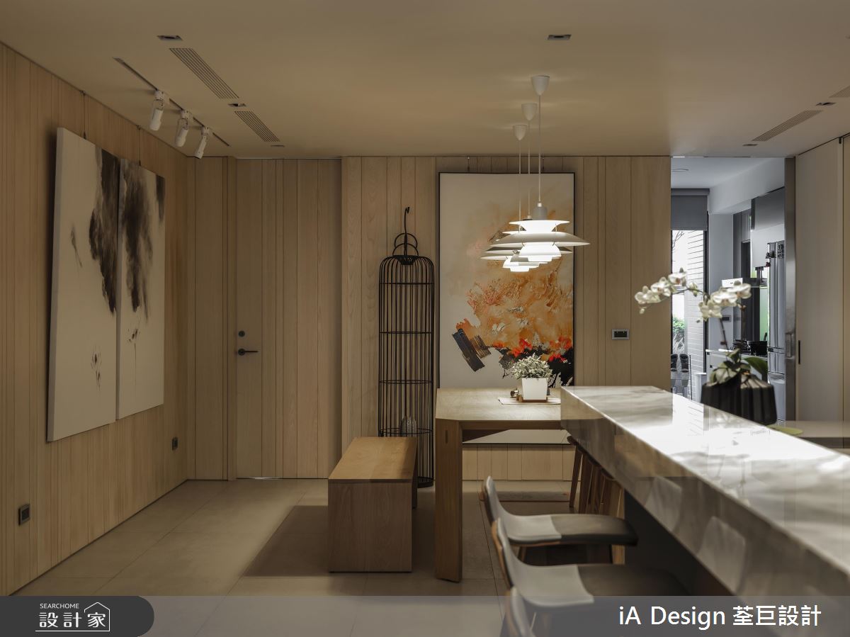 餐廳有別於客廳的俐落風景,改以純色木作背景搭配桌椅、掛畫與家飾品,自成靜謐美麗的景致!