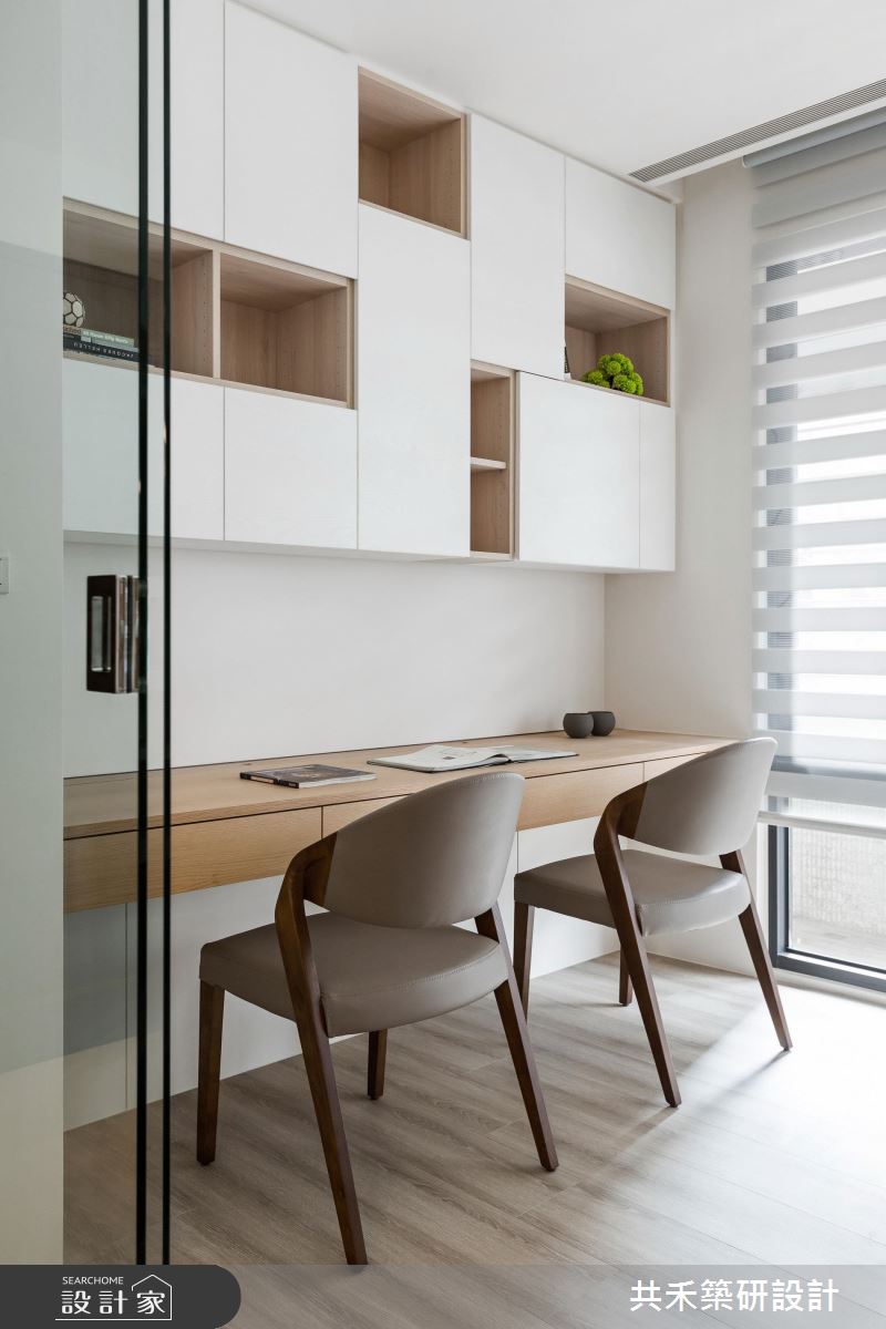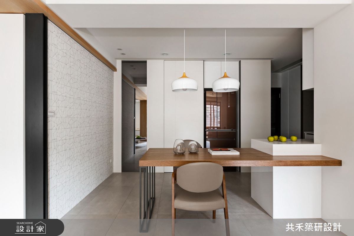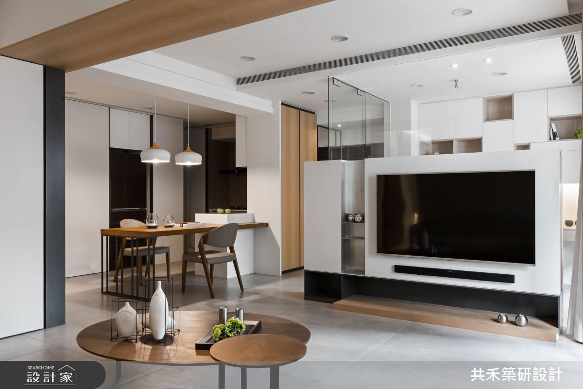 為加大室內空間視覺,公共區域採開放式設計。進門後的左手邊為書房,利用玻璃輕隔間方式,有效延伸公領域視覺,並巧妙運用電視牆背面機能,成為書房的收納空間。廚房同樣採開放式手法,利用檯面延伸設計,打造連接餐桌的小吧檯,並達到擴大用餐區域效果。陽台區採落地窗設計,為室內引入充足光線,使整體空間更顯白亮。