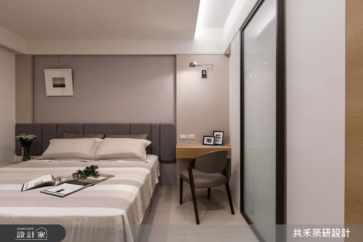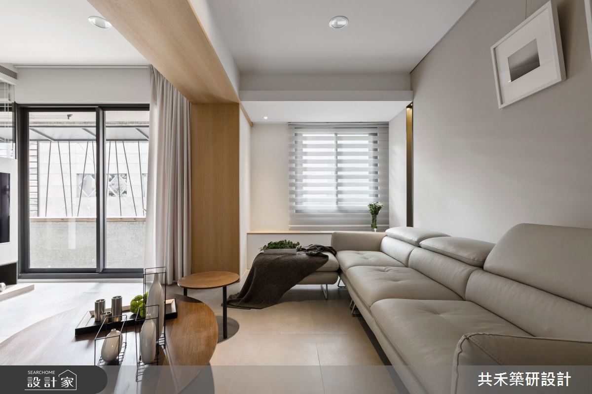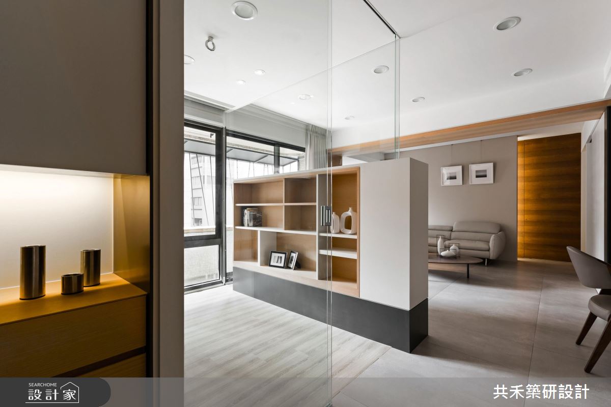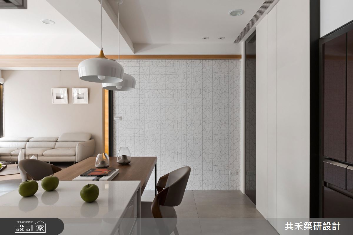 為加大室內空間視覺,公共區域採開放式設計。進門後的左手邊為書房,利用玻璃輕隔間方式,有效延伸公領域視覺,並巧妙運用電視牆背面機能,成為書房的收納空間。廚房同樣採開放式手法,利用檯面延伸設計,打造連接餐桌的小吧檯,並達到擴大用餐區域效果。陽台區採落地窗設計,為室內引入充足光線,使整體空間更顯白亮。
