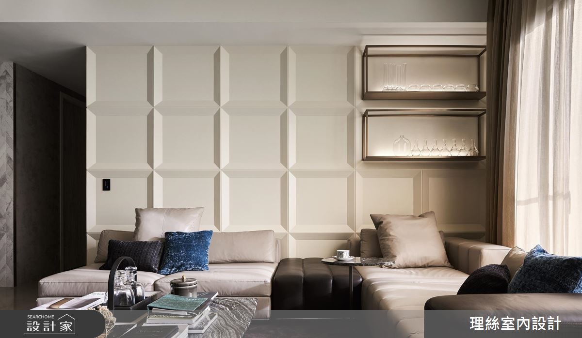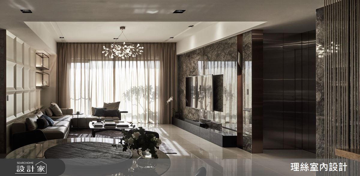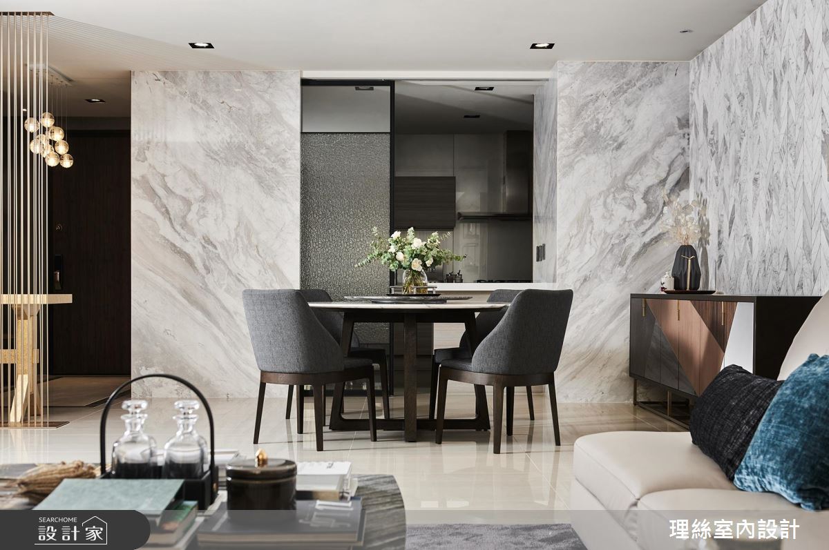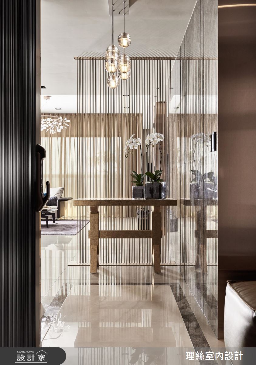 入口玄關處,設計師採用與玉石相近的磁磚作點綴,並規劃精細的金屬弦線屏風,凝聚微乎其微的視覺光澤,在隱晦之間,透漏室內石材的瑰麗脈絡;延伸入廳區,則以展開的大理石鋪陳牆面,在渾厚的石紋脈絡之下,展現歲月的生動斑斕,其中穿插不鏽鋼鍍鈦板延伸至內部作出隱藏酒櫃,搭配展示櫃羅列藝品,成為獨特的精緻角落;餐廚領域,則藉由通透拉門隔絕烹飪油煙並串聯光線,並給予開放式的餐廳規劃,凝聚開闊的互動感;主臥內,因著床頭的窗戶存在,設計彈性拉門讓背牆更具一致整體性,並同時保有通風特質,再加入金色的光燦色調,創造成熟典雅的氣質!