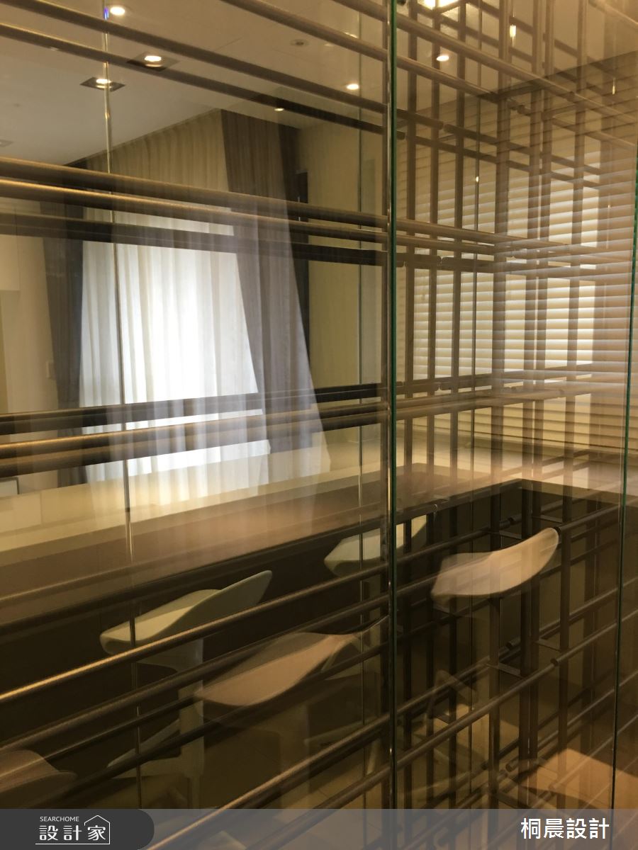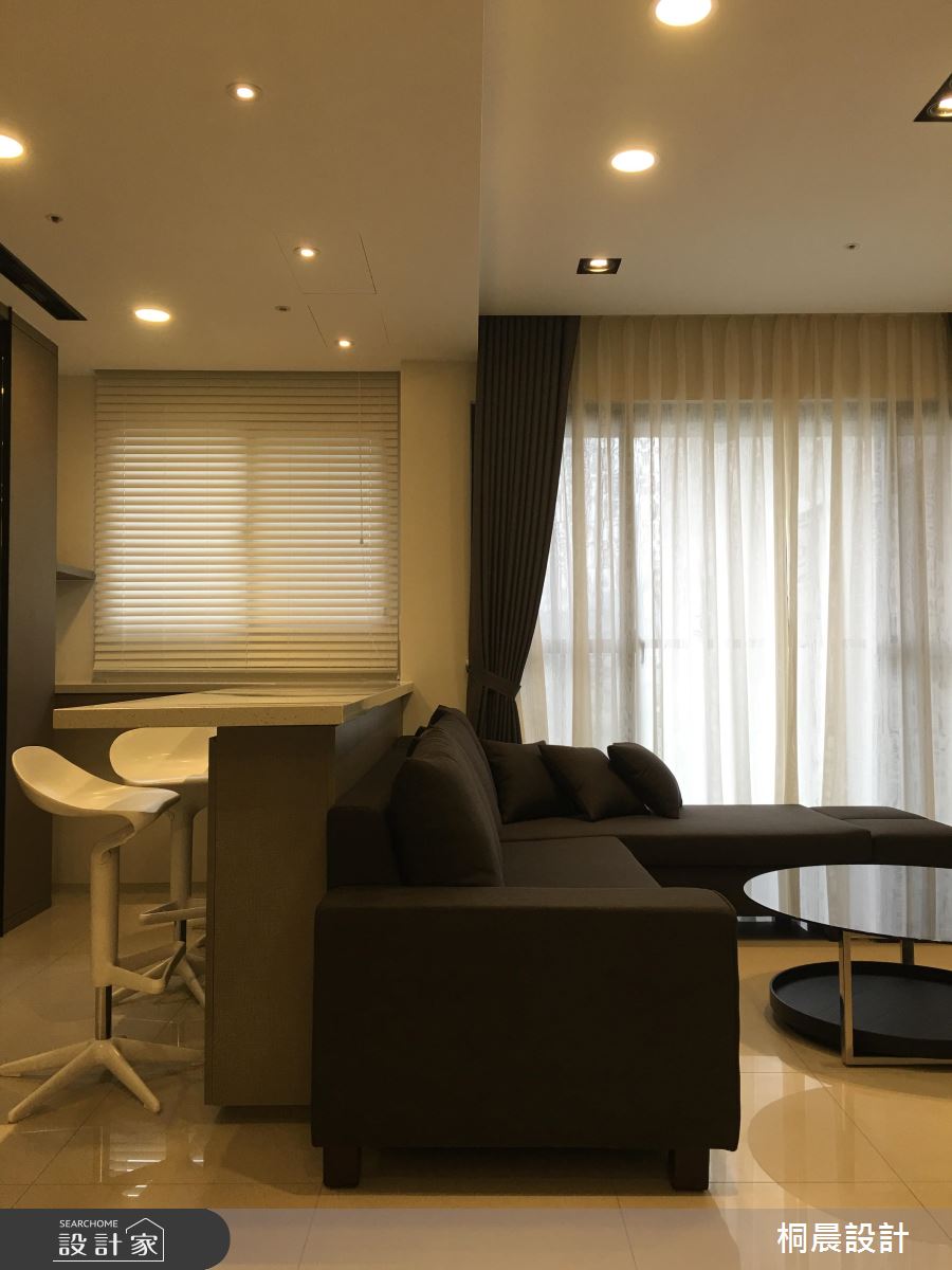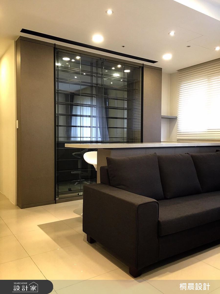 璇開大門走進室內,右側整排以白色櫃體打造鞋櫃收納,造型持續延伸至整個電視牆,上方連結實用收納,中間以深色壁面為基底,成為電視主體牆,右側連結層板造型,賦予展示機能,創造美學與實用兼備的主體;L型沙發圍塑出客廳領域,深色調的家具營造出沉穩氣息,沙發後方則為多功能休憩區,以人造石的檯面界定領域,而桌面與高腳椅以白色調的色彩做為搭配,與沙發形成強烈對比,詮釋一抹現代時尚;利用玻璃與鐵件質材打造一面精品質感的酒櫃,讓珍藏的佳釀能夠完美陳列,同時彰顯屋主非凡的品味;走進廚房空間裡,白色與深色調相互搭配,加上材質表面紋理細節與觸感,創造出簡潔、優雅的烹調環境。