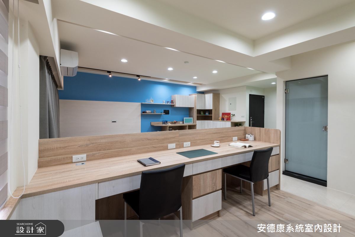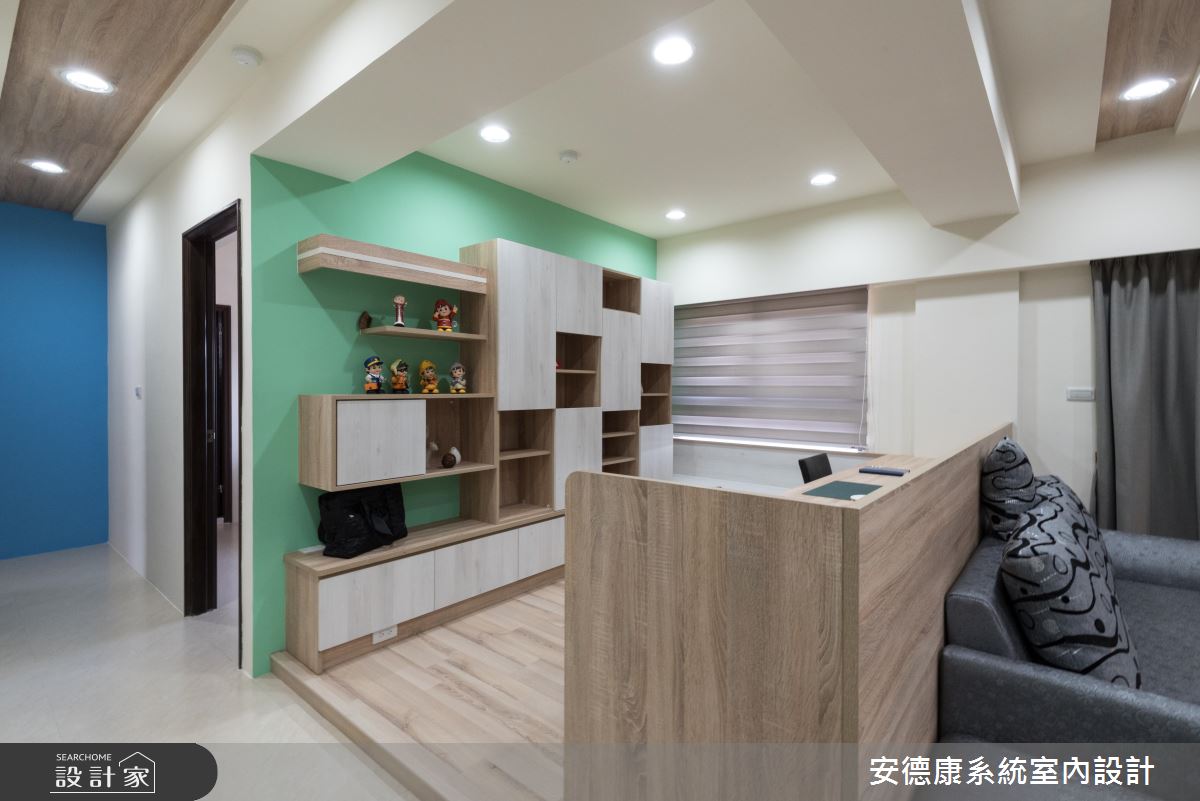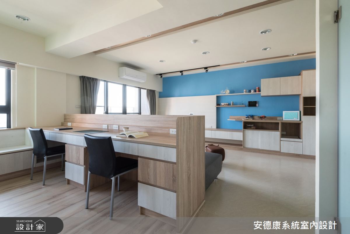 公領域裡利用白色、大量的木紋打造基底,搭配充沛的戶外暖陽,調和出溫暖、愜意的居家氣息。由於空間裡結構樑過多且較低矮,容易造成壓迫感受,因此利用木紋貼附天花板且結合嵌燈照明,創造出高低錯落的視覺變化,讓既有樑柱轉化為整體造型的一部分,自然破除結構感,而溫潤的自然質地特性,更注入溫馨感受;挑選藍色壁面成為客廳主體牆,運用懸吊櫃與層板設計的系統櫃,將電視、收納與展示功能整合為一體,比例切割與完整收納,建構出豐富的立面表情;沙發後方增設開放式書房,以綠色壁面飾底,搭佐虛實相間、不規則設計的櫃體以及層板設計,交織出錯落有致的空間節奏,豐盈視覺層次。