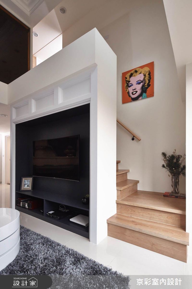 整體透過黑白對比營造色彩張力,摒棄繁複的雕琢印象,在新古典的基底之下簡化線條勾勒,彰顯寧靜與雅致,同時加入開放式的客餐佈局,以採光串起垂直動線,讓居家空間顯得挑高敞闊、明亮且舒適。客廳電視主牆以深色為底,飾以仿壁爐造型,巧妙屏蔽樓梯動線;廚房領域,在實用機能之餘,也帶入黑白的極簡設計,藉由通透的鏡面表材塑造清爽質感;主臥內,轉以柔和的暖色,在床頭鋪陳柔和的花樣壁紙,搭佐壁燈光影與美式床頭板,讓使用者可回歸舒適,感受無限放鬆!