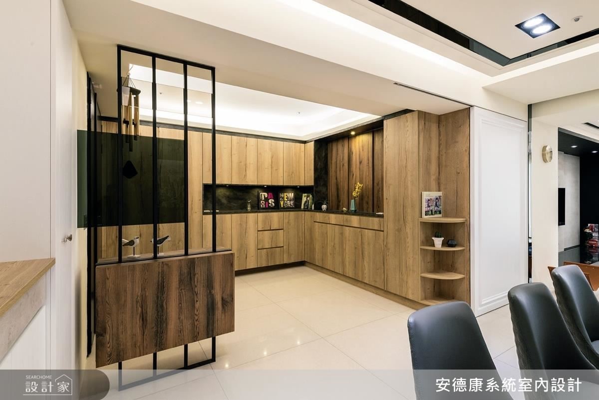 為了增加收納空間,設計師也配置了不少系統櫃體,納入隱藏式收納設計,讓屋主在機能使用上更為多元且完善。透過簡單線條與材質的鋪陳,搭配深木色系統櫃體,讓空間顯得簡約又具沉穩內斂的質感,但為了保有空間整體的明亮度,天花板採以點狀光源搭配光帶設計,採光顯得較為柔和,同時也與拋光磚地板相互反射呼應,輔以黑鏡與鐵件勾勒邊框,增加了空間層次與線條感。
