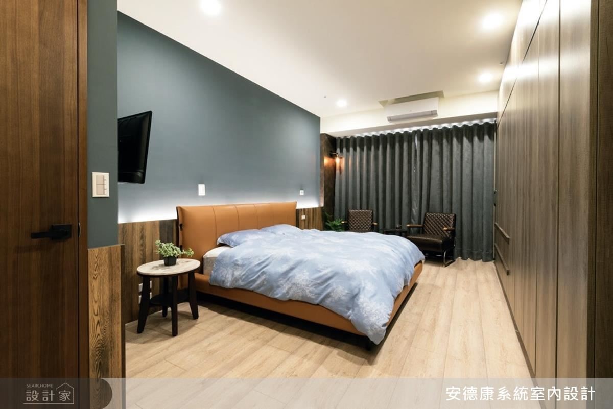 進入臥室空間,同樣延續一貫現代簡約的氛圍,以沉穩灰色調主題牆,搭配深木色的櫃體與木牆板,圍塑素雅寧靜的舒眠環境,擺放上屋主鍾愛的杰倫椅,在這沉澱身心的私密空間,也能嗅出屋主獨有的生活品味。