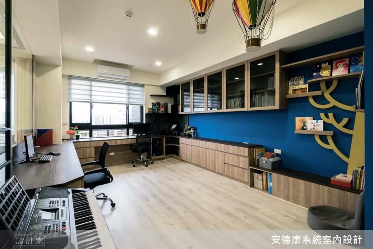 以簡約的設計作出發,解決問題也滿足需求,開放式的客餐廳公領域空間,搭配以玻璃拉門作為隔間的書房設計,放大整體空間比例外,也發揮坪數最大效益。玻璃書房的設計,一來讓空間有更好的規劃運用,二來在玻璃通透下,視覺更顯寬敞明亮。書房空間融入童趣手法做鋪排,主視覺紳士藍牆面,型塑一棵大樹作為層板的主架來擺放童書,加上熱氣球吊飾的點綴,在簡約的空間裡,營造出一塊凝聚親子互動活潑溫馨的場域,讓屋主一家人生活中有更多交流。