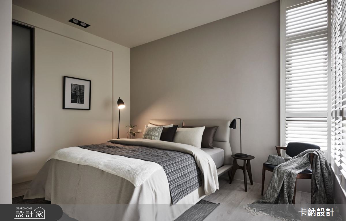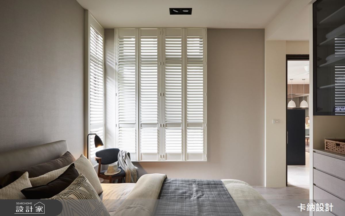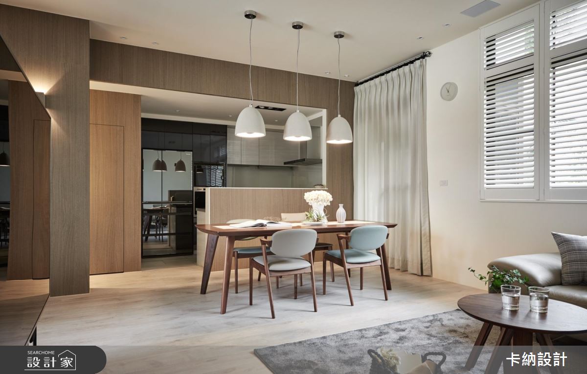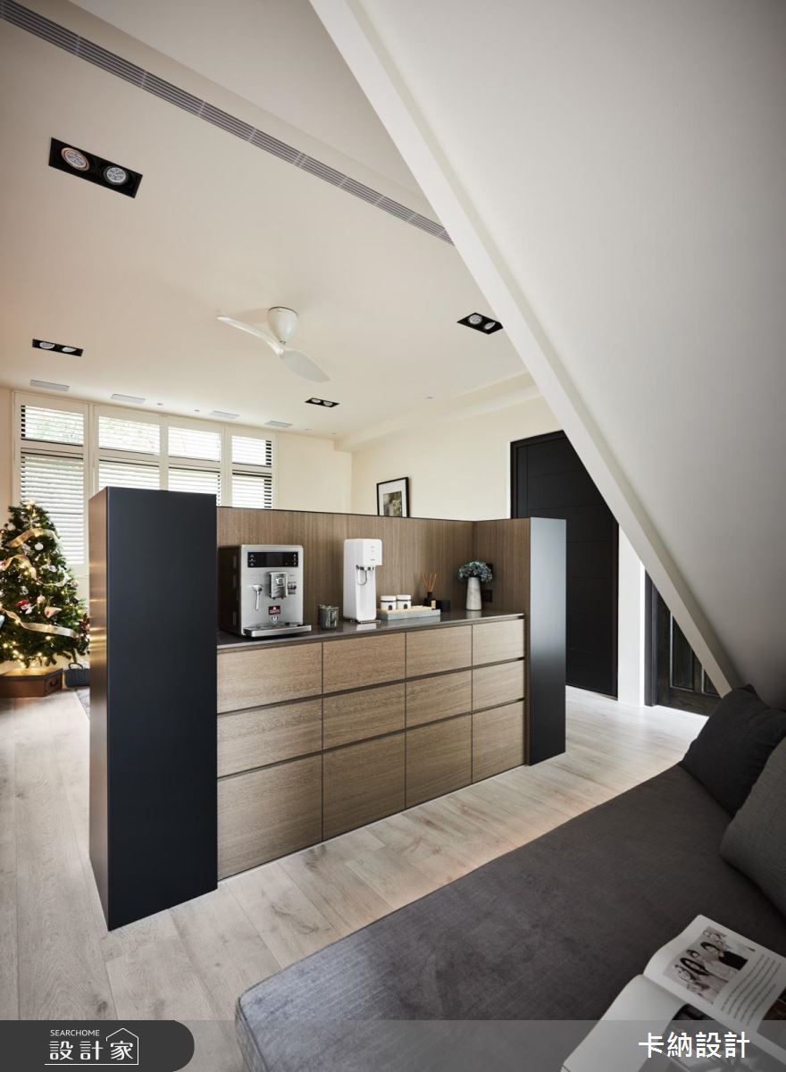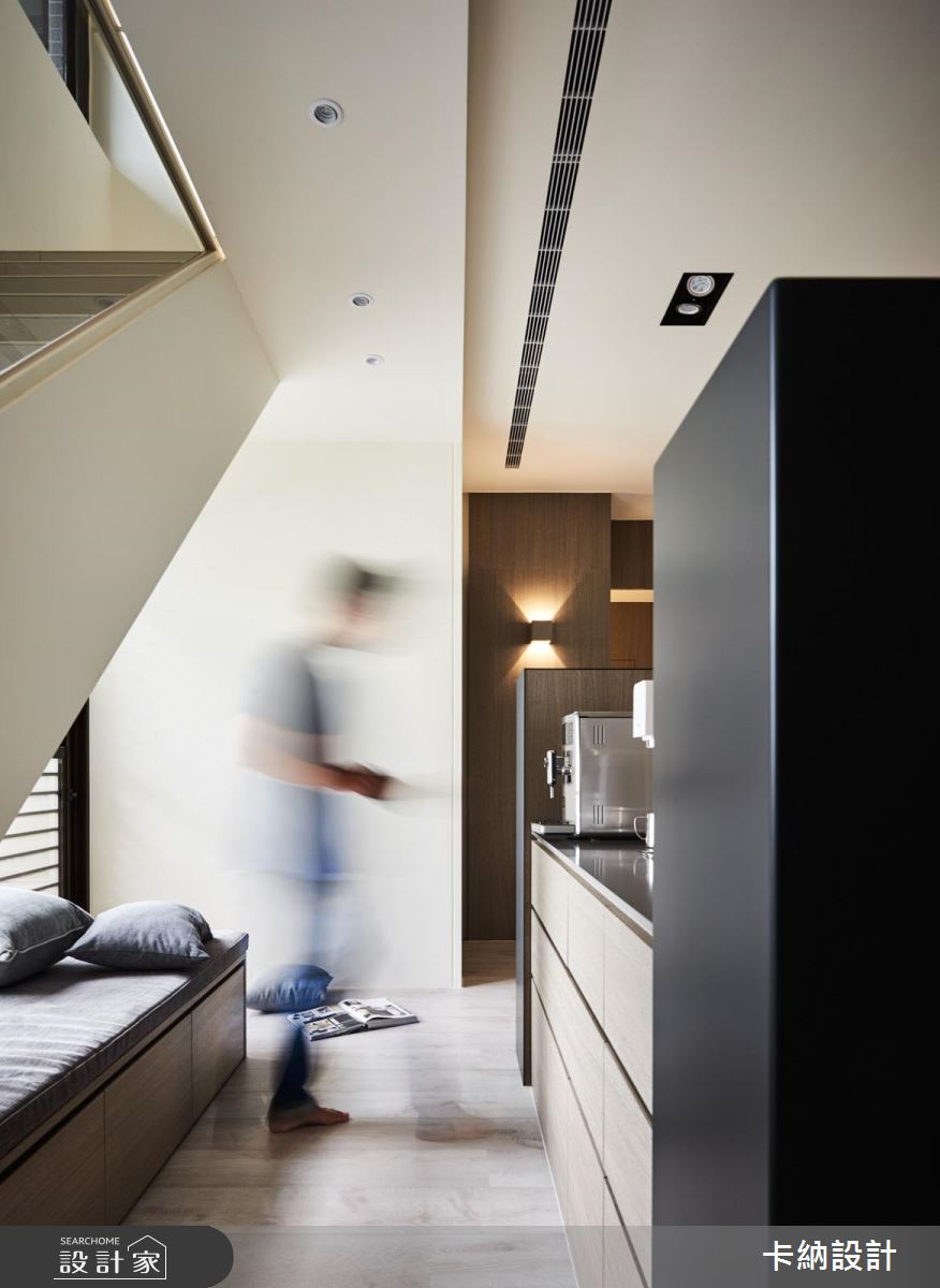 客廳到樓梯之間打造了一座雙面牆,面向客廳處為電視牆,且於下方嵌入收納機能,型塑俐落、時尚的整體造型,背面作為收納櫃,形成微型的休閒咖啡吧,同時也善用梯下空間打造臥榻,讓人在午茶時光可邊品嘗咖啡、邊欣賞窗外風光;原本的L型廚房,則微調成ㄇ字型,並增加電器櫃機能,降低中島檯面高度,讓屋主在烹調時,可隨時抬頭與餐桌使用者上形成視線交流,讓家人的互動更凝聚;主臥,一改原先擁擠的配置,於門口打造一處小玄關,讓動線做出轉折,床尾則打造更衣室,使室內坪效更充分被運用!