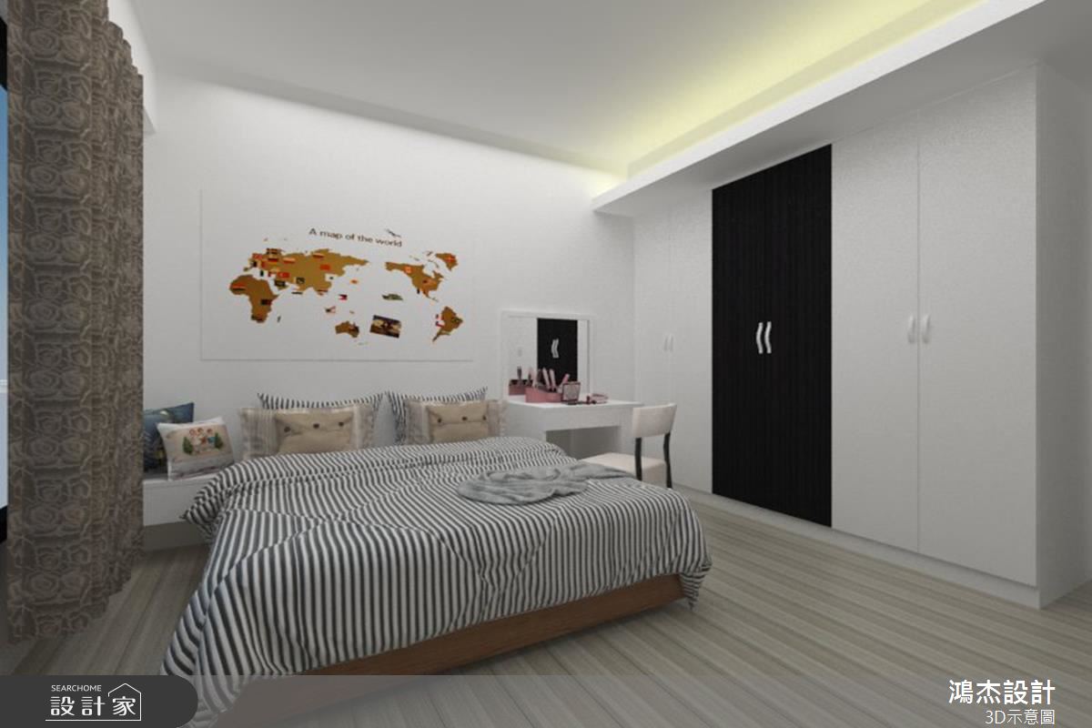 開放式格局的客、餐廳,因著無隔間規劃而彼此串聯,展現簡約分明的美學表情,整體以大面積白色延伸,讓視野充滿一致感,並顯得空間放大與輕盈無壓,再加入局部黑色凸顯立體框架,藉由黑白對比營造層次感,而電視牆則鋪陳文化石材,透過質樸手感和緩理性氛圍,導入自然和諧的況味;書房,則轉換為溫潤木地板,部分隔間採用通透玻璃,讓光線可自然穿透,增加視線互動感,並配置門簾界定區域,保留隱私性與空間彈性!