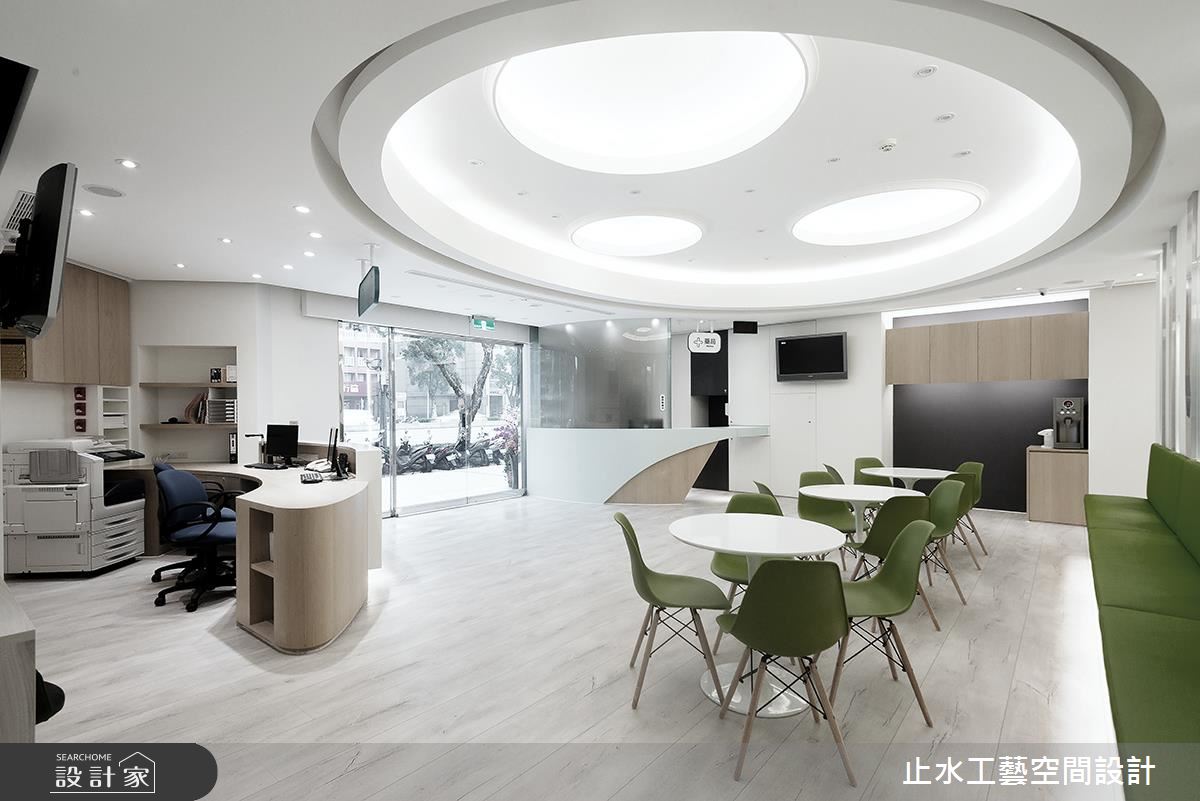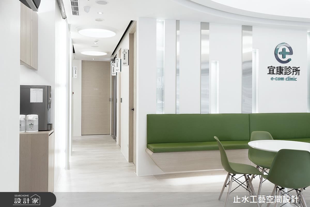 空間以白色為主調,從接待大廳開始,即可見方正大器的架構,並讓櫃檯量體呈現流線輪廓,增加視覺輕柔感,天花則採用圓頂挑高造型,配合燈光的明亮照射,開啟寬闊敞亮的入門印象,地板使用淺色木紋大面積鋪展,讓空間雖明亮卻不致冰冷,流露溫煦的舒適暖度,給予患者如住家一般的放鬆氛圍;而居中的候診座位,刻意以鮮明的綠色聚焦視覺,背牆加入穿透式的透空處理,點亮生動溫馨的氛圍,令人忘卻候診時的不安感受;診間則承襲一脈的白色,並安排每一道看診程序,擘劃流暢動線,顯現專業清晰的醫療機能!