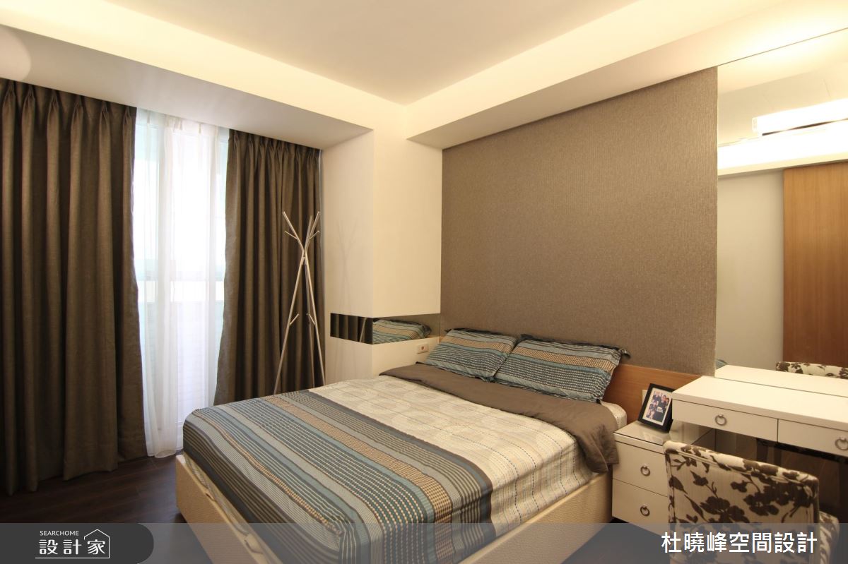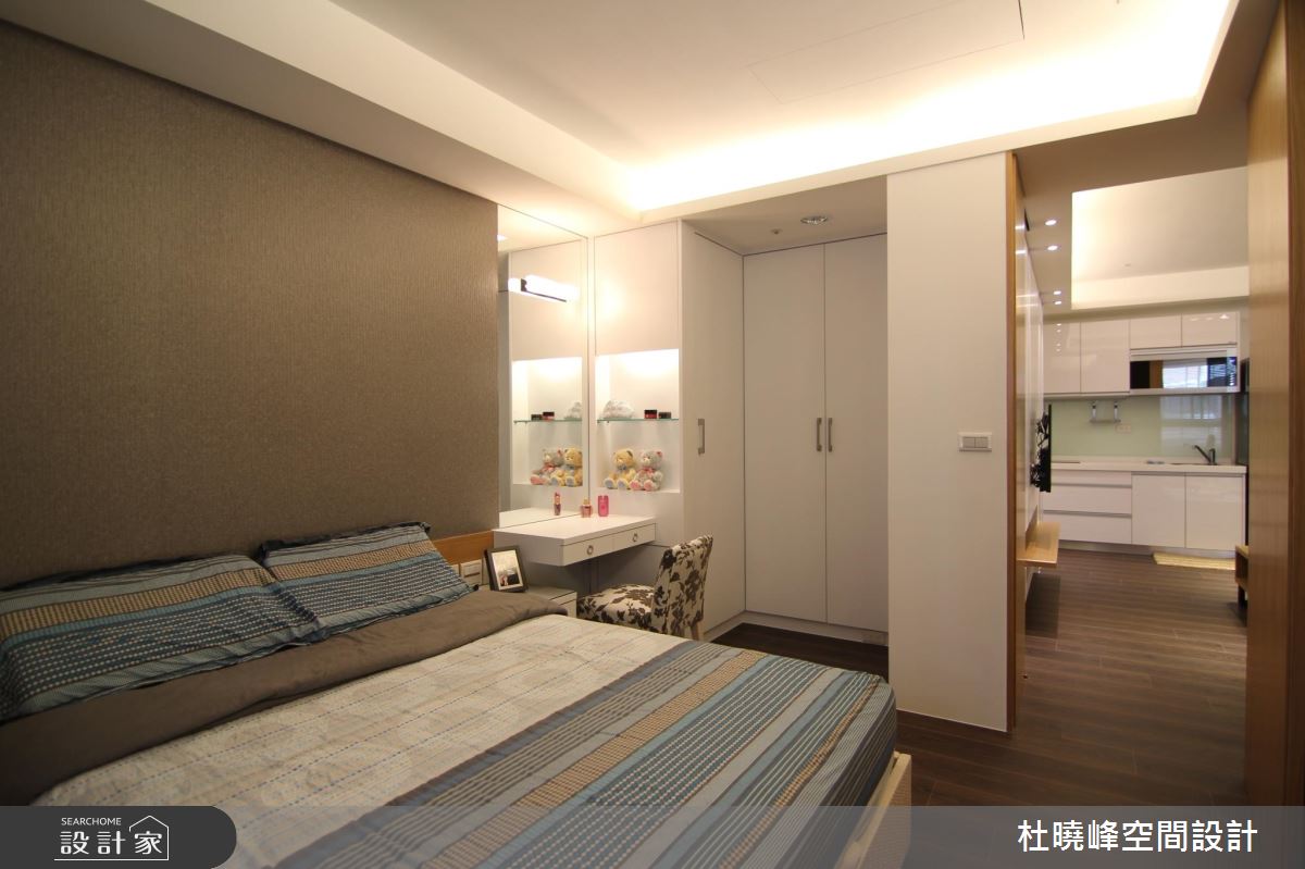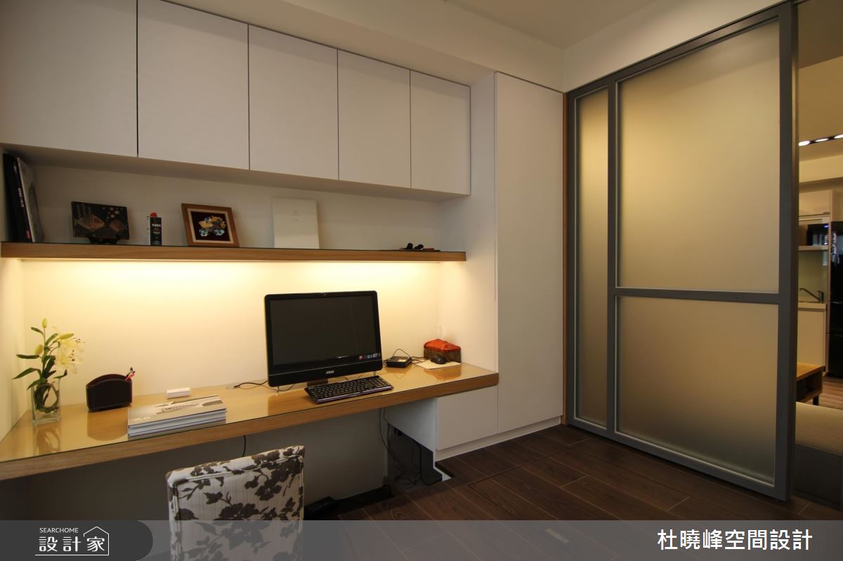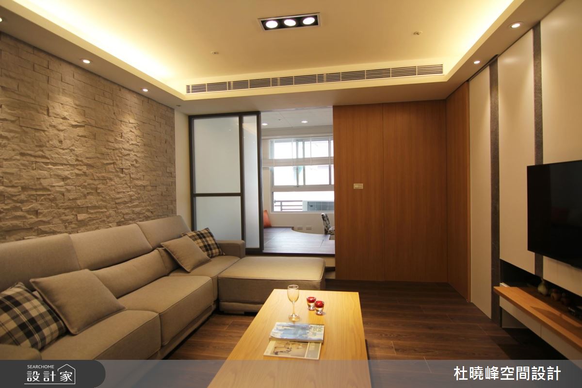 玄關區的鞋櫃以騰空方式設計,替坪數不大的空間營造輕盈無壓的感受;客廳裡以文化石作為背牆,簡單的L型沙發,木作茶几圍塑出核心領域,傳遞簡約、自在的人文特質;大量白色為底的電視牆上,藉由礦石薄片的妝點,賦予自然的生命力,同時營造出視覺層次感;以玻璃拉門界定出和室質感的書房與多功能區,除了書桌的設計,在架高的木地板上可進行休閒活動或是接待到訪親友休憩,都是非常貼心的空間設計,而玻璃門片開啟時,還能同時將戶外的自然光接引至客廳區,提升整體的視覺明亮度;電視牆的一旁為深色木作隱藏門,內部規劃主臥室領域,空間裡善用畸零空間打造衣櫃收納,剛好銜接化妝桌,將小坪數發揮到最大。