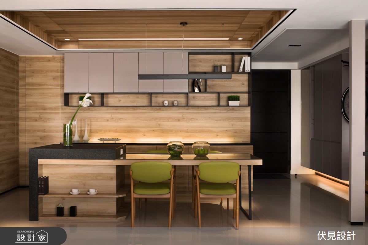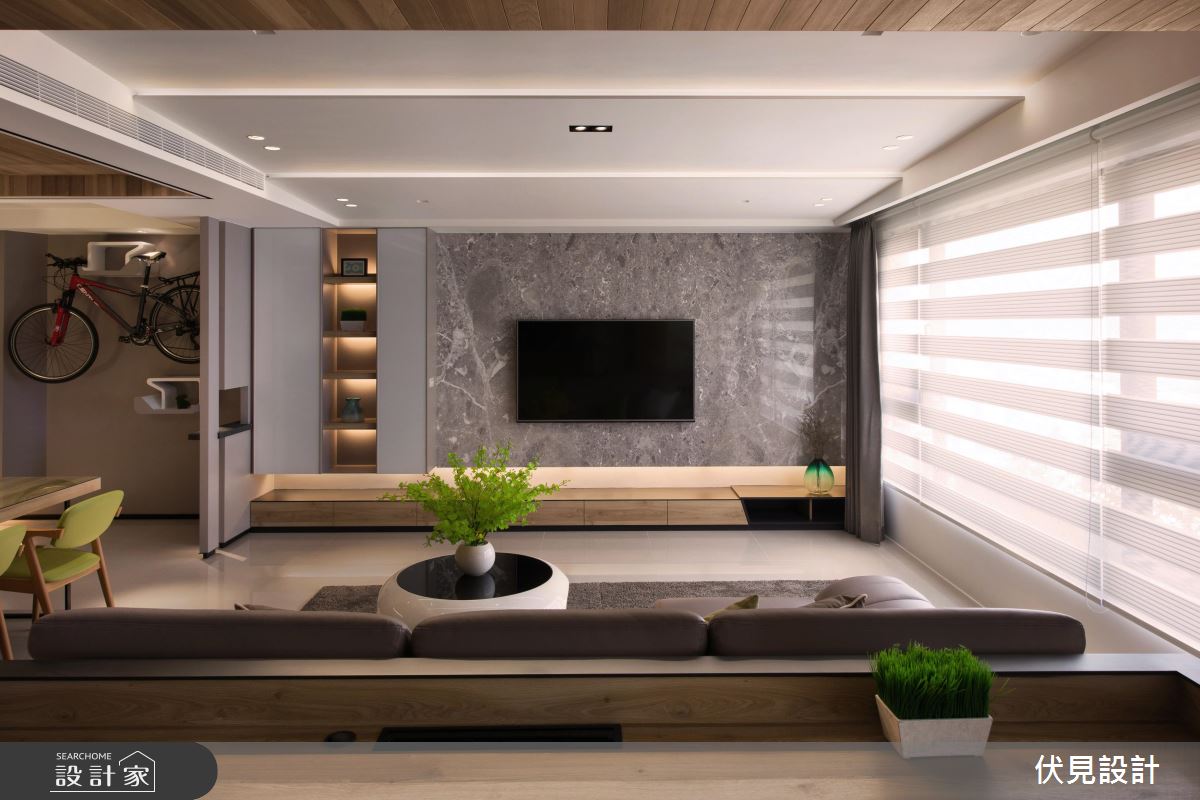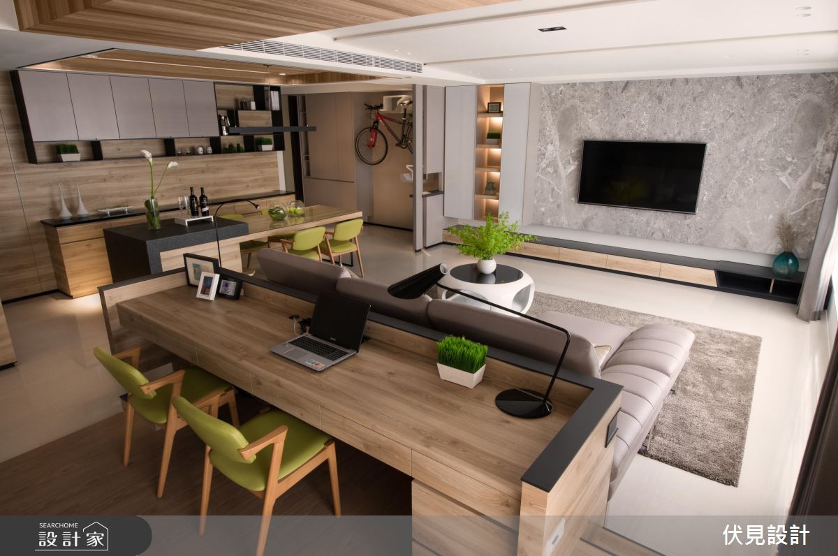 首先入門看到玄關收納櫃後方設置的腳踏車架,除動線規劃流暢方便使用者拿取,同時兼具牆面裝飾效果。客餐廳及閱覽區皆採開放式手法,並運用木質佐以鐵件,搭配色系相同家具,串聯生活空間。客廳區電視牆採用大理石材,與其他大面積木質牆面做區隔,將客廳獨立於公領域區塊。而餐桌與中島吧檯相連結,延伸了用餐範圍。另外,設計師善用燈光設計,賦予空間更多線條,並運用間接照明使室內光線柔和且多層次。百葉窗簾的選用,同樣呼應室內線條感,視覺感受俐落分明。