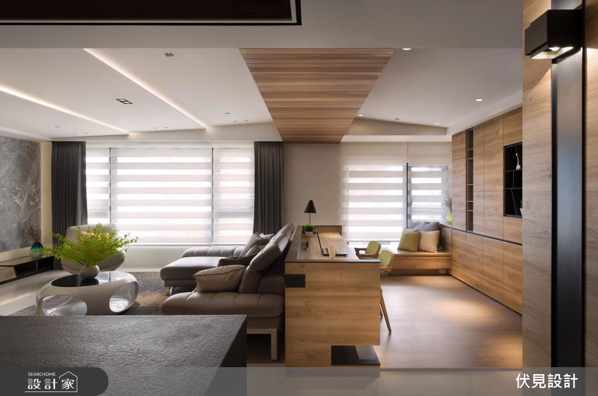 書房內書桌板與臥榻一體成形,利用高低落差設計使書桌與臥鋪相連一體卻擁有不同使用機能。除節省空間,也延伸了書桌及臥榻使用範圍。