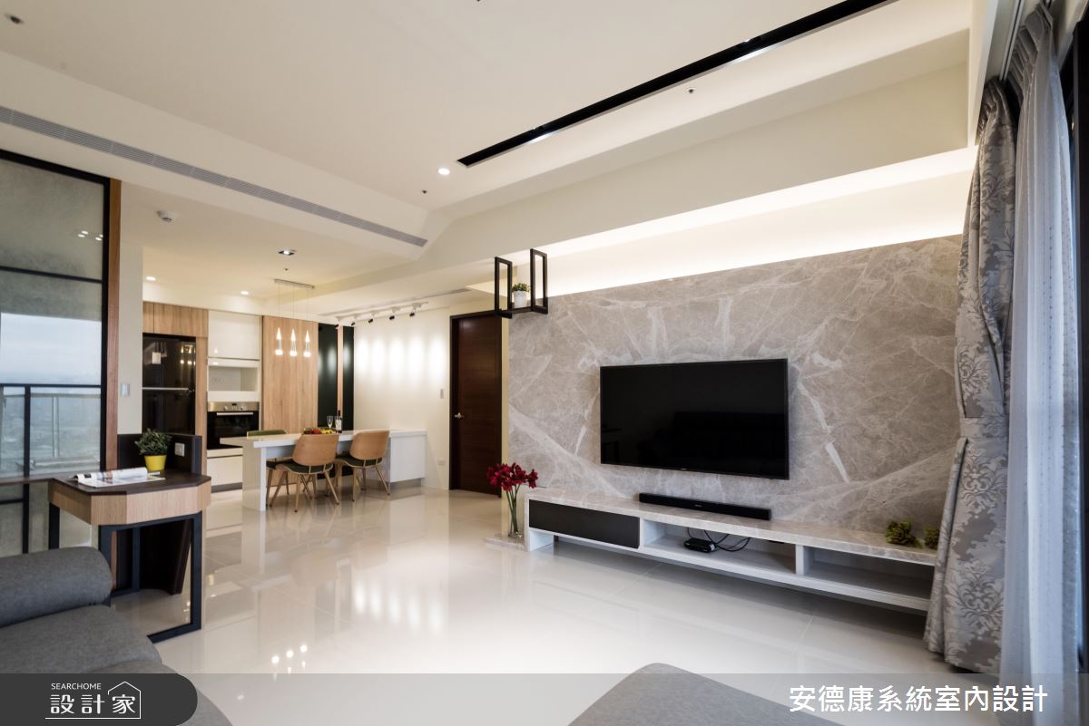 打開大門走進室內,玄關的天花板以木紋肌裡拉高層次,米色調大理石鋪陳的地板,搭配淺色木紋的鞋櫃、結合美學陳列機能的櫃體,醞釀一股家的溫馨氣息,而玻璃、鐵件與木作打造的屏風,界定出內外領域,自然圍塑出玄關區。考量男屋主需要臨時處理公事的地方,在面向客廳處、延著屏風結構圍出一張辦公桌,接續木作與鐵件的設計語彙,將機能與造型完美相容;客廳裡,大面落地窗將城市的美景一覽無遺,同時引入充沛的自然光源,照亮室內空間,映照在淺色紋理的大理石電視牆,烘托出細膩紋理與色澤,彰顯大器之姿,而電視牆上方特別增設鐵件展示區,隨著植栽或風格物件的替換,隨之轉換日常風景,每天都能創造不一樣的心情;餐廳擁有位置獨立的優勢,中島型餐桌搭配木作設計感的椅子,結合天花板幾盞照明,替用餐環境增添溫馨情誼。