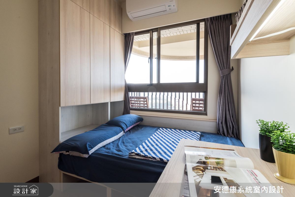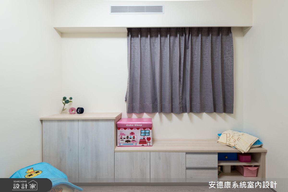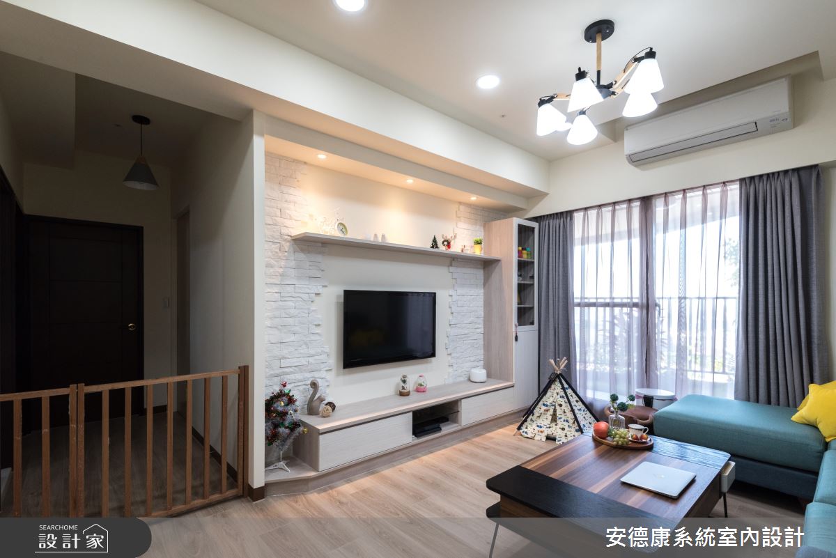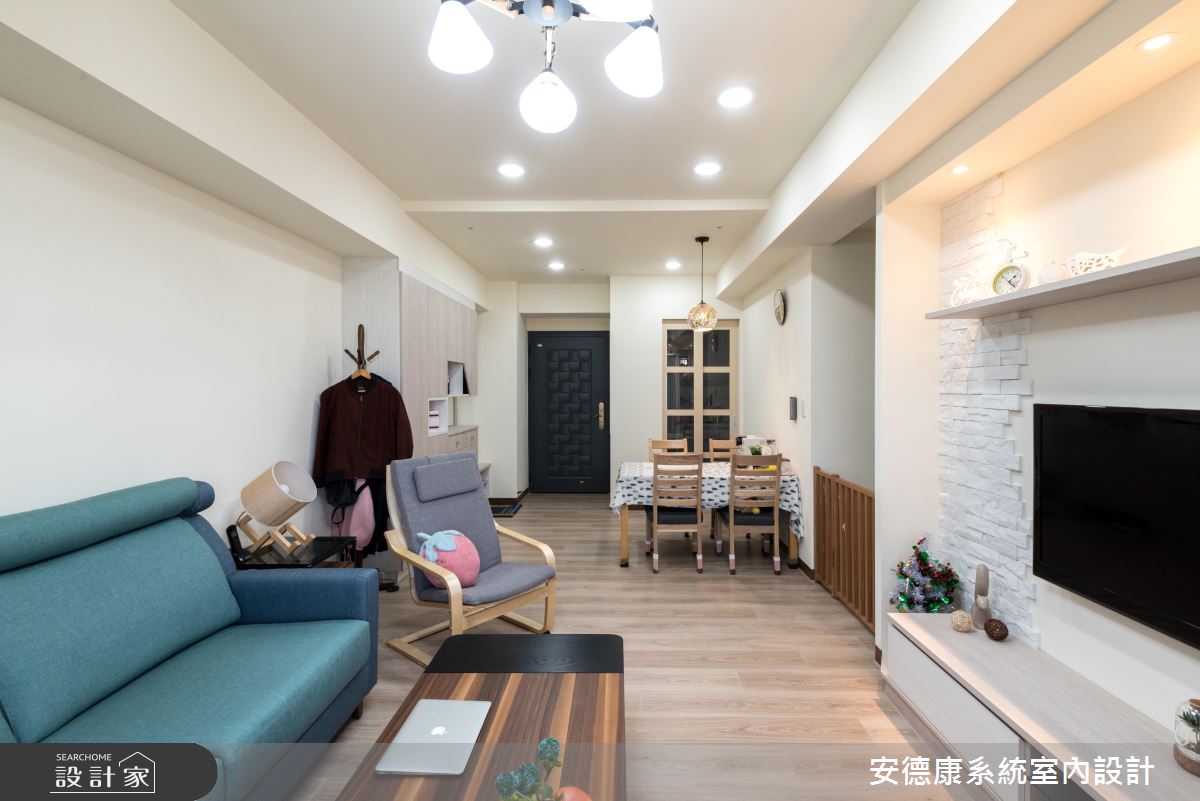 原格局為 2 房 1 廳,考量到未來小孩等因素,因此將原本其中1廳隔出多功能客房兼書房,而另一空間設計成可睡、爬行、遊戲等區域,以便未來靈活運用。屋主期望的新婚宅具有北歐風的簡約及美式休閒的隨興,因此設計師以系統板材將線條簡化、運用文化石牆帶出客廳亮點,並利用高彩度軟件增加居家色彩。公私領域皆運用大量暖木元素,為新婚宅注入療癒溫暖氣息。另外,客、餐廳通往房間的走道加裝柵欄,以防愛犬走失。
