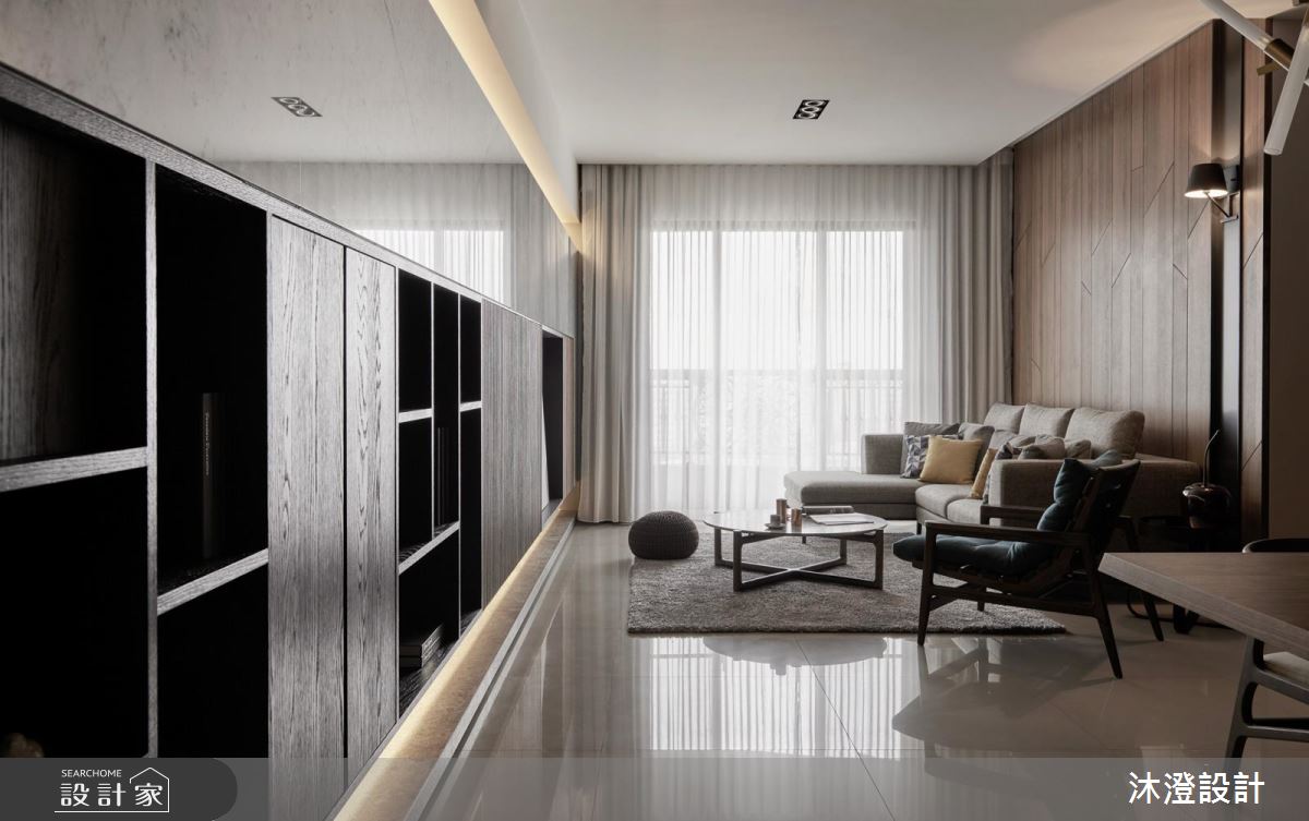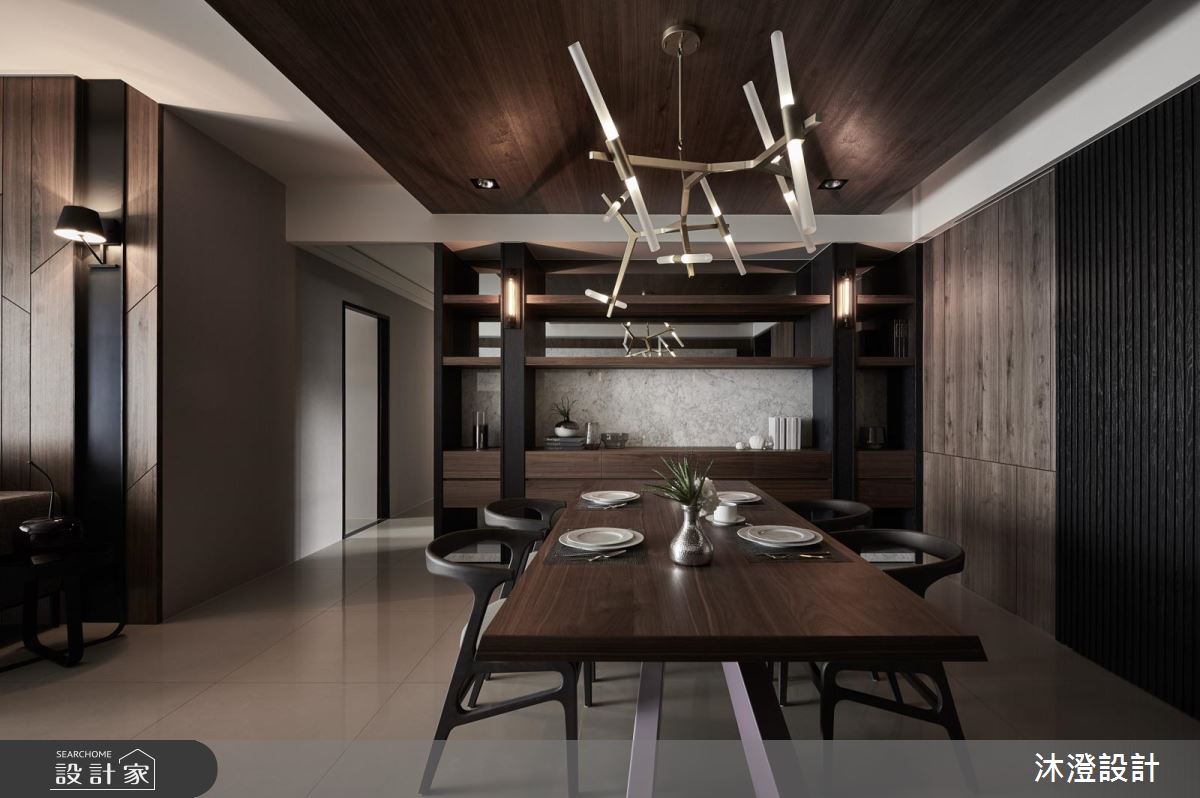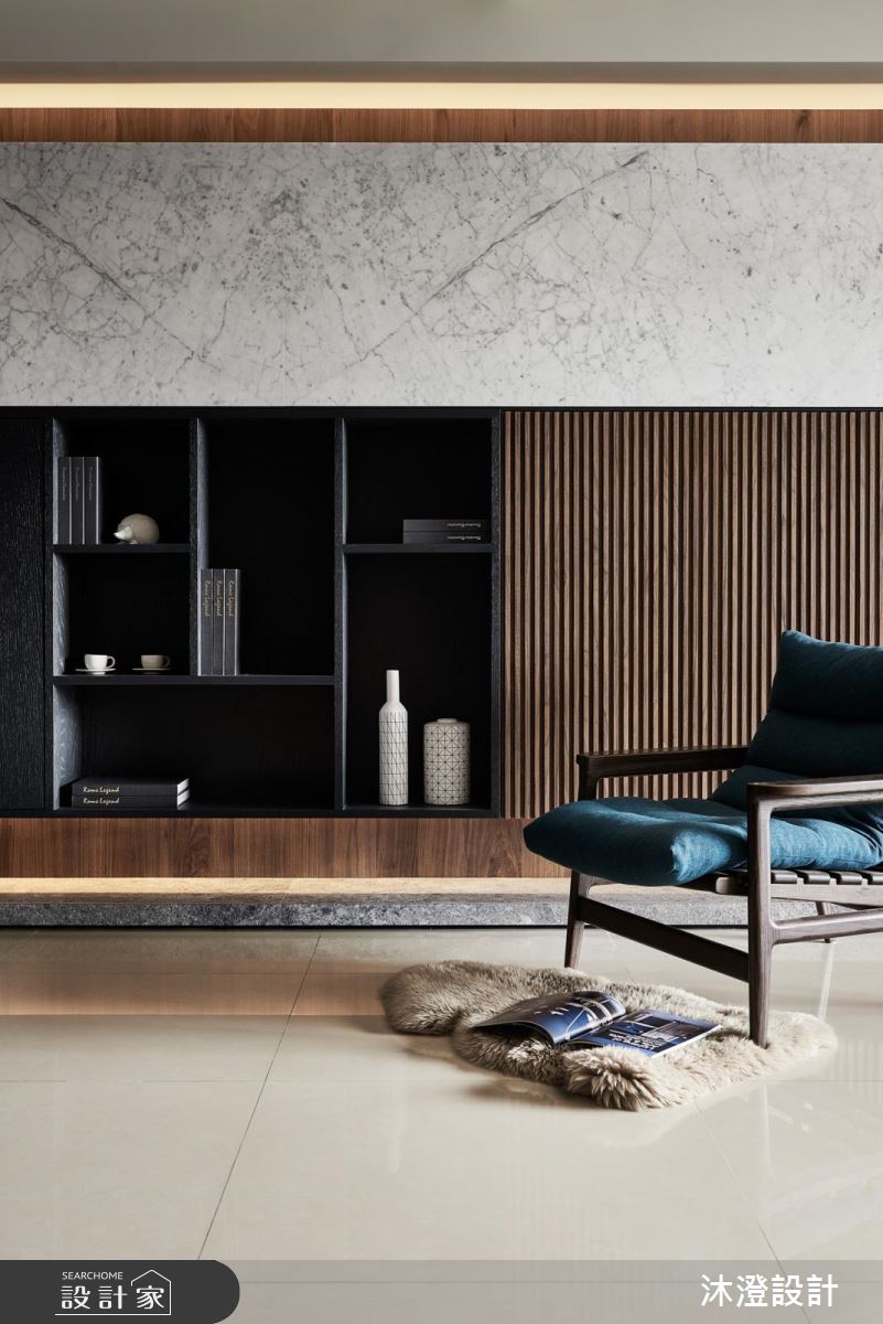 玄關入室後,以大理石與木作收納打造的牆面延伸至鄰近陽台處,視覺一路延伸至客廳,僅透過一道牆壁便將展示、收納與電視機能串連,施展設計功力!開放的公領域裡,大量的深色系作為配色核心,醞釀沉穩、安心的居家氛圍;鐵件層板刻劃出展示空間,讓屋主收藏的杯盤器皿、藝術物件有了陳設區,創造日常美學風景,傳遞濃濃的人文美學;沙發背牆則以木紋拼接,斜線溝縫刻劃出漸層視覺,側邊利用鐵件拉出深度,上方並以俐落感的歐風壁燈裝飾,流露出雅緻氣息;餐廳區讓深色木皮鋪陳天花板,原木餐桌搭佐黑色餐桌椅,壁面則利用深色隔柵、木皮鋪敘,調合出內斂、溫暖的用餐氛圍,再搭佐垂掛線條感的燈飾、鐵件勾勒的立面線條,詮釋出現代風的豐富神情。