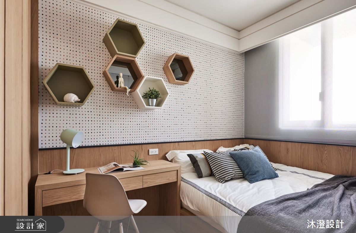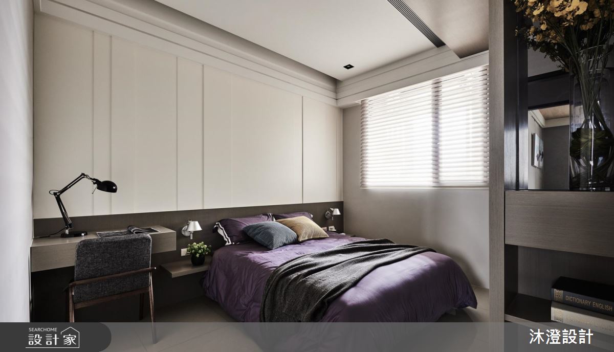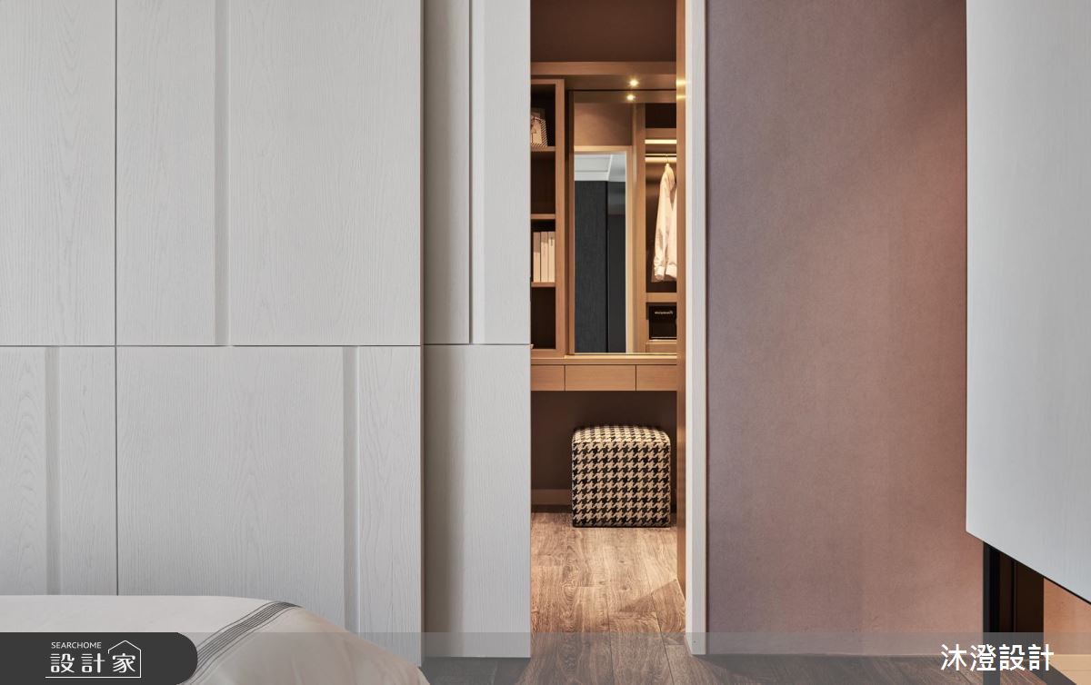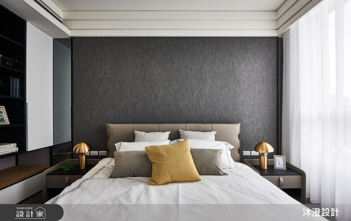 玄關入室後,以大理石與木作收納打造的牆面延伸至鄰近陽台處,視覺一路延伸至客廳,僅透過一道牆壁便將展示、收納與電視機能串連,施展設計功力!開放的公領域裡,大量的深色系作為配色核心,醞釀沉穩、安心的居家氛圍;鐵件層板刻劃出展示空間,讓屋主收藏的杯盤器皿、藝術物件有了陳設區,創造日常美學風景,傳遞濃濃的人文美學;沙發背牆則以木紋拼接,斜線溝縫刻劃出漸層視覺,側邊利用鐵件拉出深度,上方並以俐落感的歐風壁燈裝飾,流露出雅緻氣息;餐廳區讓深色木皮鋪陳天花板,原木餐桌搭佐黑色餐桌椅,壁面則利用深色隔柵、木皮鋪敘,調合出內斂、溫暖的用餐氛圍,再搭佐垂掛線條感的燈飾、鐵件勾勒的立面線條,詮釋出現代風的豐富神情。