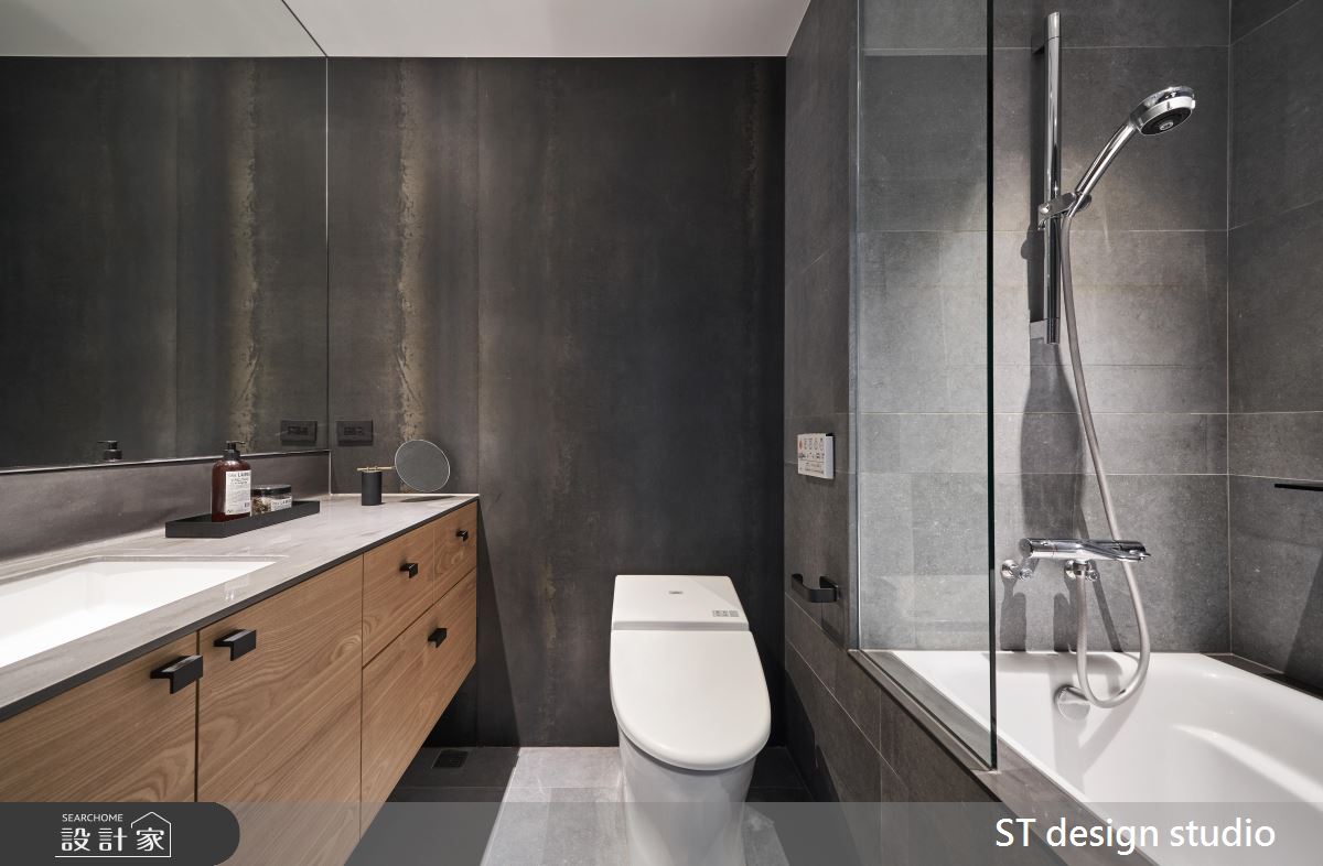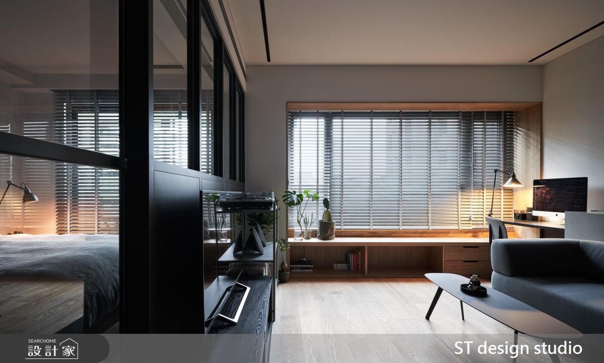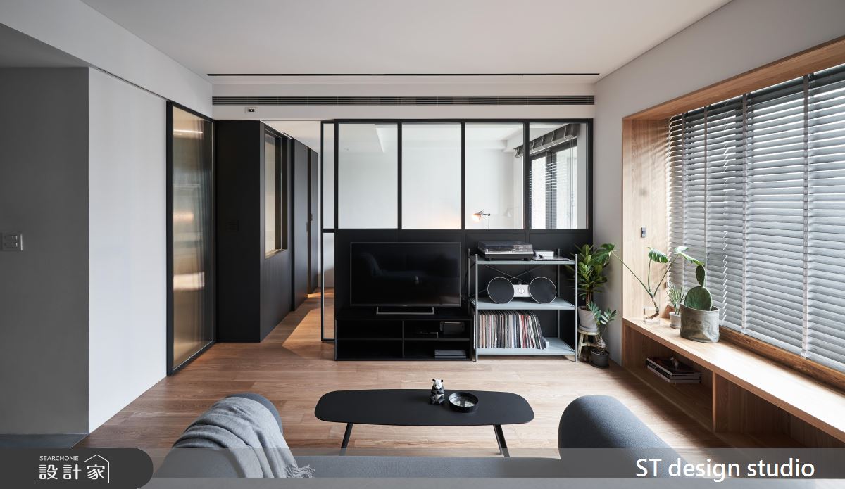 格局配置上,設計師將公私領域重新調配,把臥室縮小,運用半通透的金屬玻璃隔屏界定與客廳關係,使視線可作出延伸,並適時保有私領域的安全感及隱私;廚房則保持開放,與客廳之間以中島加以相隔,並於一旁延伸懸空桌板,提供屋主需要的工作角落;並讓公領域納進寬闊窗景與優良採光,引用木質框架包覆窗戶, 除了減弱樑柱壓迫感,也打造出小巧迷人的臥榻角落;原先昏暗的浴室,則將空間加寬並置入浴缸,並使用玻璃窗門讓自然光得以導入,洗臉盆也變更方向並加寬,衍生更明亮通透的空間感,搭配灰色磁磚與人造石鋪陳,使視野更形簡約俐落!