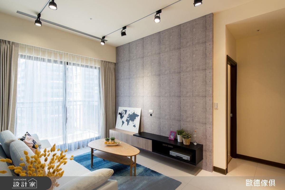 在電視牆的設計上,以清水模壁紙取代清水模質材,不僅帶出 Loft 風格,更替屋主省下預算;而整片清水模的自然質感與空間裡的鐵件、軌道燈相互呼應,型塑工業風質感;搭配懸吊的雙色電視櫃,使客廳空間更為寬敞、舒心。