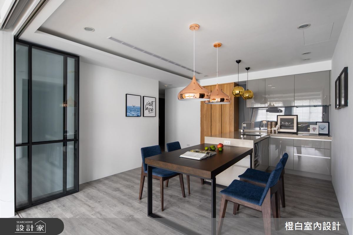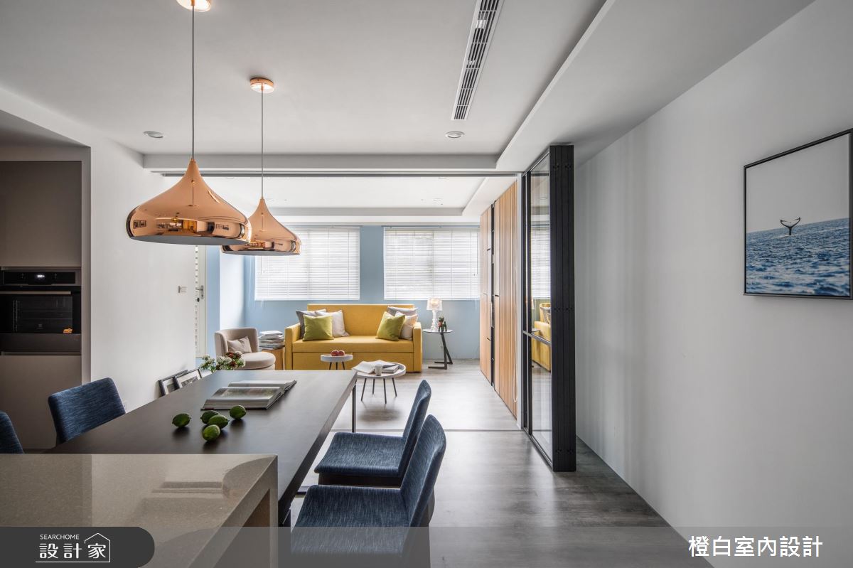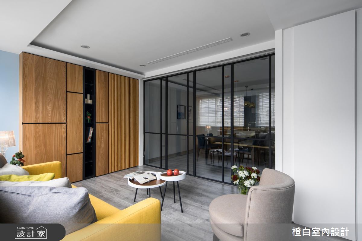 為讓居家保有高度互動的自在感,讓公領域呈現彈性隔間規劃,捨棄制式的客廳沙發位置擺向,讓座椅視線望向室內,將留白集中在居家中央地帶,使視野得以放寬而享受更大的空間感;客餐廳之間,則配置清玻璃折門,可隨時選擇闔上或開啟,或使用垂降的簾幕加以區隔,讓公領域可完全敞開,或是依主題各自獨立使用,而主牆則屏除常見的電視牆設計,改為貼齊牆線的大面積木書櫃,加入了立體線條修飾,型塑俐落且溫潤的主視覺表情,並突破客廳的單一使用方式,讓場域亦可化身書房,在美好採光之下兼容閱讀意義!