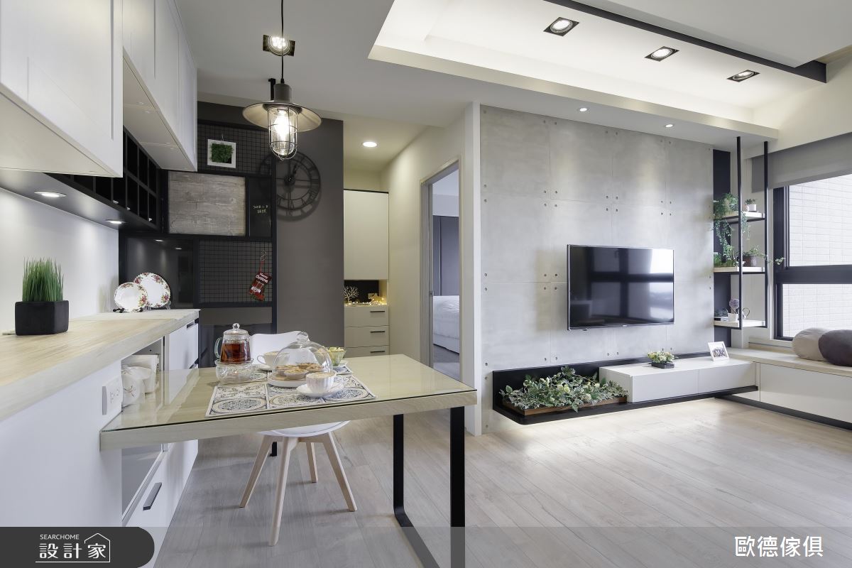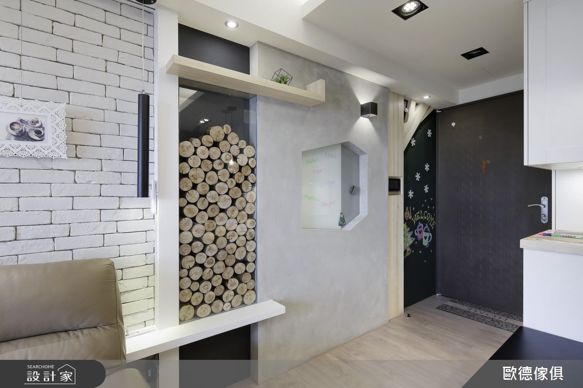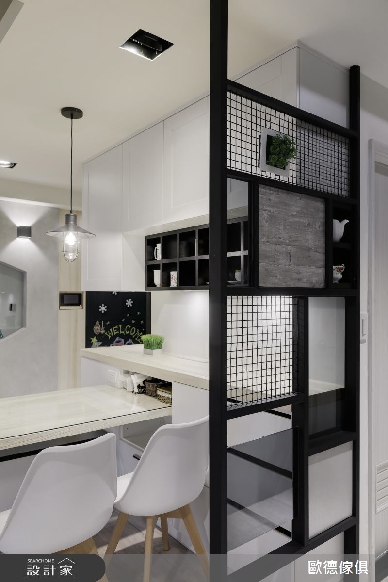 玄關系統櫃以懸吊方式呈現,下方懸空處設置間接光源,營造溫柔光線,中間局部鏤空處延伸至餐桌側邊,除方便進出門鑰匙放置,還可以做為簡易料理檯面。而下方具收納功能的穿鞋椅兼具餐椅角色,一椅多用,讓系統櫃機能發揮到最大值。門後牆面漆上黑板漆,搖身一變塗鴉牆,繼續沿著牆面走入室內,可以看到右側牆面運用雙色玻璃做留言板,還有以原木為設計靈感的端景牆。而客廳區置入綠意植栽,為小宅注入鮮活感,並以鐵件搭佐文化石牆,帶出個性風格。餐桌後方以鐵件屏風區隔公私領域,並利用網格收納展示設計,置入植栽,延續客廳綠意。
