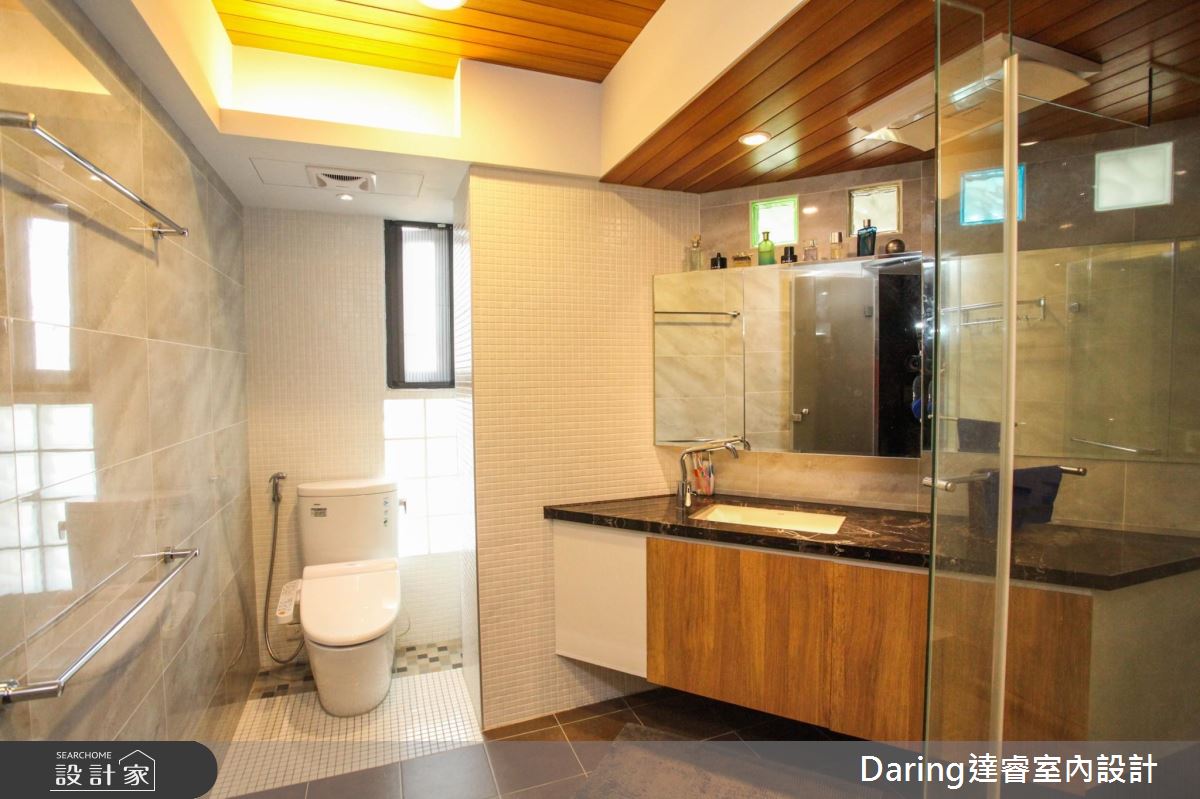 衛浴將格局劣勢轉化為特點,讓洗手檯形成斜切面,帶出不規則的視覺趣味,搭配多元異材質共砌空間,清爽、明亮而有特色!