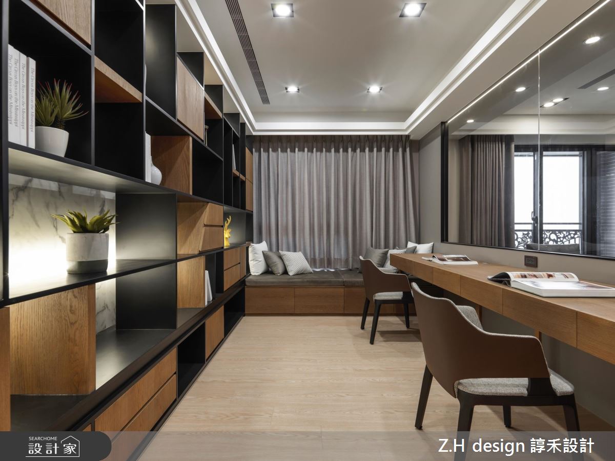 主臥延續公領域的灰階色調與溫潤木色,更加入柔和的間接照明與舒適的臥榻,更在電視牆上加入時髦的金屬線條,並善用空間打造了專屬更衣間。
