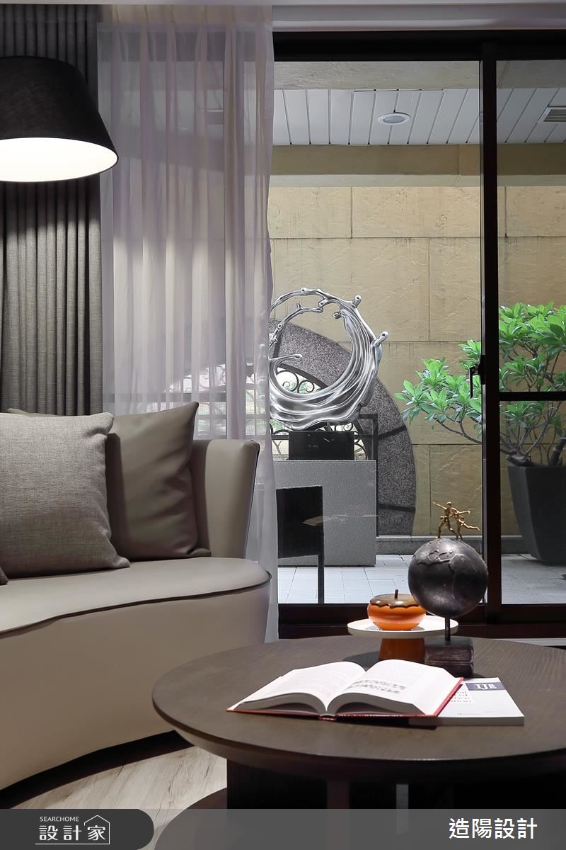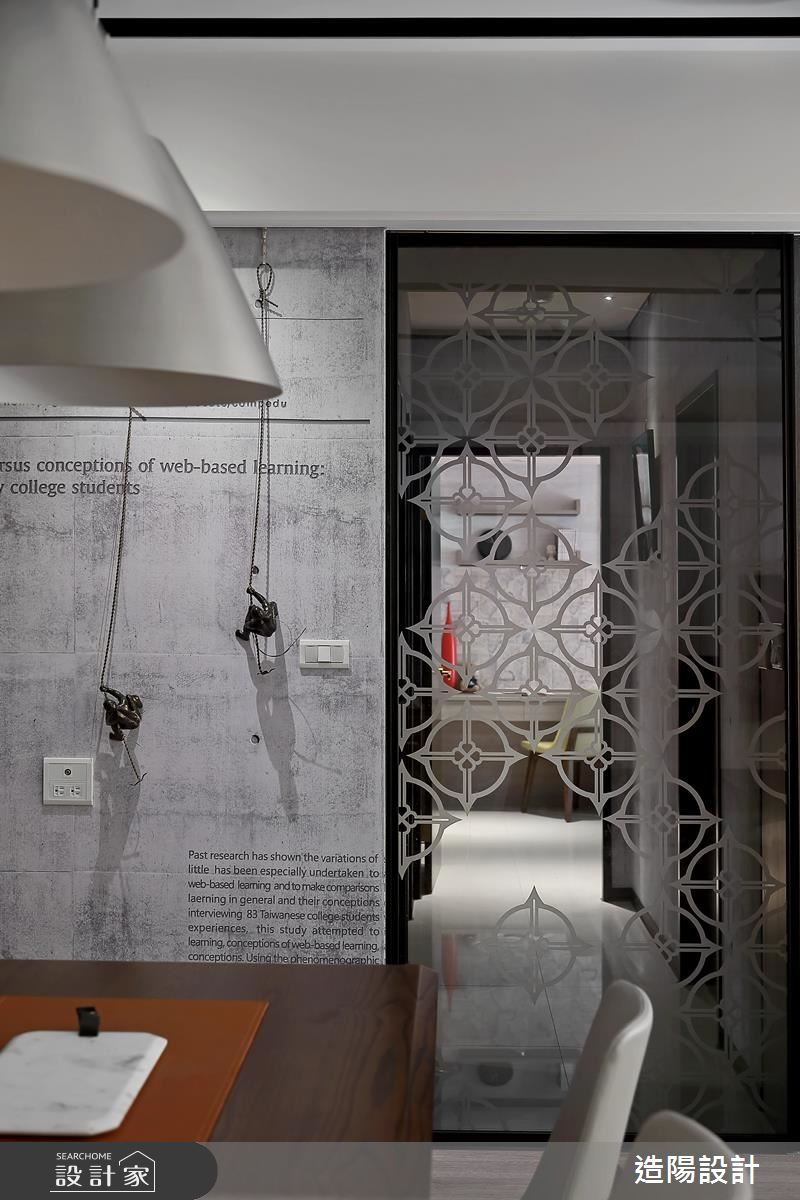 在客廳設計上,運用了不少線條比例分割,傳遞著屋主喜愛的現代風簡潔風格,並配置佈滿綠意植栽的大露台空間,使研習學生多了可休憩的活動領域,並串起著公領域生活機能;餐廳牆面則巧妙選用仿清水模壁布,將屋主的發表論文,以烙印型式作為主牆表情,並裝飾小鐵人象徵努力不懈的往上攀爬,詮釋屋主的教學與研究熱忱,一旁連結清玻隔屏拉門,以藝術噴紗圖案做視覺妝點,細膩地呈現風格特色;而臥房內,則劃分為睡眠、書房與更衣領域,透過櫃體的安排,合宜安排每道機能;黑膠室內,更配置了隱藏式上掀床組,讓空間隨時可變為臨時客房使用,網羅更多彈性主題!