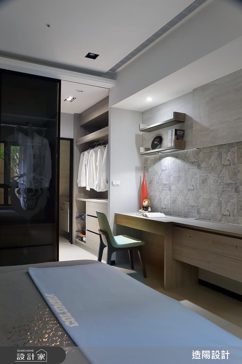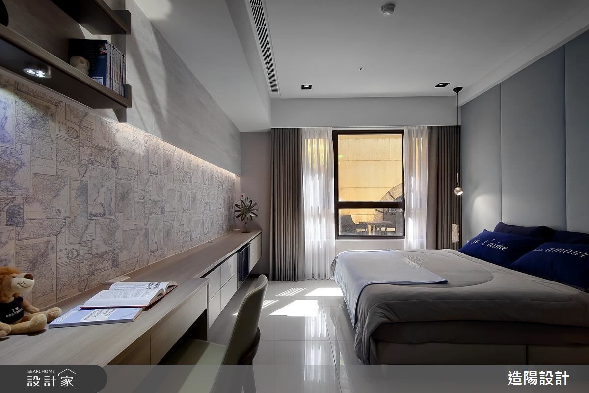 主臥床頭牆採以素雅灰色裱布處理,加上垂墜的吊燈設計,讓有睡前閱讀習慣的屋主,更能放鬆度過美好夜晚,床尾牆面更鋪陳世界地圖壁紙,展現個人遠大的志向與努力成就!
