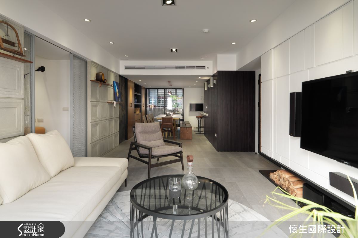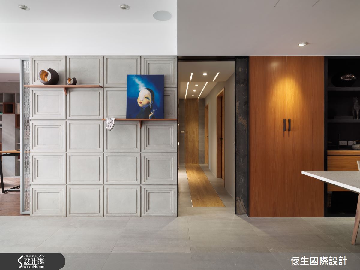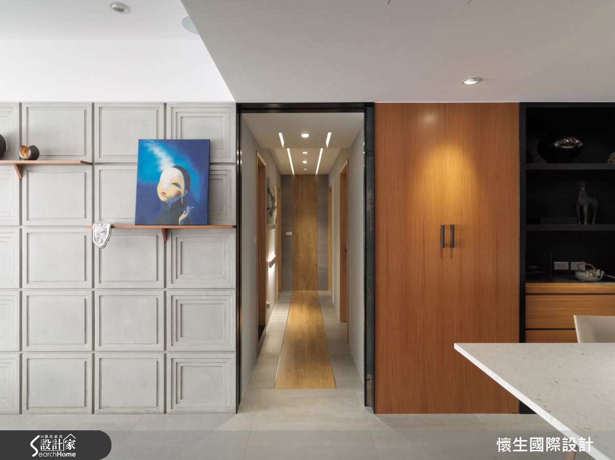 入門後,映入眼簾的清水模沙發背牆,利用層板放置特色藝術品,成功化身端景牆。客廳區白色電視主牆兼具隱形收納機能,且利用大面積白色系透亮空間視野。書房規劃在客廳沙發後方,採用網格隱形拉門做隔間,將書房獨立於公領域,同時可作為多功能客房。餐廚區中島設計成小吧檯,並選用長形餐桌,方便屋主招待客人時使用。陽台位在餐廚區旁,落地窗拉門設計,為空間注入更多自然光源,讓光線流暢於公領域。公、私領域以隱藏門區隔,同時作為屏風,大門打開時,不讓視線穿透入私領域空間。連接公、私領域的廊道,利用燈光線條、地坪及牆面異材質組合,將視覺延伸入內。衛浴間,以磁磚呈現衛浴間質感,並利用特色鏡面豐富空間層次。