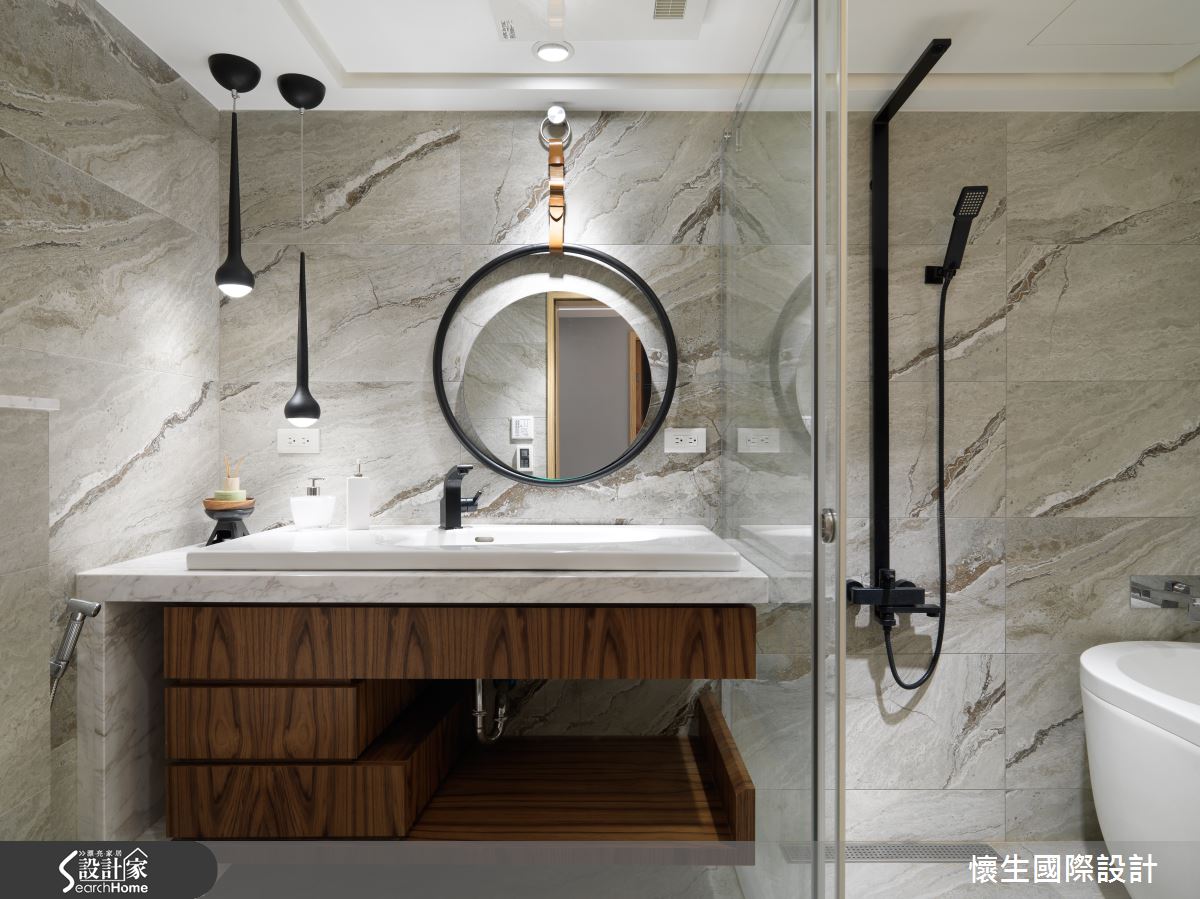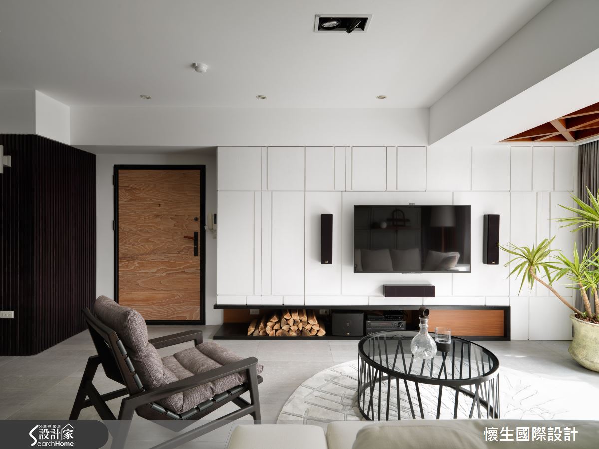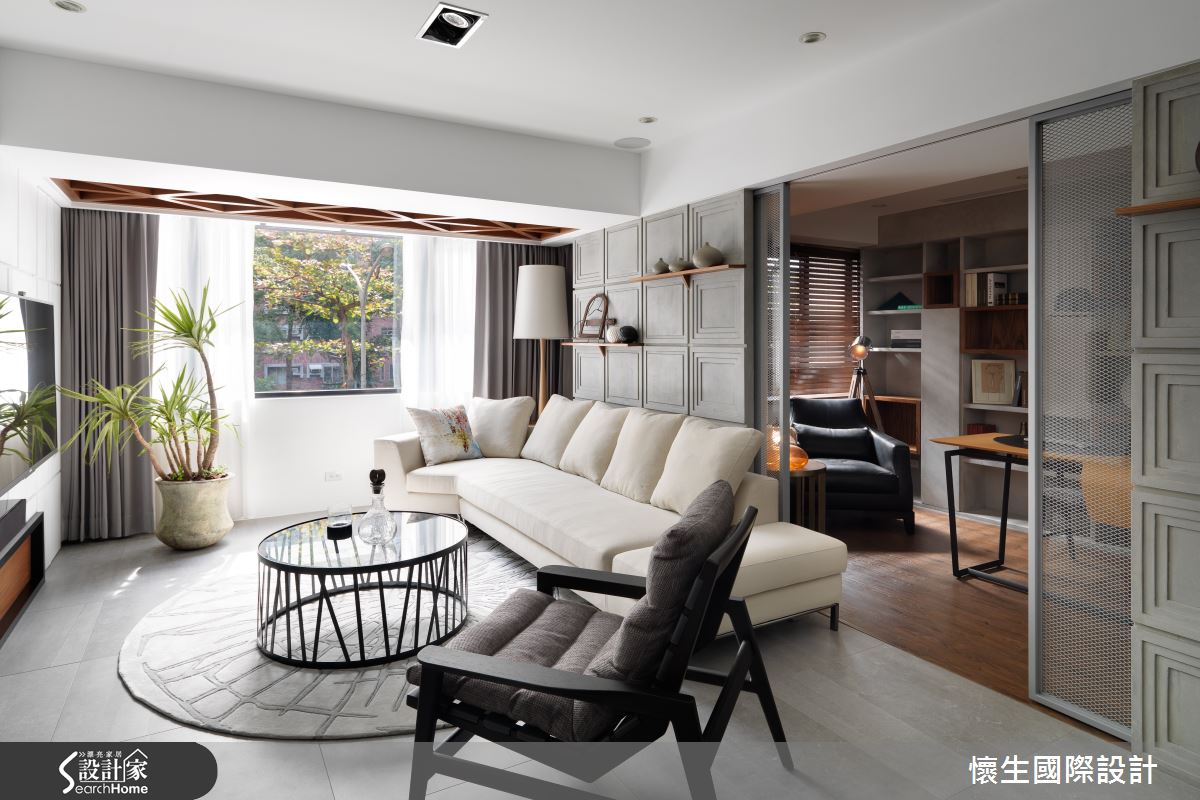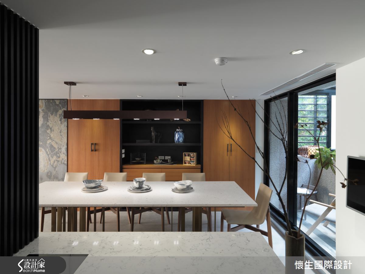 入門後,映入眼簾的清水模沙發背牆,利用層板放置特色藝術品,成功化身端景牆。客廳區白色電視主牆兼具隱形收納機能,且利用大面積白色系透亮空間視野。書房規劃在客廳沙發後方,採用網格隱形拉門做隔間,將書房獨立於公領域,同時可作為多功能客房。餐廚區中島設計成小吧檯,並選用長形餐桌,方便屋主招待客人時使用。陽台位在餐廚區旁,落地窗拉門設計,為空間注入更多自然光源,讓光線流暢於公領域。公、私領域以隱藏門區隔,同時作為屏風,大門打開時,不讓視線穿透入私領域空間。連接公、私領域的廊道,利用燈光線條、地坪及牆面異材質組合,將視覺延伸入內。衛浴間,以磁磚呈現衛浴間質感,並利用特色鏡面豐富空間層次。