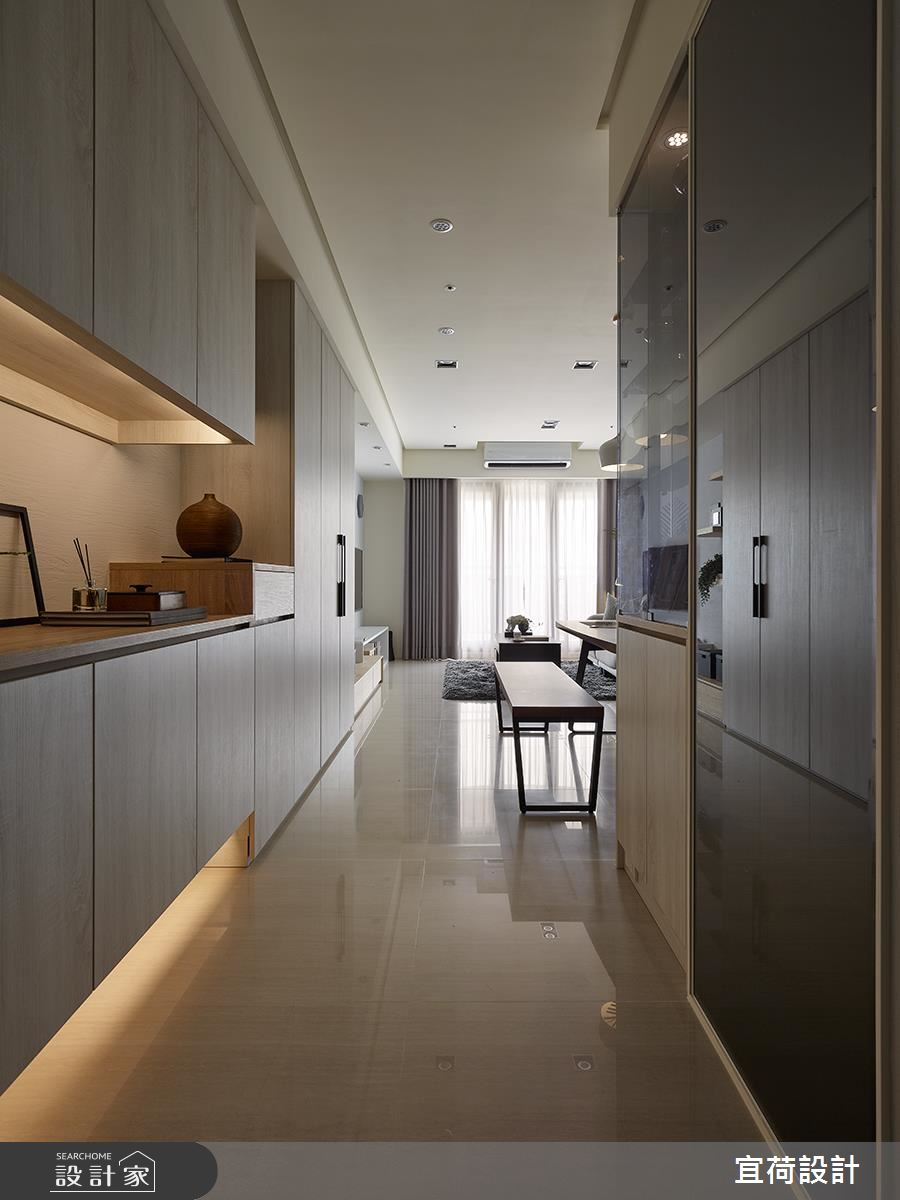 設計師針對屋主需求,將原先提供的一字型廚房放大,並配置了結合完整收納機能的玻璃拉門,打造開放、獨立自如的烹飪空間,與餐廳形成流暢的動線,滿足屋主假日都會在家大展廚藝的喜好。針對重視收納機能的屋主,設計師在玄關即規畫大面積櫃體,一路延伸至電視牆邊界,與對向的餐櫃相互呼應。全室皆採用輕淺的色調搭配溫潤的木元素,搭配灰階沙發與軟件,提升質感與品味。