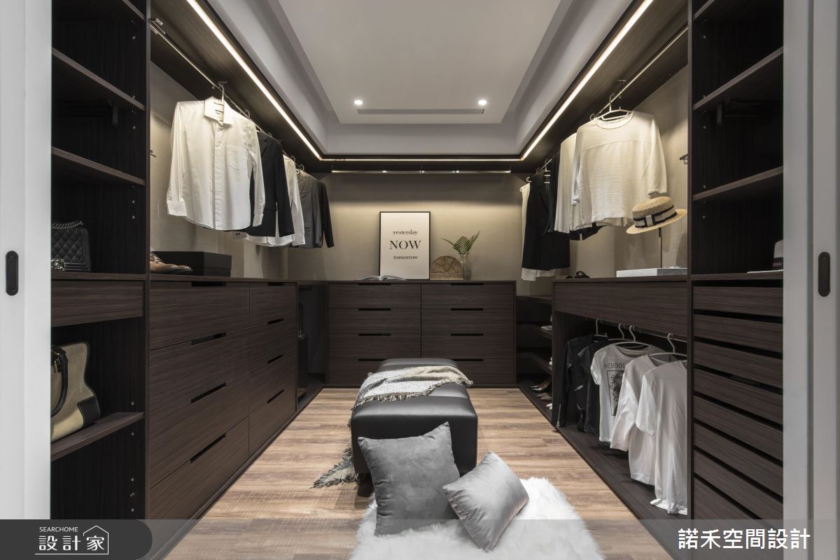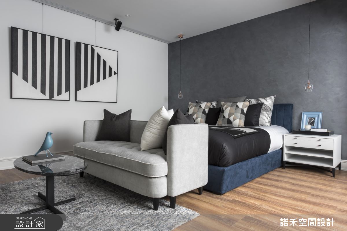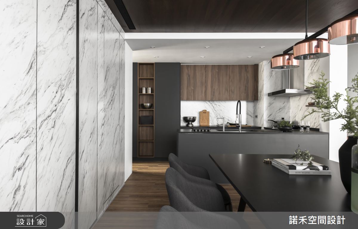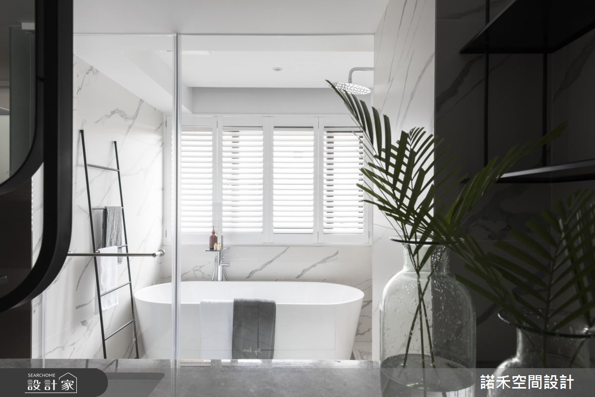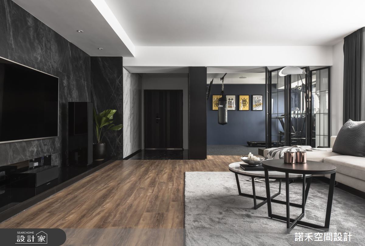 依據屋主需求,一樓公領域囊括客廳、餐廚、長輩房以及多功能健身空間,二樓則全然回歸屋主的私人領域,包含主臥與私人工作室。公共空間以低彩度色系黑、白、灰為主,並在壁面與家具納入大量時髦且備受女主人喜愛的大理石元素,佐以金屬家飾,宛如專業的攝影棚背景。為求背景乾淨俐落,設計師更利用縱向線條,將衛浴、臥房入口隱藏於仿大理石美耐板後方,達到虛化開口目的。多功能健身房以湛藍色調為主,並以鐵件玻璃拉門與公領域產生區隔,隨需求開闔自如。私領域皆以低彩度色彩為主調,設計師更抓住屋主喜好,設計了動線流暢寬敞的更衣間,以及乾溼分離、附有泡澡機能的浴室。