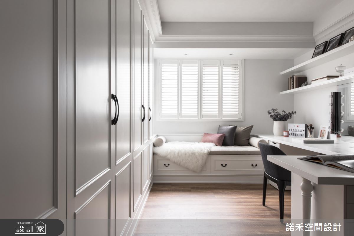 設計師更特別為女主人量身打造私人工作室,簡約的線板搭配精緻的家具與粉嫩色調,置入機能完備的臥榻與書桌,儼然成了少女般的小天地。