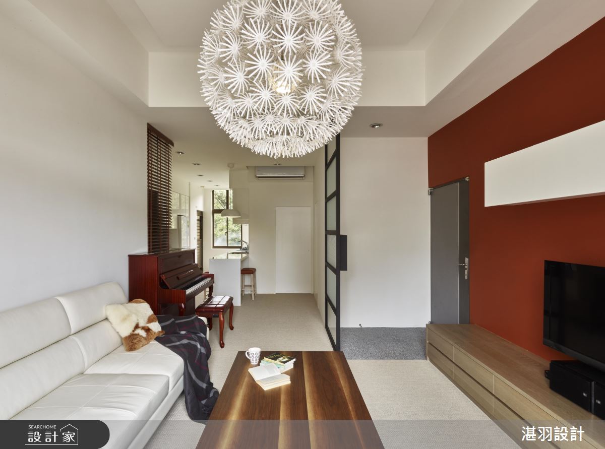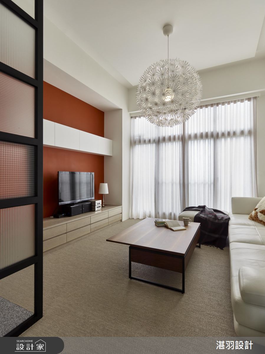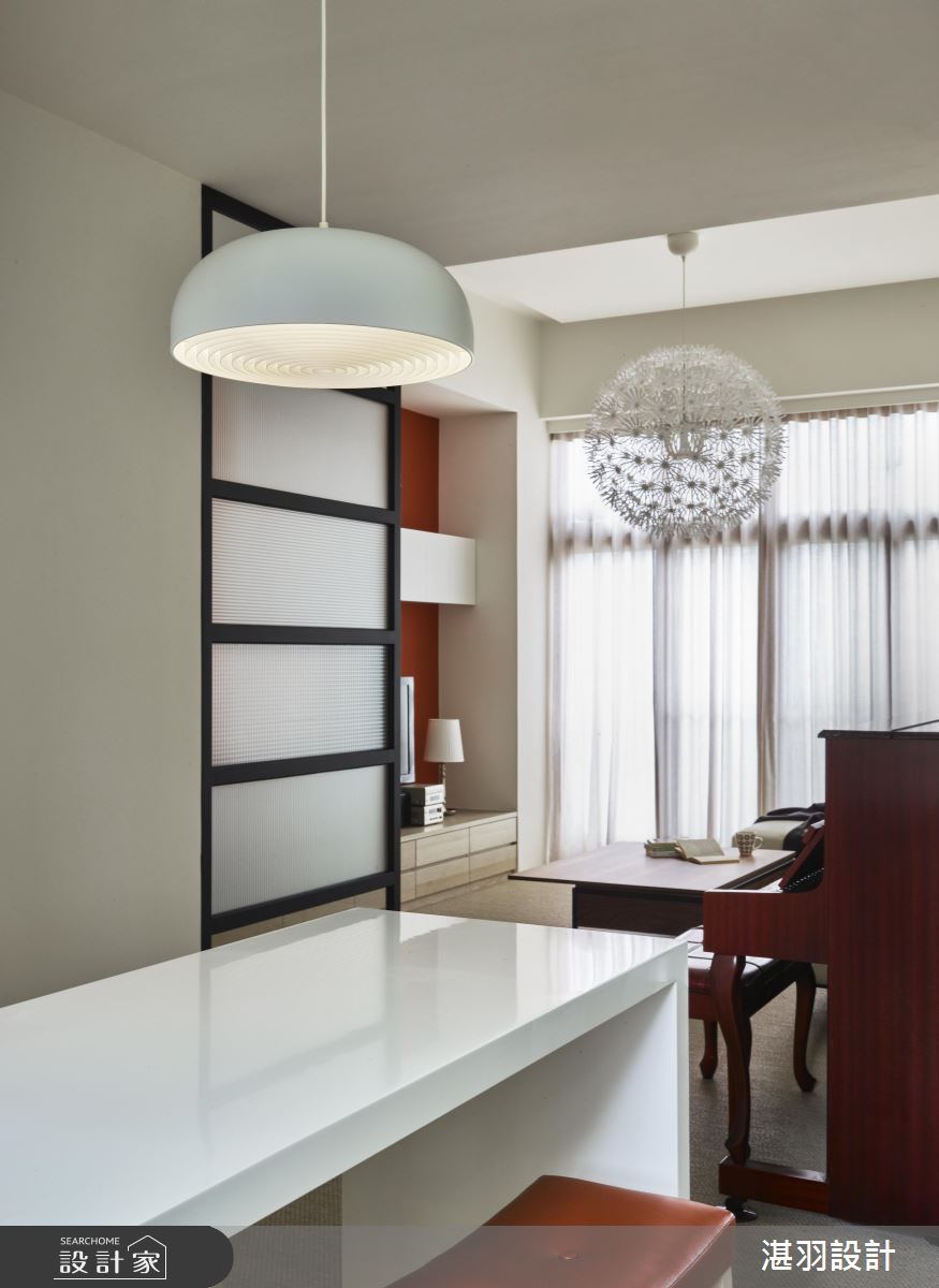 玄關區,使用造型玻璃做隔屏,流露後方廳區若隱若現的通透感;進入公領域內,則選用波龍地毯鋪設地面,締造溫和內斂的情境,於客廳電視牆鋪陳時尚的橘紅色,搭襯空間中醇厚的木作肌理、木鋼琴家具等,撞擊出豐富的色調層次,而木鋼琴的開放位置,除了串起客餐廳之間的關係,凝聚美好琴音之外,也型塑一抹穩重典雅的焦點;開放式的廚房,不但串聯起家人間的情感,也導入窗外綠意,讓景觀與光線可延伸入室,同時巧搭呼應客廳主色的橘紅餐椅,在寧靜的白底中潛藏色彩張力;寢臥,在床頭加入木層板,藉由書籍與家飾展示妝點風格,且調和柔和的室外採光,演繹和諧的整體視野!