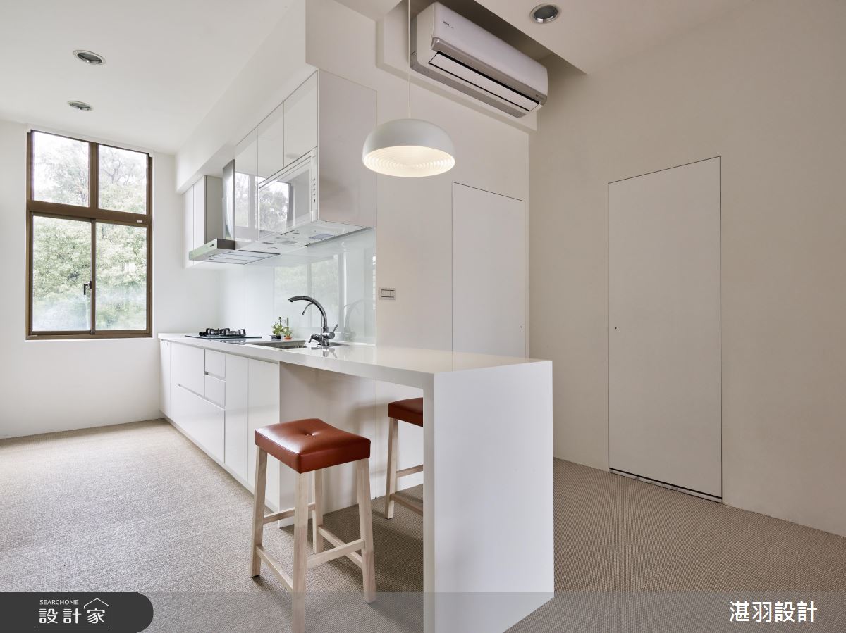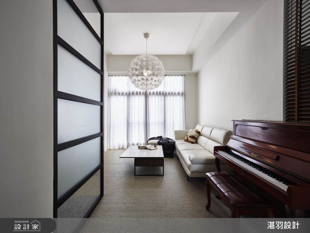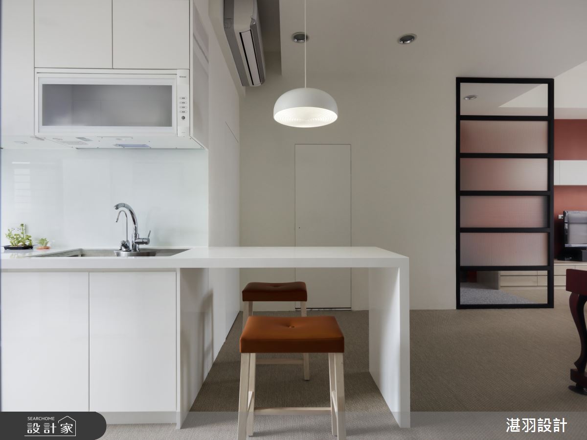 玄關區,使用造型玻璃做隔屏,流露後方廳區若隱若現的通透感;進入公領域內,則選用波龍地毯鋪設地面,締造溫和內斂的情境,於客廳電視牆鋪陳時尚的橘紅色,搭襯空間中醇厚的木作肌理、木鋼琴家具等,撞擊出豐富的色調層次,而木鋼琴的開放位置,除了串起客餐廳之間的關係,凝聚美好琴音之外,也型塑一抹穩重典雅的焦點;開放式的廚房,不但串聯起家人間的情感,也導入窗外綠意,讓景觀與光線可延伸入室,同時巧搭呼應客廳主色的橘紅餐椅,在寧靜的白底中潛藏色彩張力;寢臥,在床頭加入木層板,藉由書籍與家飾展示妝點風格,且調和柔和的室外採光,演繹和諧的整體視野!