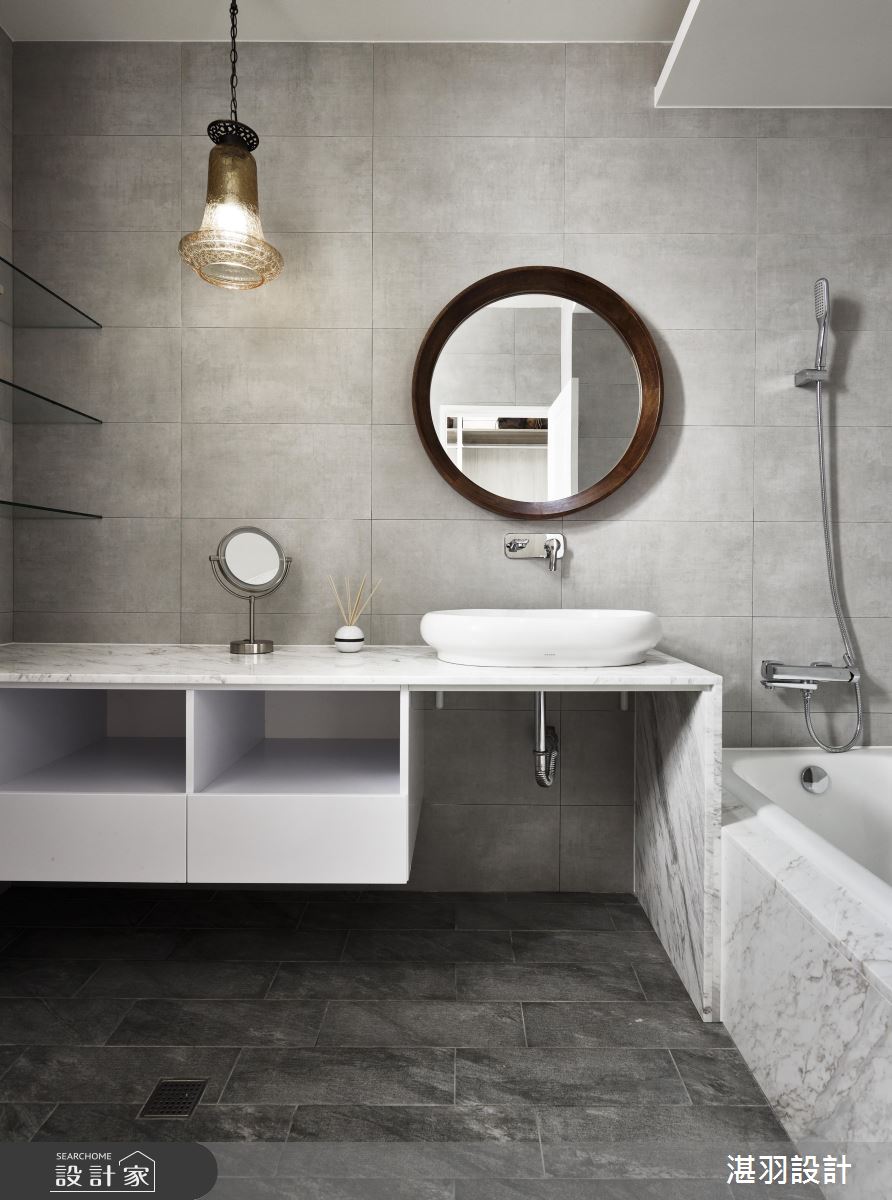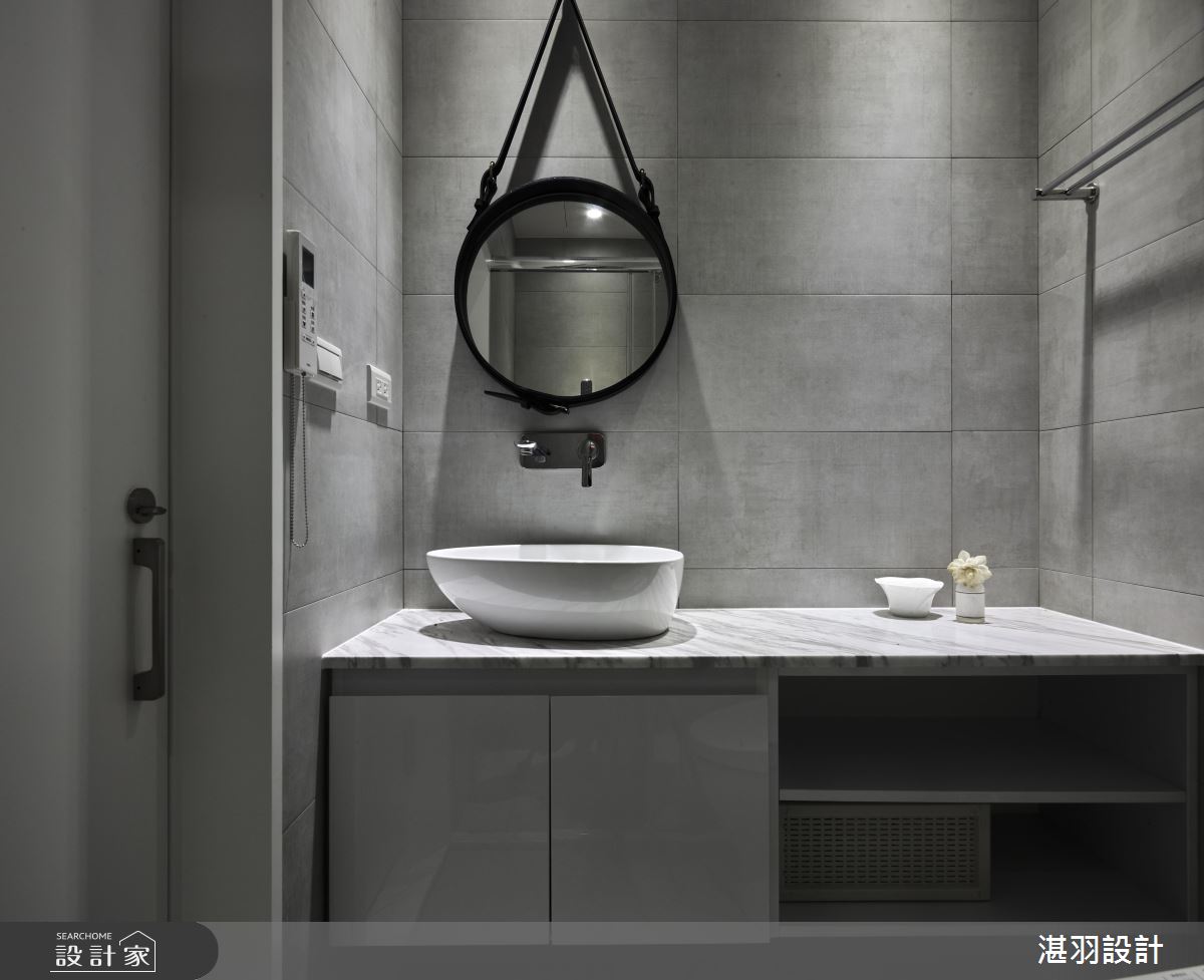 衛浴選用灰色板岩磚大面鋪敘,並加上天然的大理石紋,令人有感置身於天然石頭湯屋內,且獲得更寬敞的視覺感受!