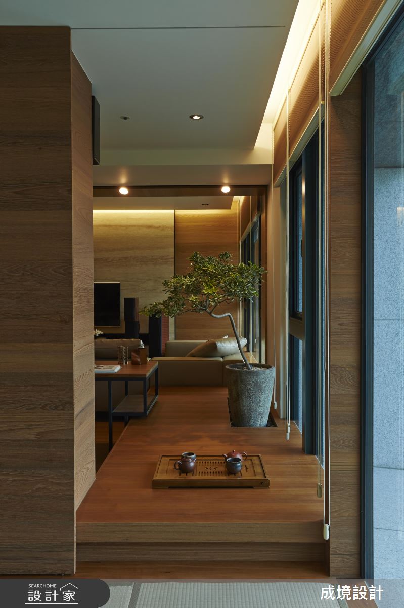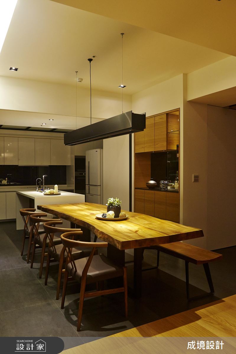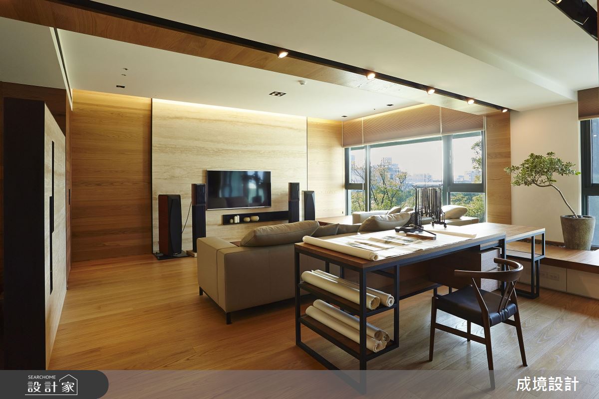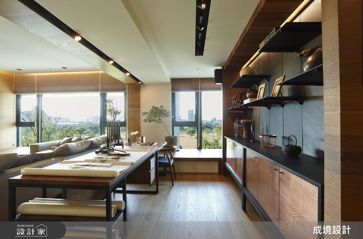 公共領域,將臥榻、沙發巧妙結合,使客廳可連結至後方畫圖空間,營造可隨時坐臥聊天的情境,沙發後方則緊鄰訂製畫桌,搭配可抽拉式桌面,讓使用方式更具彈性,並可在畫圖時同步坐享窗外風景,畫桌後方,使用現代手法製作展示牆面,加入石板鋪陳背景,搭配投射軌道燈照射,烘托每件藝品的造型與質地,牆面下方刻意使用銅片櫃門,帶出現代工藝的粗獷味道;餐廳,採用長型原木餐桌,且特意訂製鐵件桌腳與簡約吊燈,搭佐合宜的櫃體機能分配,滿足屋主呼朋引伴、團聚用餐的需求;位於畫室後方是一處複合場域,透過隱藏拉門兼具隱私性,內部以榻榻米帶出日式禪味道,並給予美好綠意進駐,成為屋主泡茶小歇的私密小天地!