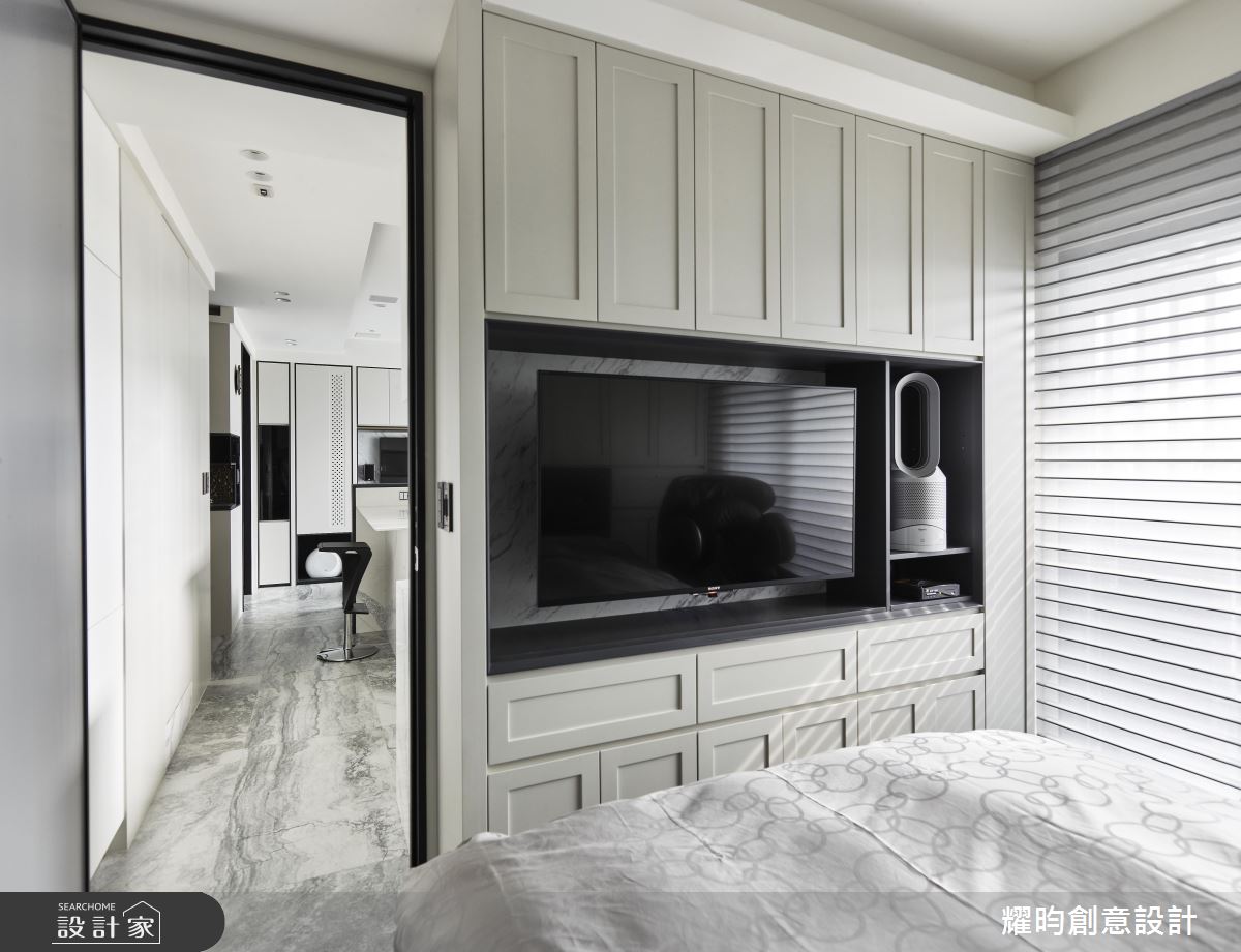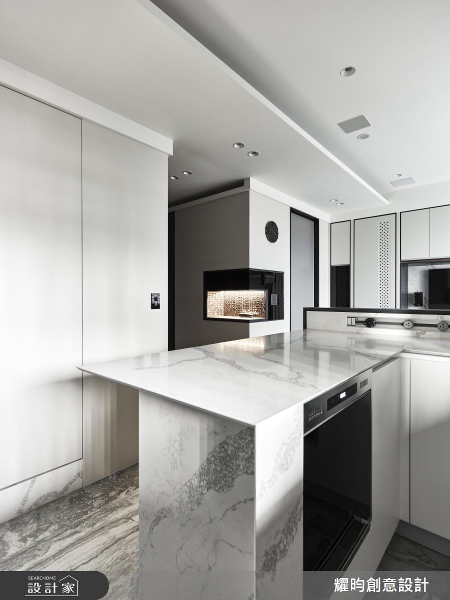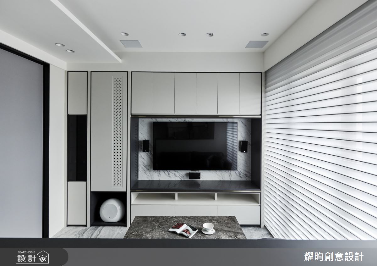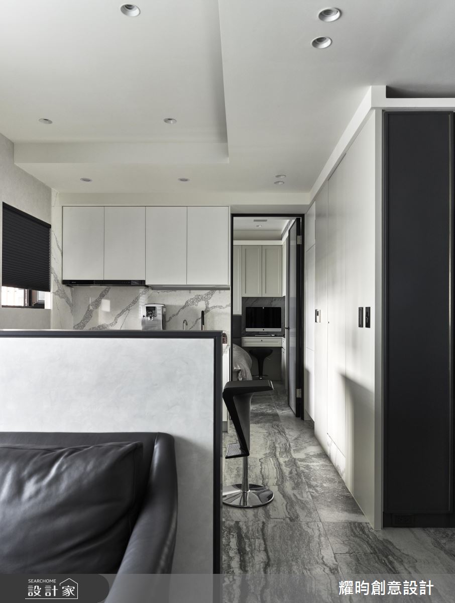 設計師在有限空間內,利用大量自然感建材凝聚質感,並藉由戶外陽光的引入,為開放式客廳帶來通透視野,而極簡俐落的黑白色搭配,也同步創造了放大感受,廚房吧檯領域,除了提供足夠的收納空間,L 型的量體分佈也間接帶出了廊道的動線脈絡;寢臥內,運用大量白灰色調相間調和,打造能夠沉澱心靈的臥室,並規劃專屬更衣間,引導舒適且富機能性的起居情境,而衛浴空間雖然不大,但裝飾上也絲毫不馬虎,以磚材、石紋、鏡面等相互交織,顯得精簡且清爽,凸顯出都會時尚的魅力!