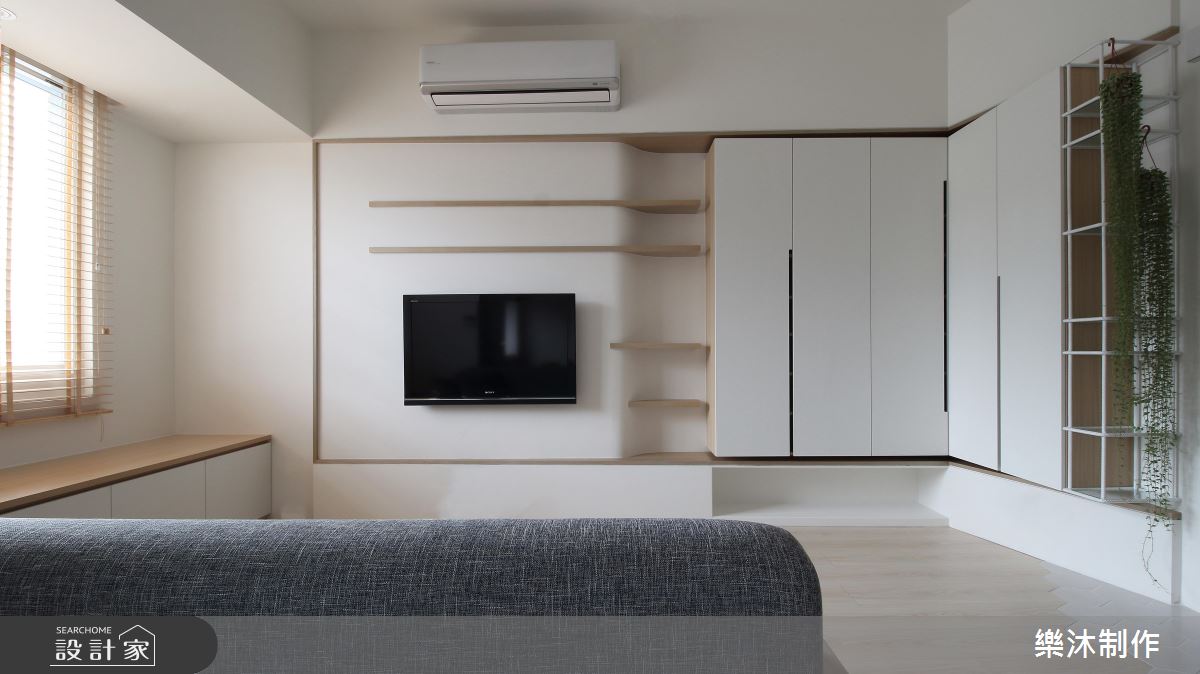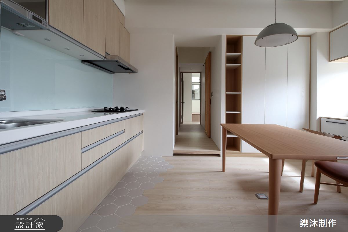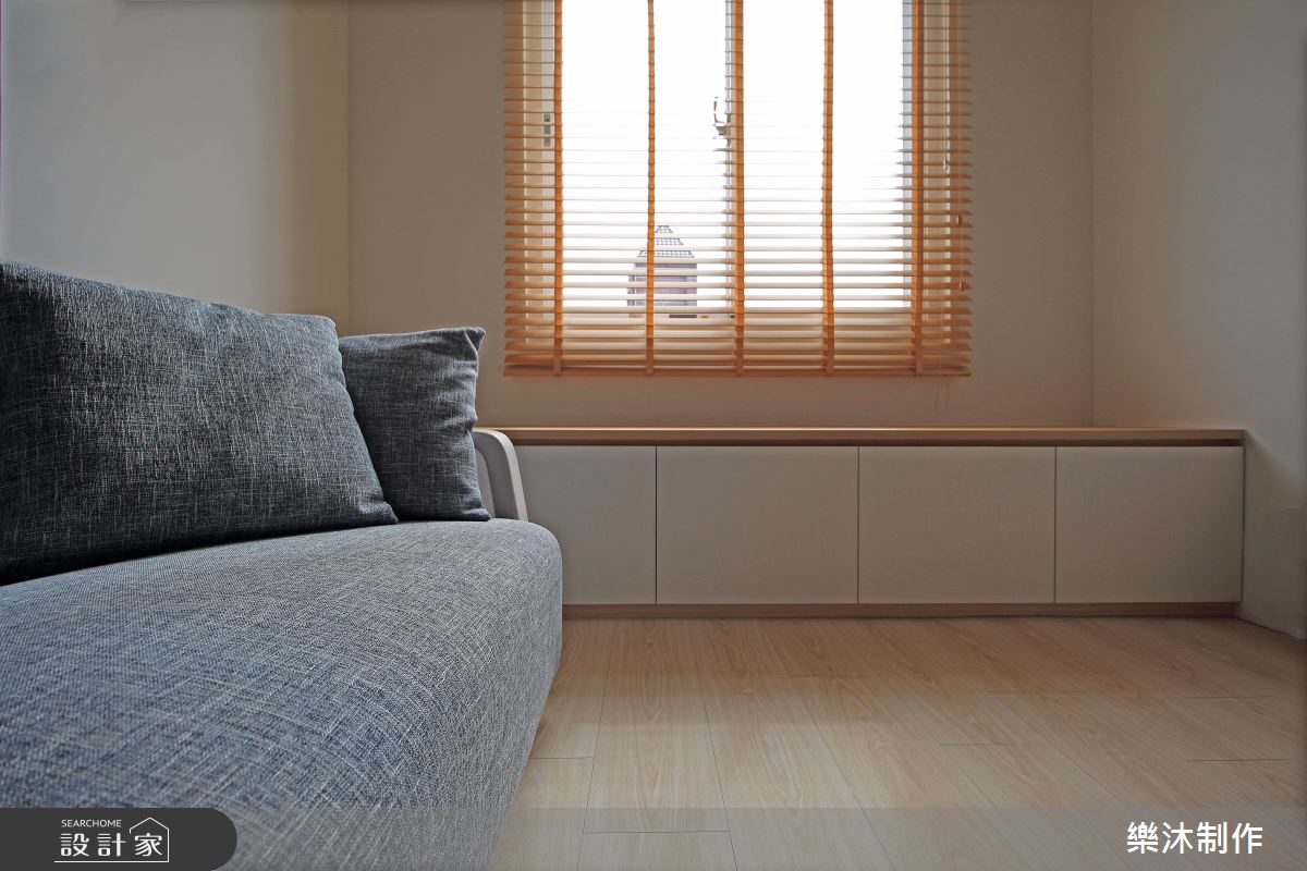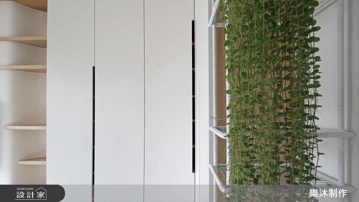設計師引用純白的配色、局部的木皮,加上窗外採光浸潤,造就親切無壓的生活感受,在輕柔的底蘊中,使有限坪數也能顯得寬敞而舒適,電視牆則融合弧線延展,造成視覺流動意象,並搭配木層板穿插展現立體表情,一側則妝點一叢綠意植栽,替空間增添一抹生動焦點;餐廳與廚房的地板部分,刻意選以異材質做出分界,讓磚面與木素材產生對話,使地坪也成為出色的展示風景;同時,將含蓄的日式元素帶入北歐風格內,讓細膩線條表現在格柵、百葉窗之間,以不刻意雕飾的質蘊,繪出純粹自然的樸實意象!