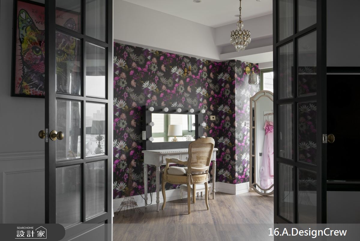 原有格局雖方正,但動線較不流暢,於是設計師跳脫傳統格局,捨去非必要的隔間,以 45 度角切割公共領域,盡可能將私密場域集中,不只讓空間尺度放大,也使先天的好採光條件可更穿透入室,同時,在客廳加入淺灰色、白色等低彩度調和,並打造仿壁爐設計,滿足女主人的喜愛風格,而客餐廳及廚房則串聯成一氣,在斜角度規劃下,無形中使視角更為開拓,並形成互動交流的美好情境;私領域內,透過法式的輕柔灰紫定調,搭配古典氣息的軟件,顯出居者的不凡氣質,更衣間則大膽鋪陳繽紛花朵壁紙,讓空間洋溢著一股奔放魅力!