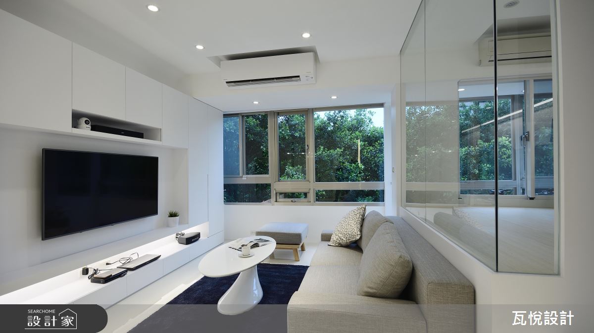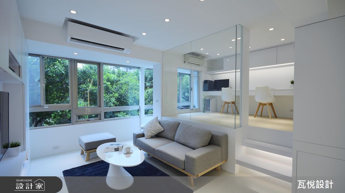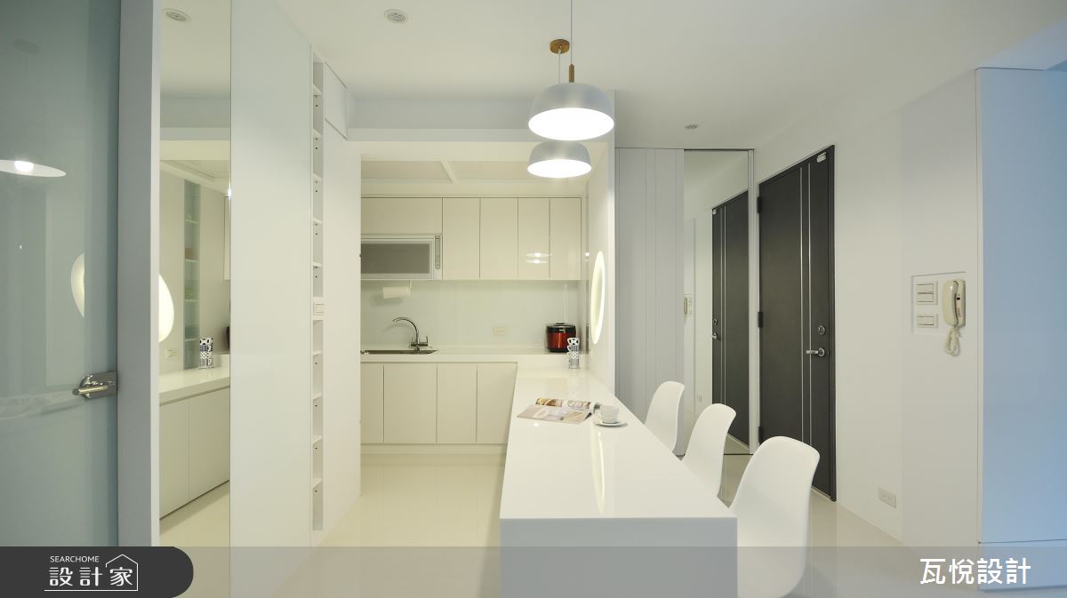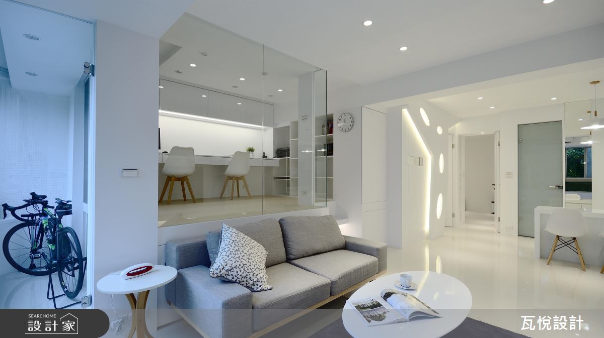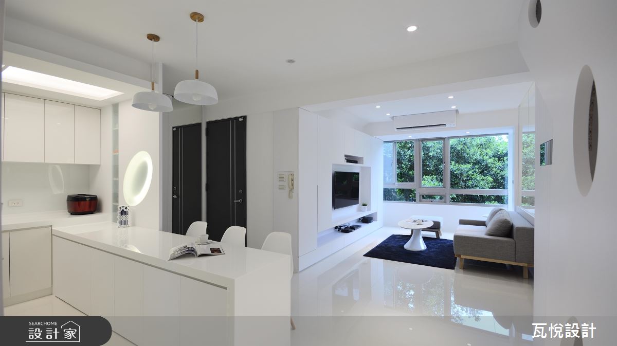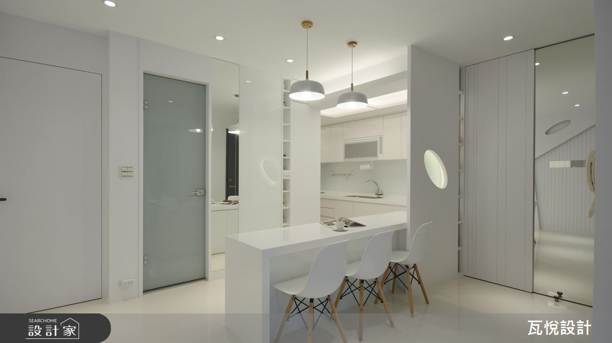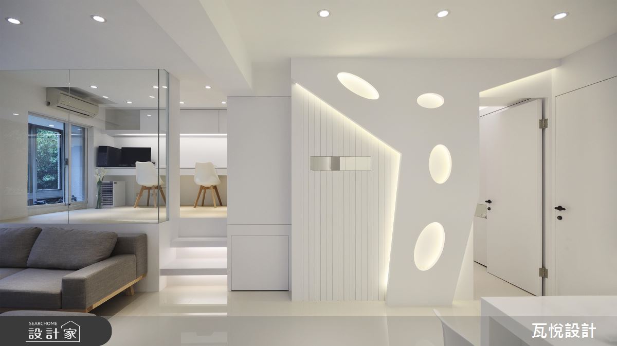為放大居家空間,設計師採用全白色調,搭配大面積鏡面,並以玻璃取代一般隔間牆,達到無限延展的通透視覺,一改陰暗沉悶的老屋調性。設計師首先改變大門開口方向,修正了狹長型客廳的致命傷,達到重新分配格局的目的。接著因為原先的廚房為狹窄的獨立烹飪空間,設計師變將之延伸到外部,並加入屏隔避免開門見灶的尷尬情況;由於人口單純,設計師以吧台取代餐桌,營造更加流暢的公領域動線。為了讓客廳與書房更加寬敞,設計師取消前陽台隔間,並墊高後方書房,打造錯落層次,臨窗位置更能成為腳踏車收納處。女兒房門外帶有間接照明的橢圓鏤空牆面,來自波西米亞服飾的靈感,讓居家空間更具趣味性。與書房的接壤處更規畫了隱藏式儲藏間,滿足日常需求。