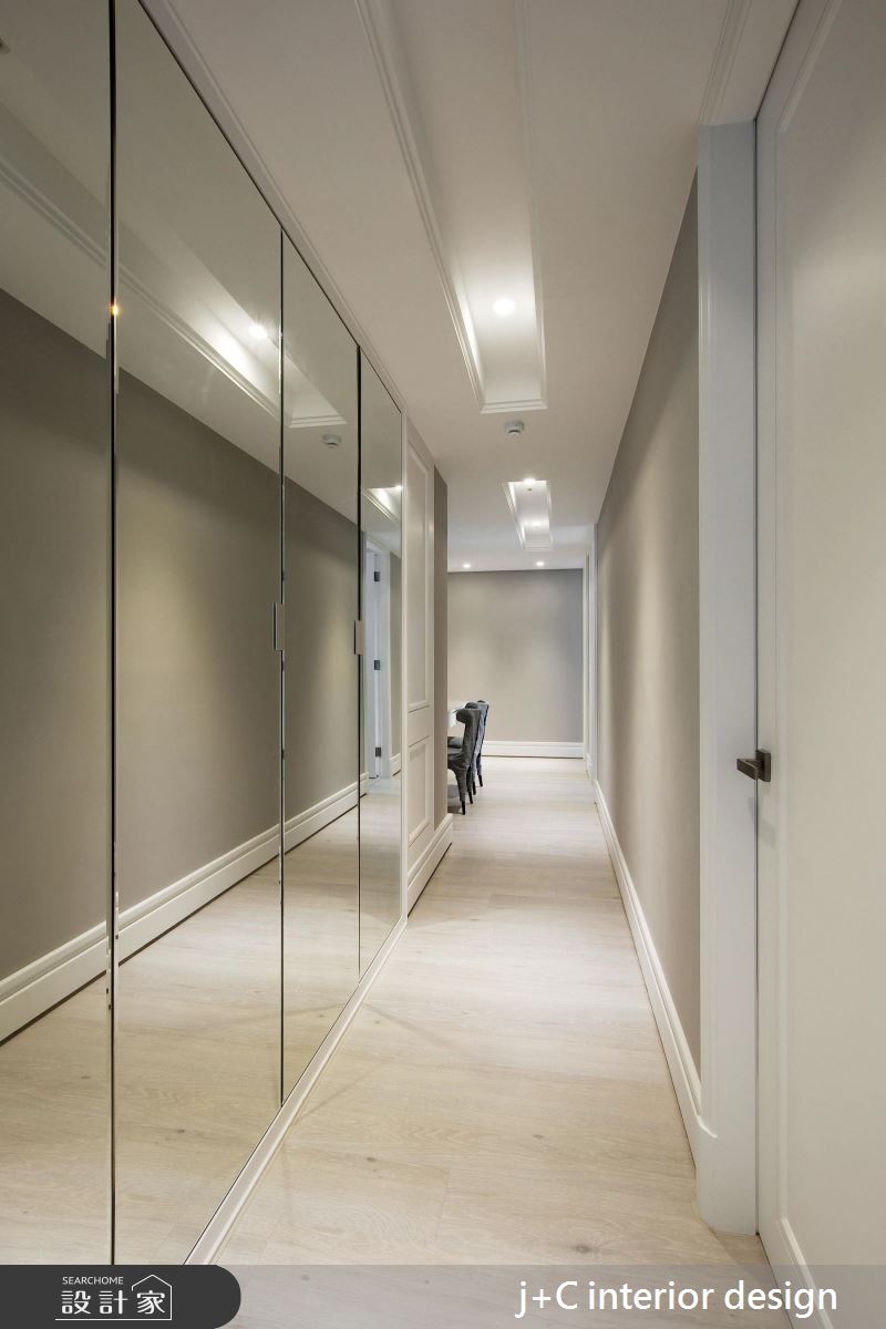 設計師將廊道的零碎格局加以重整,採用大片鏡面做為立面材質,不僅緩解狹隘,映照出更寬闊的空間感,也讓人在行進之間增添諸多視覺趣味!