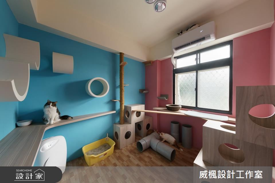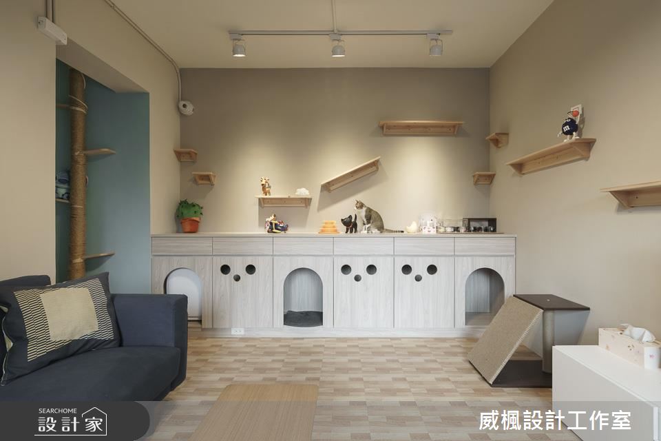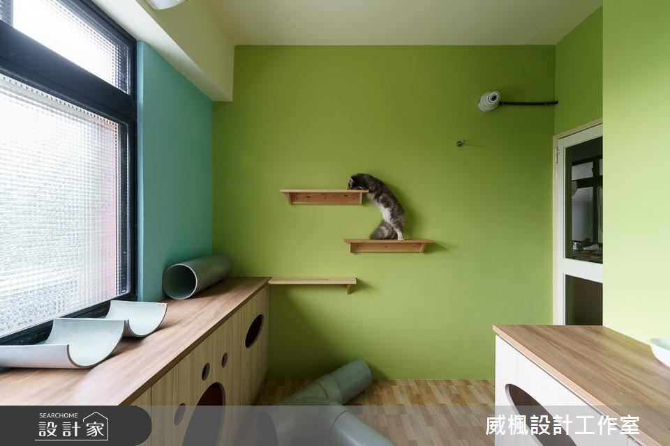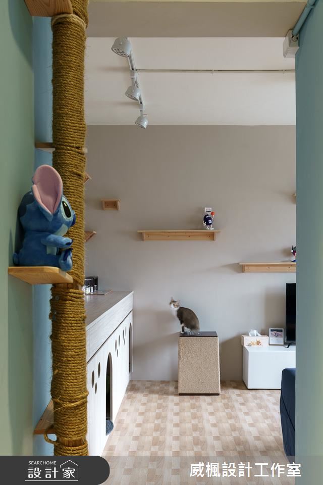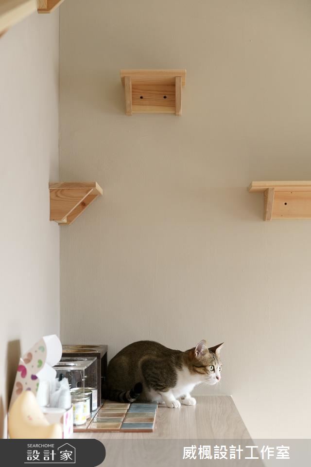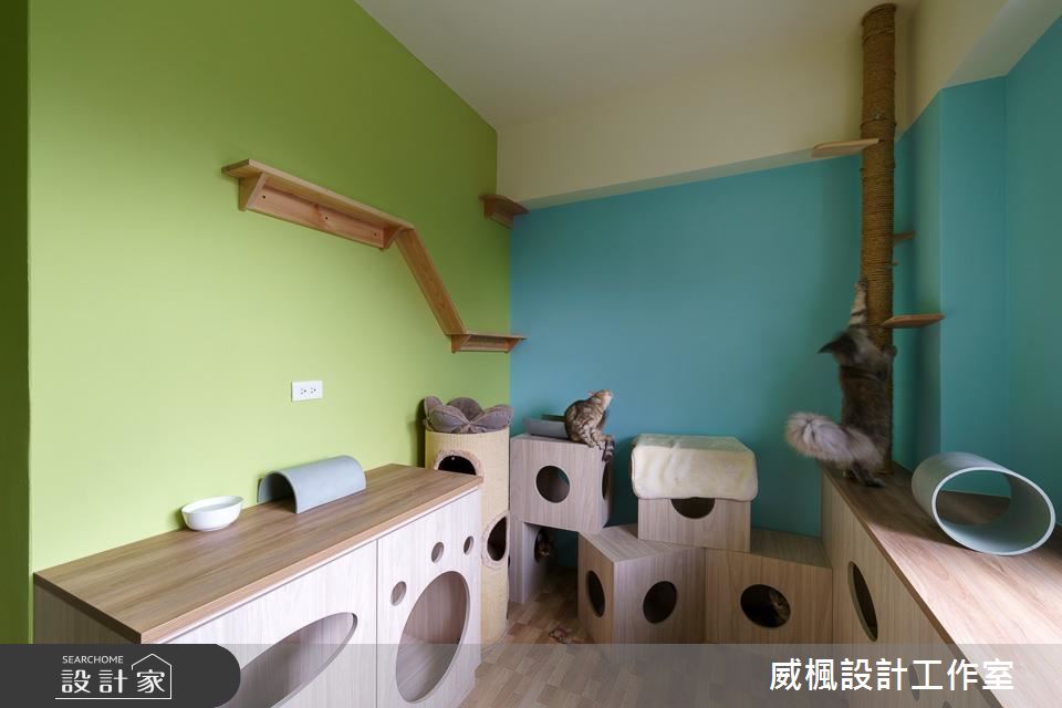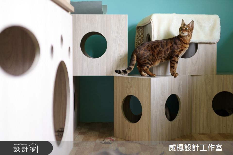 空間融合人的作息與寵物的動線,讓人寵需求同步滿足,在公領域保留大面窗戶,帶入自然光的流動,延伸出明亮度與空間感,並於牆面加入錯落的貓跳層板,讓愛貓們可跳上跳下,隨時與人互動,色彩上,則選用淺色木紋搭接草木綠、天空藍等自然感色彩,使空間充滿放鬆氛圍,而櫃體也經由量身打造,除了在櫃門做出趣味造型,也結合貓窩通道與收納機能,並擺置許多木箱,不僅建構出貓咪的遊戲地帶,也成為現成的背景裝飾,增添隨興休閒感受!