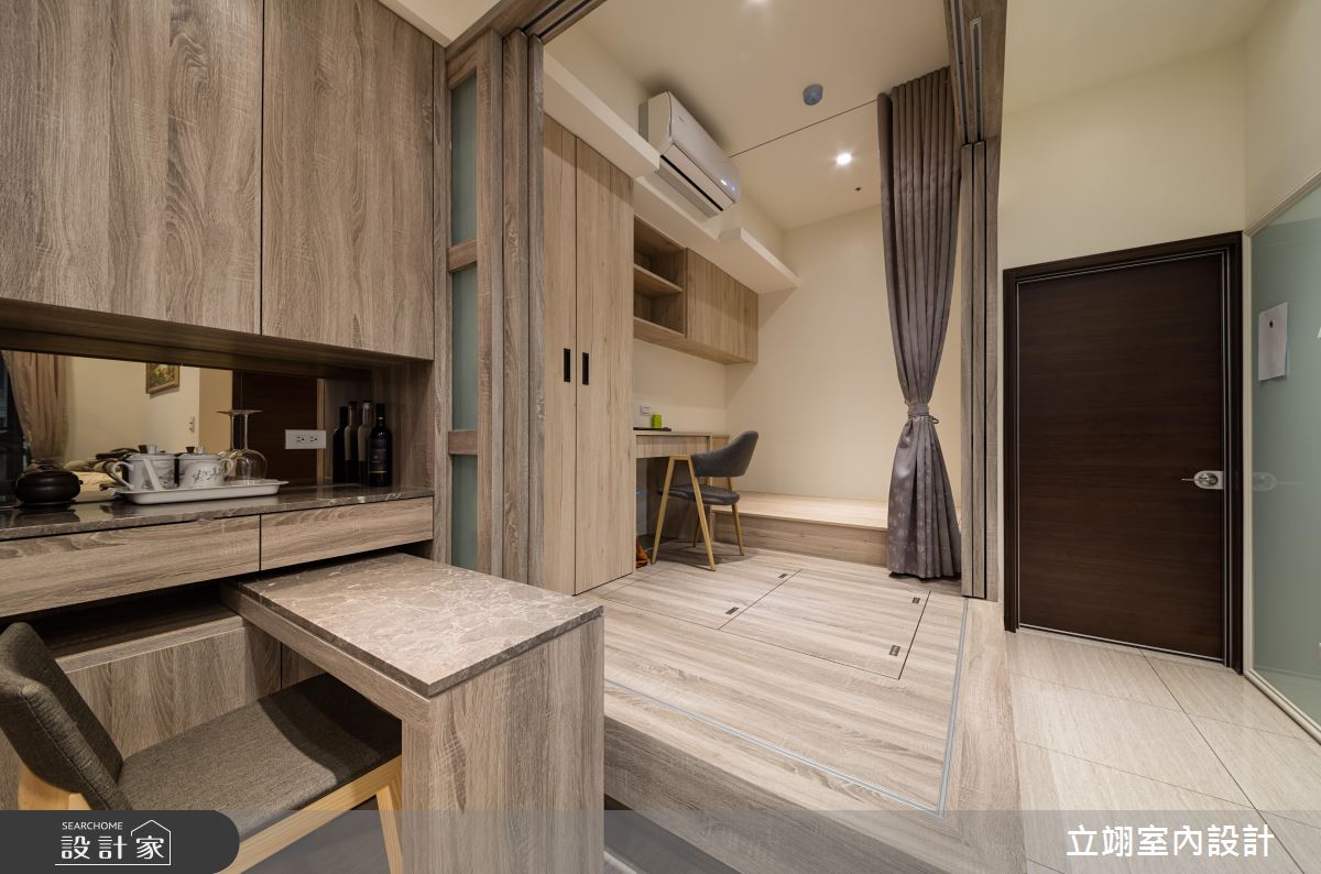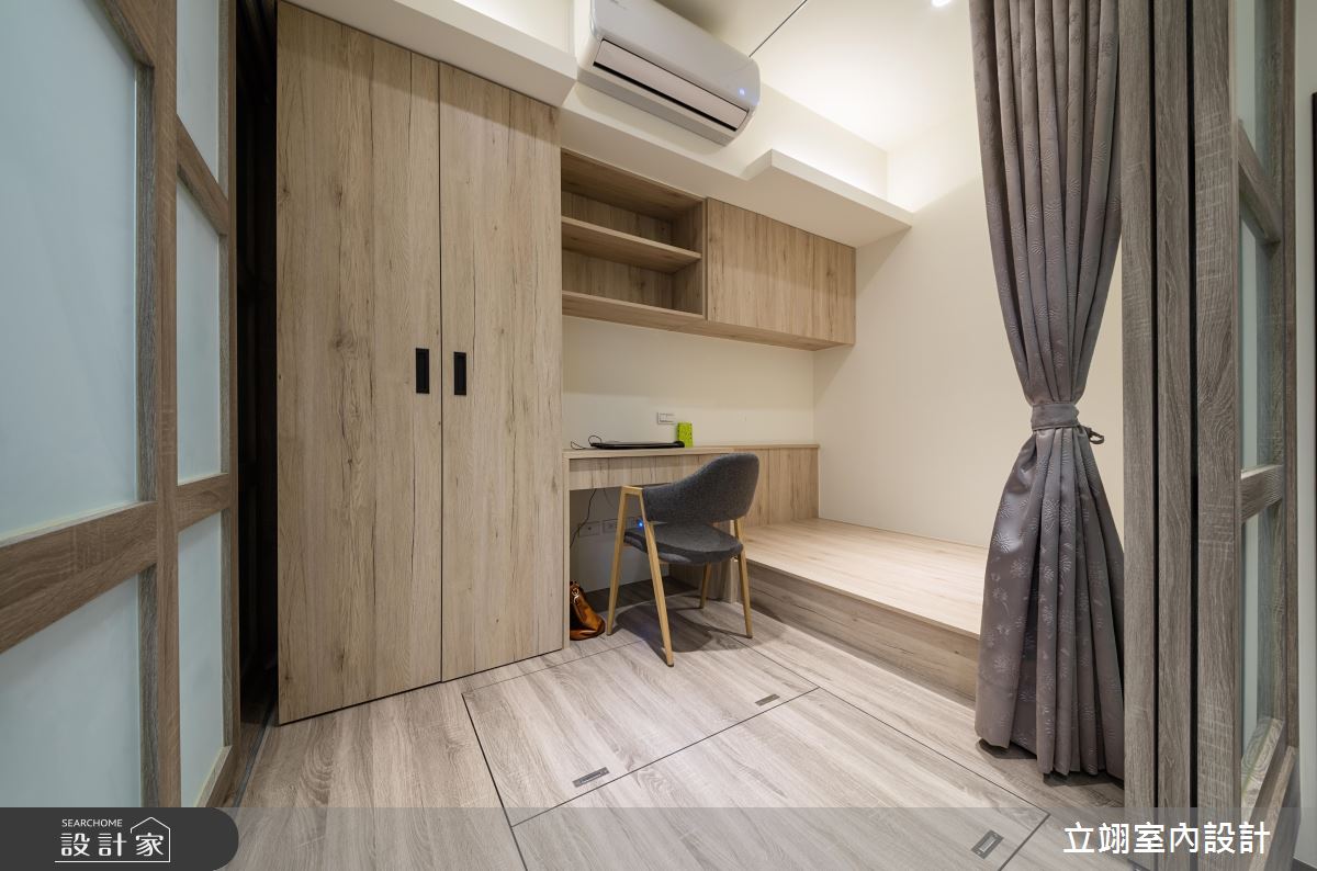書房兼多功能室的木作地坪結合五金扣環,加強收納機能,可將棉被、枕頭等寢具收整其中,滿足生活實用所需。