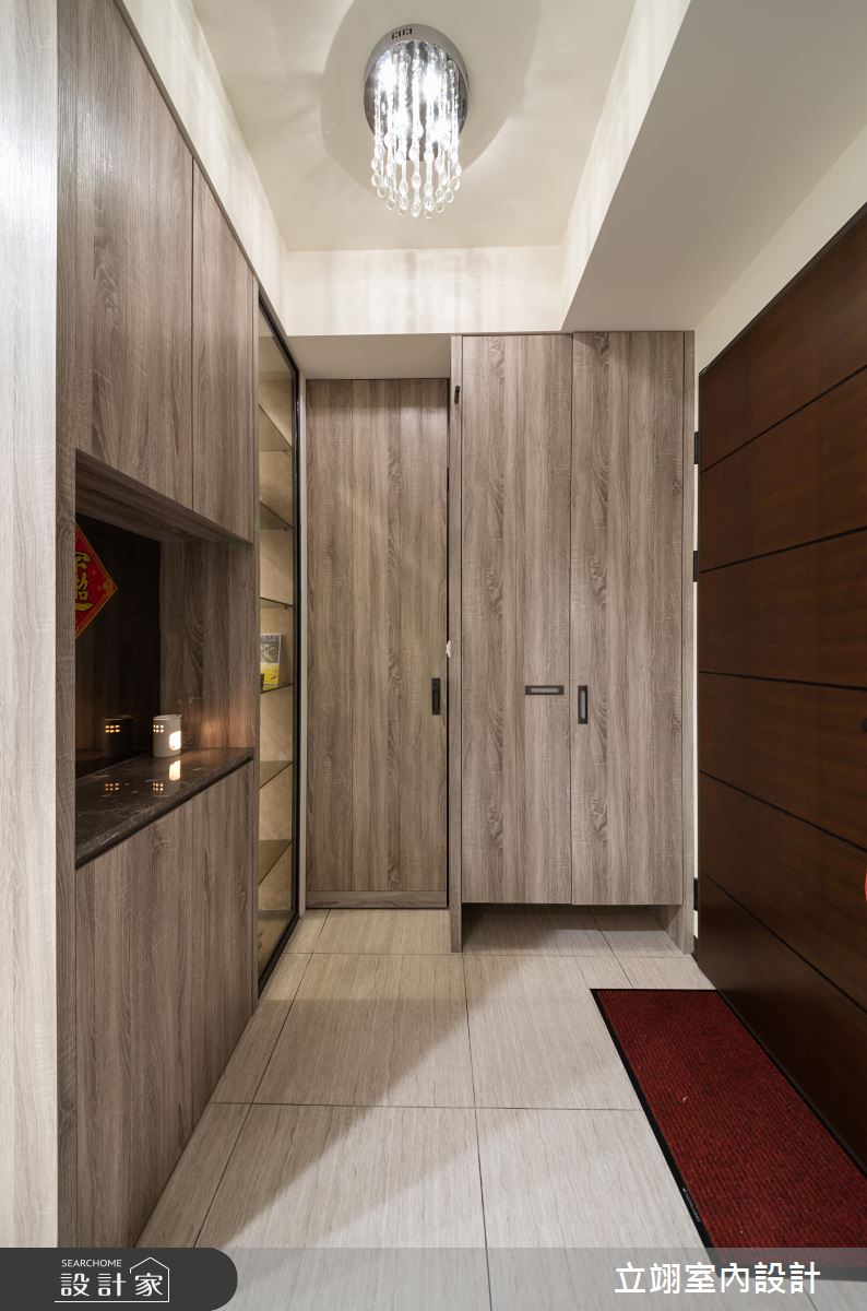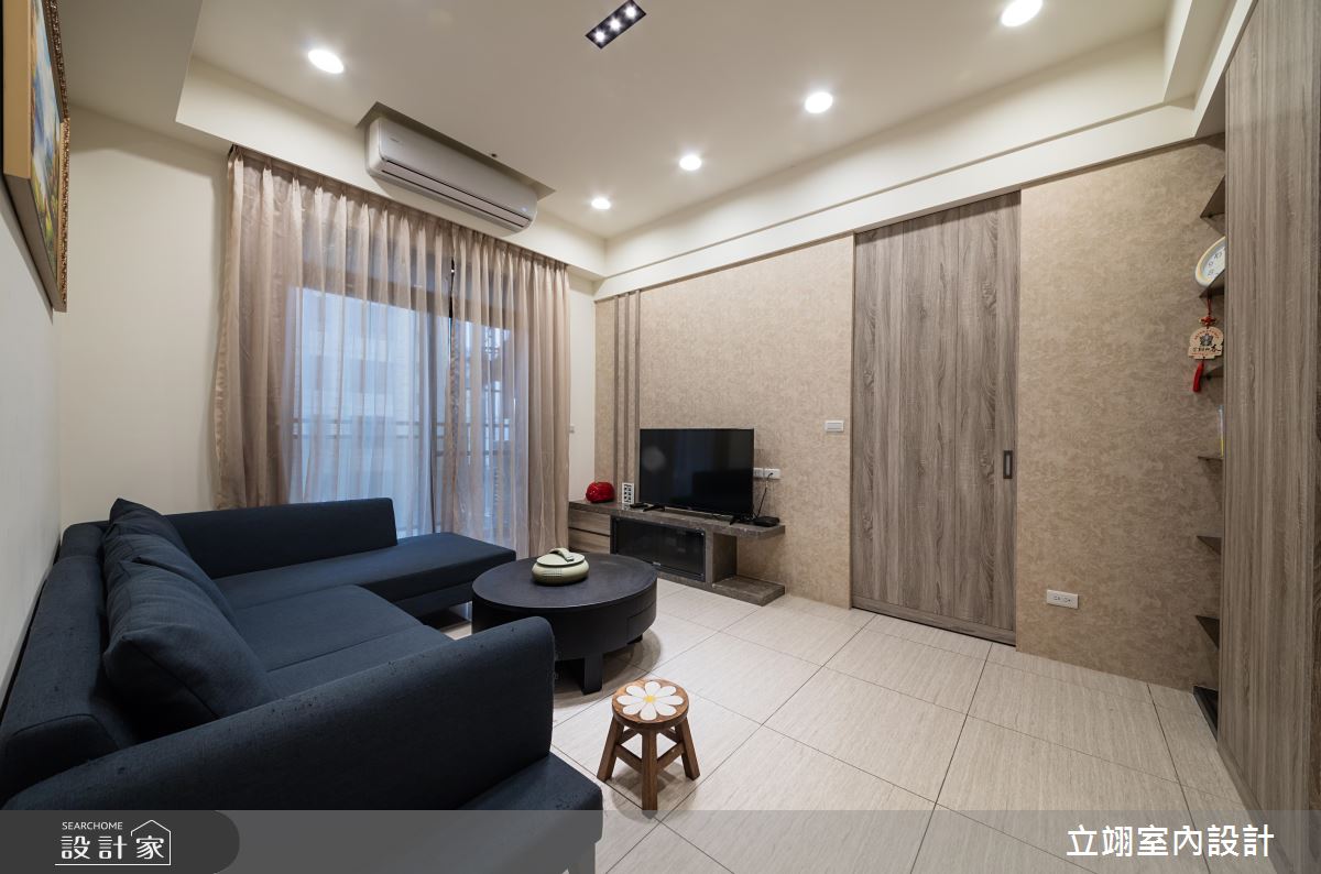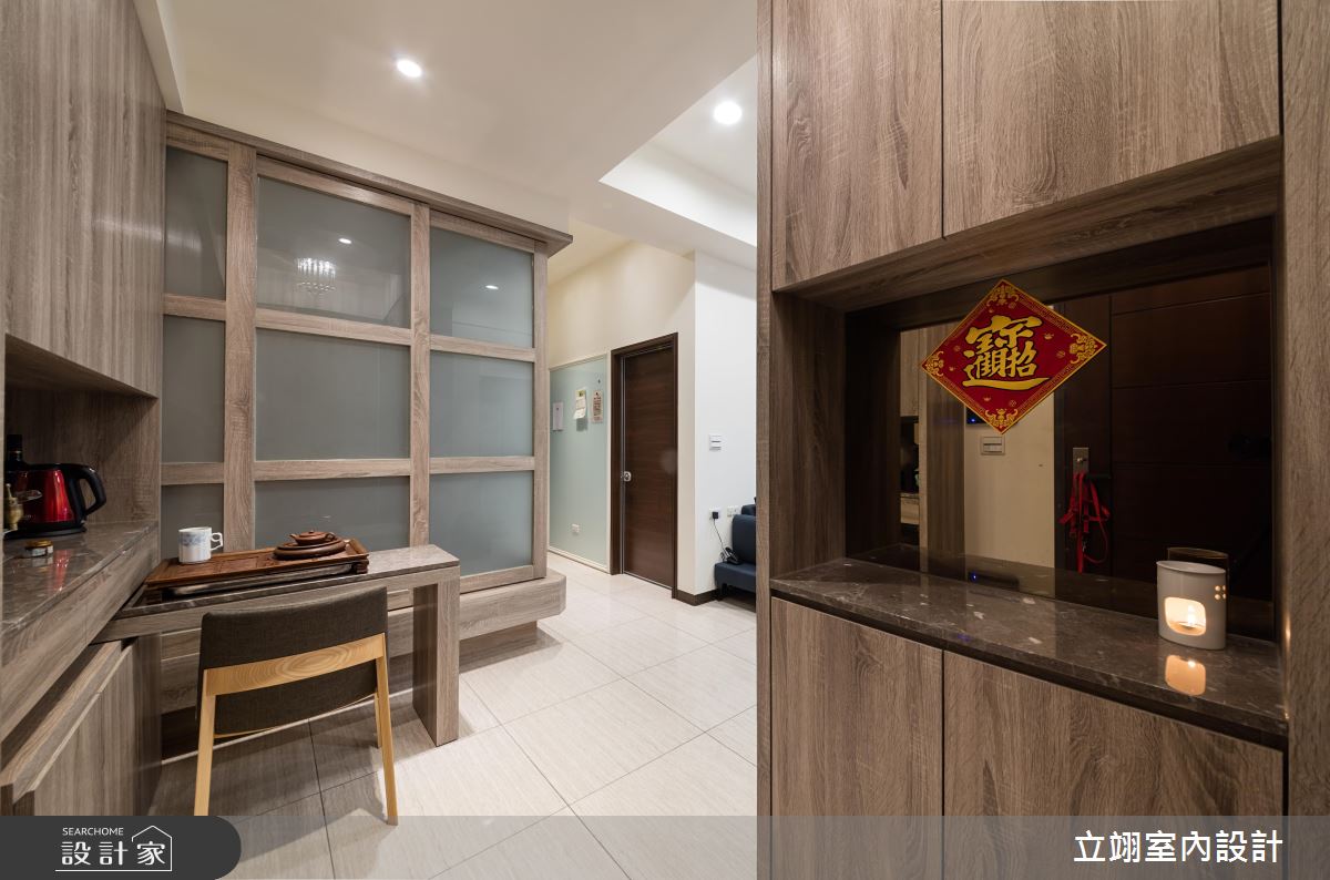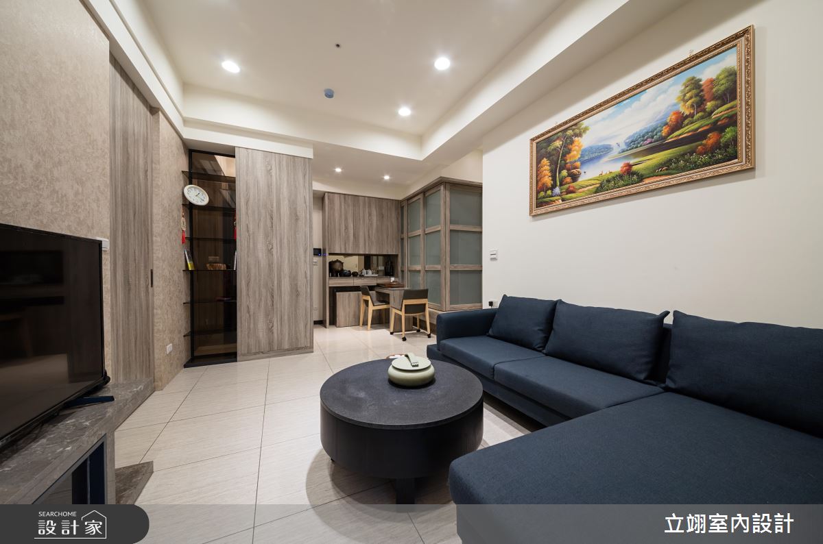 旋開大門走進玄關,沿著天花板的大樑結構,構築滿滿的收納櫃體,側邊飾以木紋肌理的鞋櫃成為風格序曲,正面的展示收納櫃隨著屋主物件的展示,創造出豐富的室內表情,天花板搭佐一展華美的水晶吊燈,替樸實無華的空間挹注奢華新穎之感;進入公領域的左側收納櫃體,從腰部延伸出一道桌面,成為平時與家人泡茶、聊天的小天地,一體卻多功能設計的系統櫃,滿足生活所需,多way的櫃體設計讓空間運用更顯彈性;此外,轉角空間還利用架高木地板,兩側的玻璃拉門圍塑出書房間多功能室,門扇可隨屋主需求,來開啟或關閉門扇;將大量的空間留給客廳,簡約的壁面線條勾勒出寬敞視野,大地色系的電視牆呼應整體風格,沙發背牆則擺設一幅藝術畫作,與深藍色系的質感沙發相互調和,增添人文優雅氣息。
