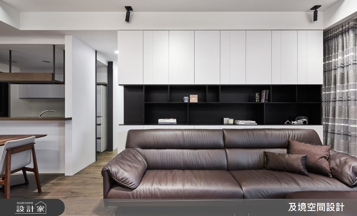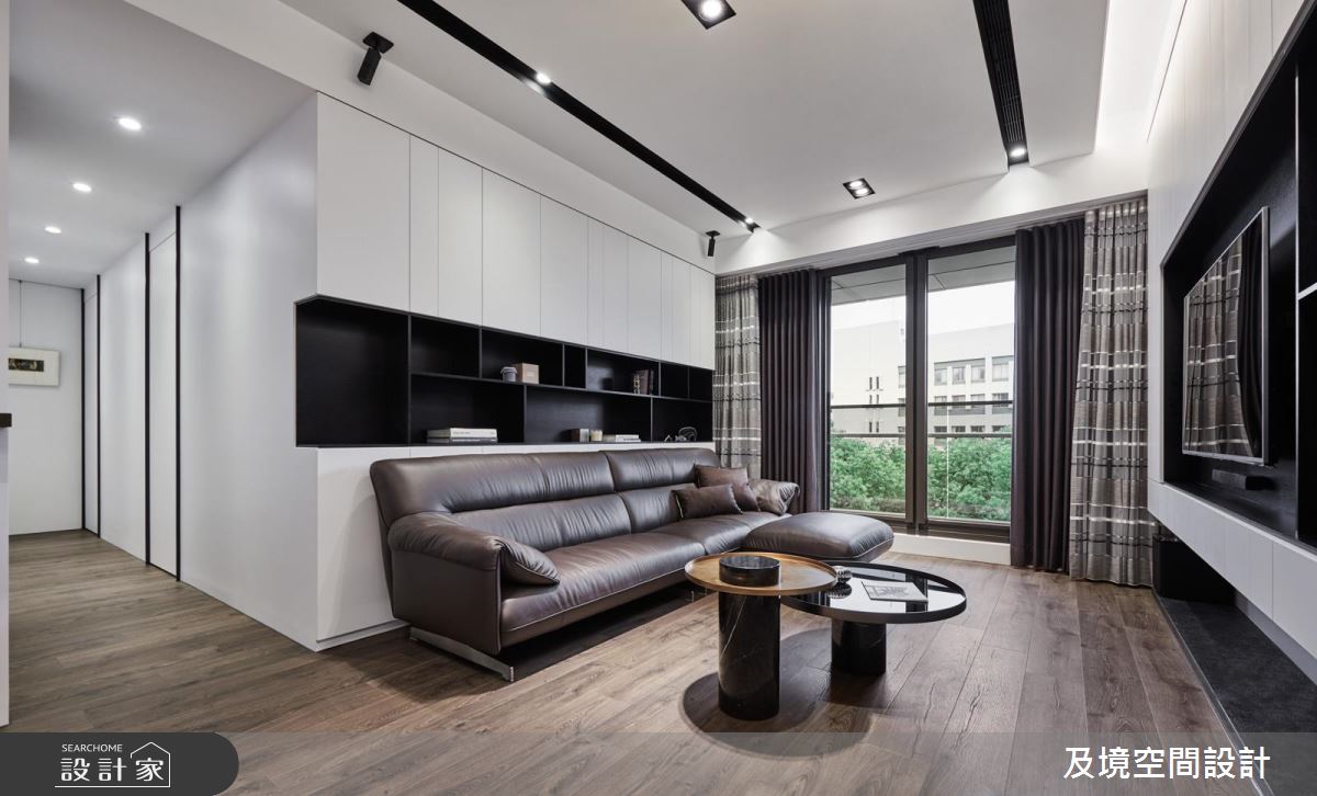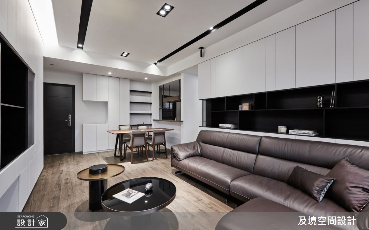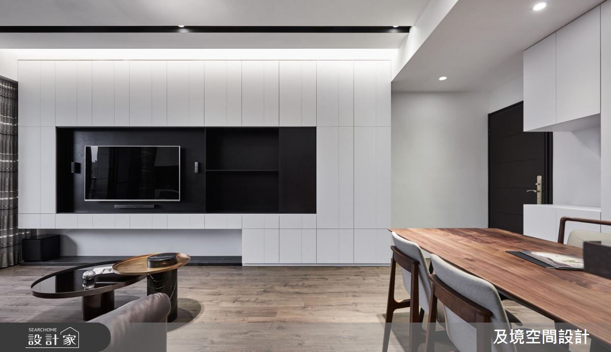居宅加入大量的白色鋪陳底調,讓空間感顯得輕盈無壓,再用內斂黑色勾勒立體架構,搭配沉穩的木地板鋪陳,替冷調氛圍挹注溫煦氣息,一旁落地窗則導入美好自然光,使室內頓時展現明亮氣氛,而電視牆更加入展示空間,與沙發背牆形成對應,建構現代風的流暢語彙;開放式的用餐場域,以溫和木桌作為主視覺,搭配備餐檯提高使用的靈活度,同時在周邊給予白色櫃體安排,映襯出清爽而富有機能感的使用情境;寢臥內,延續俐落的線條與色彩,展示出簡約的生活味道,再搭佐木質鋪陳並嵌入間接光源,讓床頭成為一幅美好畫面!