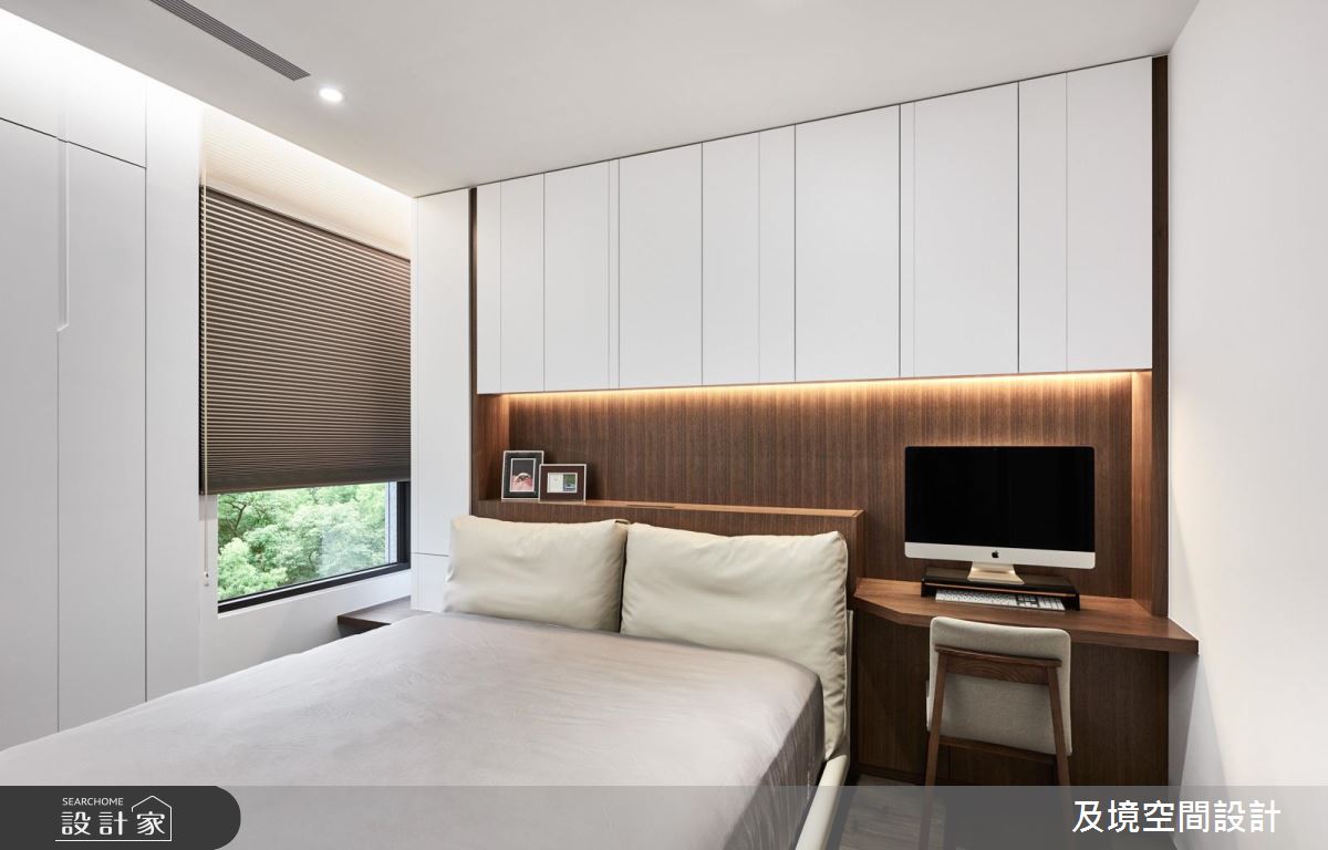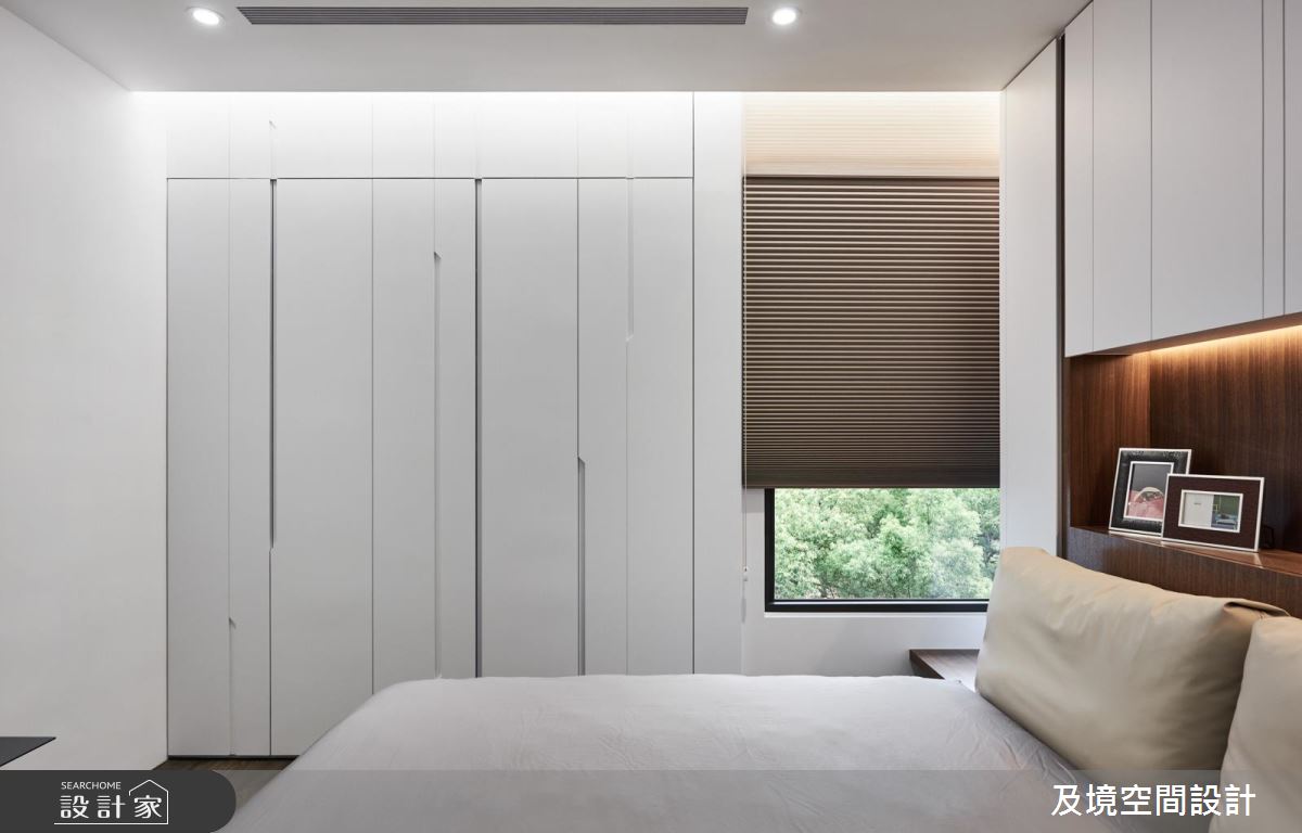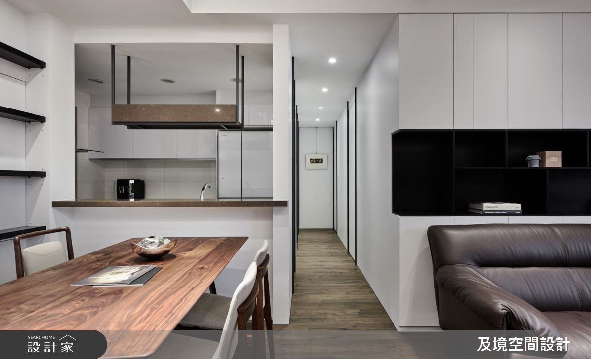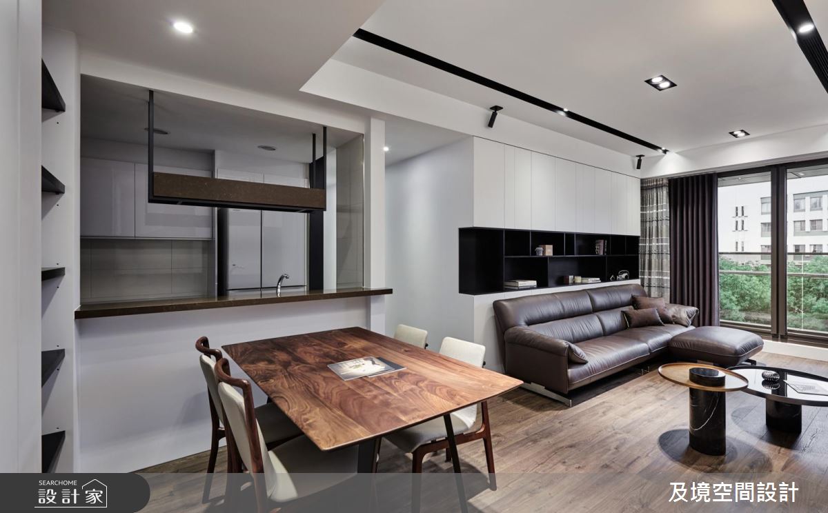 居宅加入大量的白色鋪陳底調,讓空間感顯得輕盈無壓,再用內斂黑色勾勒立體架構,搭配沉穩的木地板鋪陳,替冷調氛圍挹注溫煦氣息,一旁落地窗則導入美好自然光,使室內頓時展現明亮氣氛,而電視牆更加入展示空間,與沙發背牆形成對應,建構現代風的流暢語彙;開放式的用餐場域,以溫和木桌作為主視覺,搭配備餐檯提高使用的靈活度,同時在周邊給予白色櫃體安排,映襯出清爽而富有機能感的使用情境;寢臥內,延續俐落的線條與色彩,展示出簡約的生活味道,再搭佐木質鋪陳並嵌入間接光源,讓床頭成為一幅美好畫面!