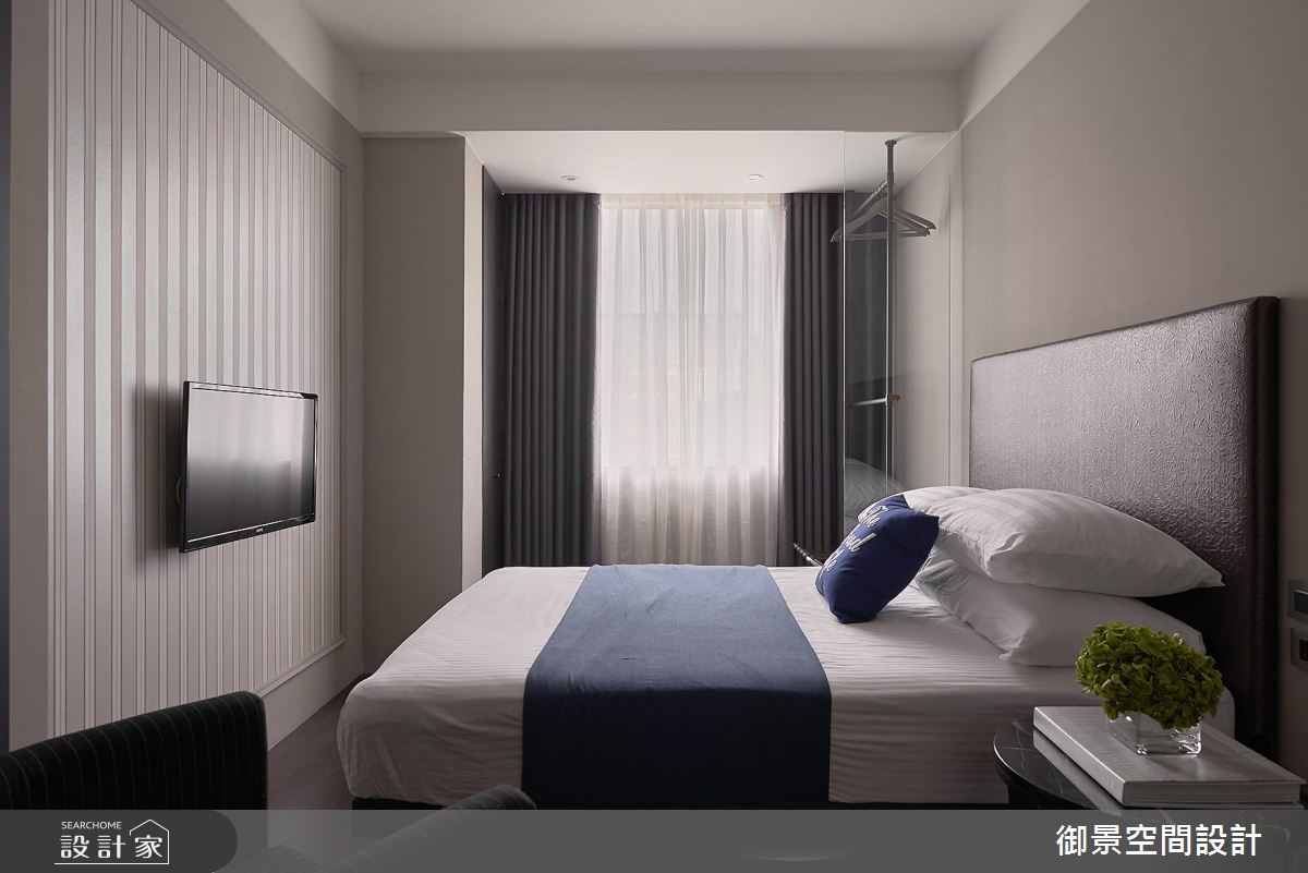 每個房間皆應用大面積方格玻璃,援引大量光源,又能保持空間內的距離與隱私。其中最具特色的一房,壁面採用木板條設計,搭配皮製釘扣沙發與行李箱矮桌,讓整體空間暈染上一層復古不失時髦的氣息,石紋地板則增添了自然風味。另外更有以美式飯店風格為主的房間,低彩度色系配上條紋壁紙,彰顯了成熟簡約的風格。採乾溼分離的衛浴設計,俐落且不顯過度剛硬,刻意模糊與房間內部的界線,使整體視覺更為通透。